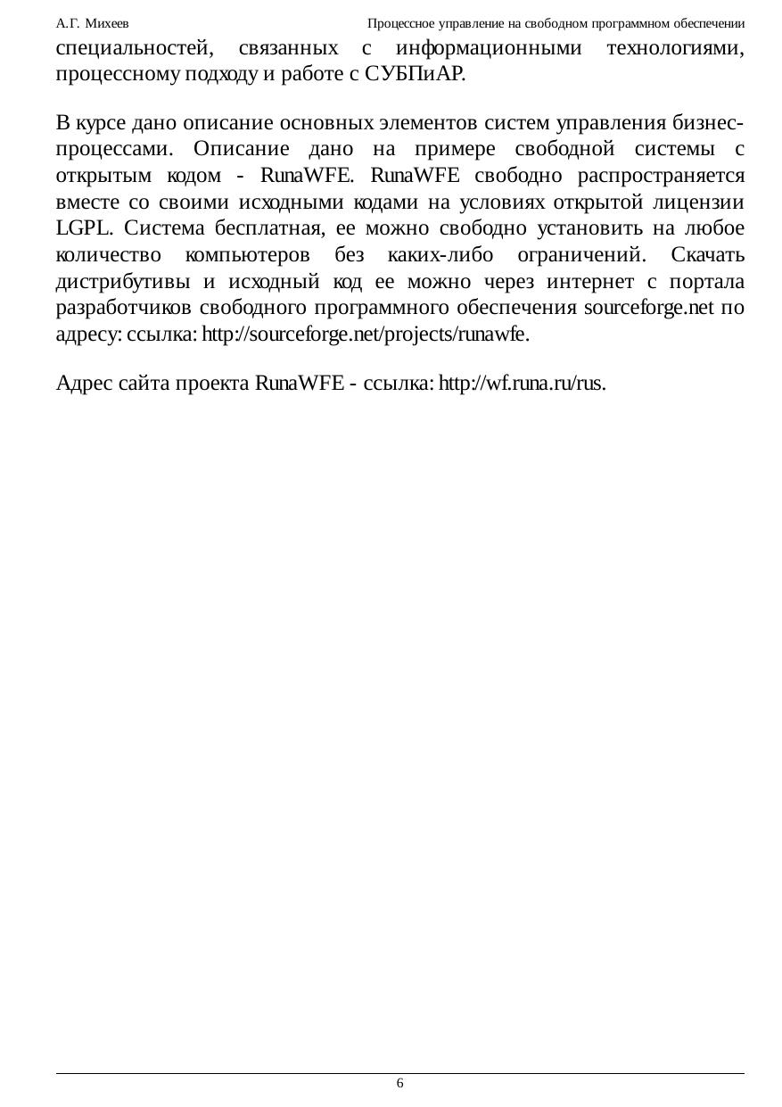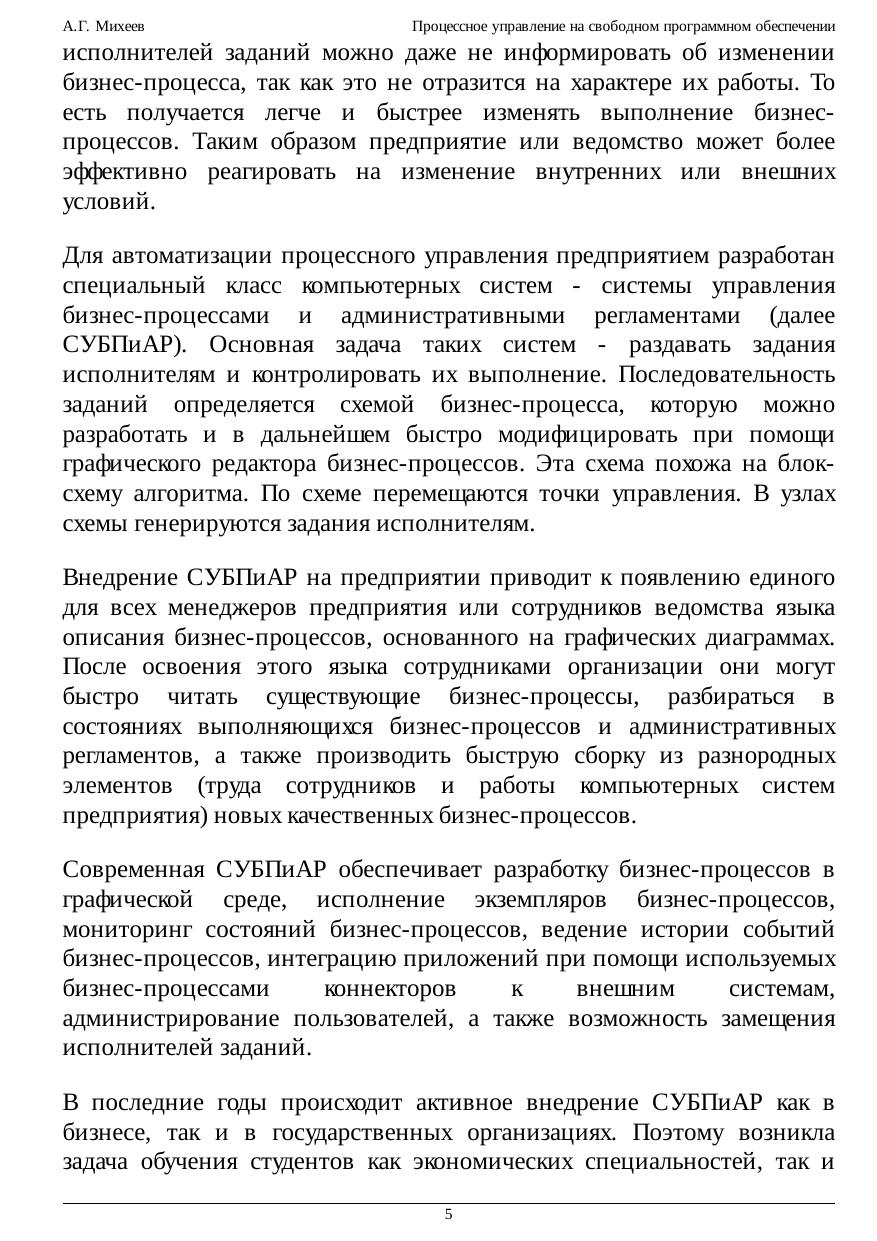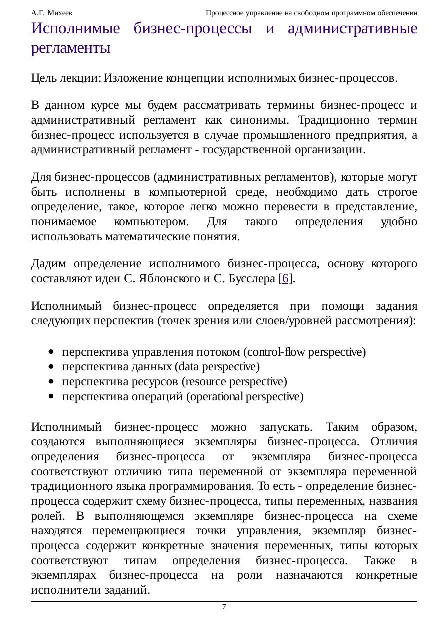 Рассмотрены четыре перспективы исполнимых бизнес-процессов. Дано описание основных элементов систем управления административными и бизнес-процессами. Показано, как разрабатывать и исполнять бизнес-процессы. Описание работы с системой управления бизнес-процессами и административными регламентами производится на примере свободного ПО с открытым кодом RunaWFE. Приведен порядок выполнения практических занятий.