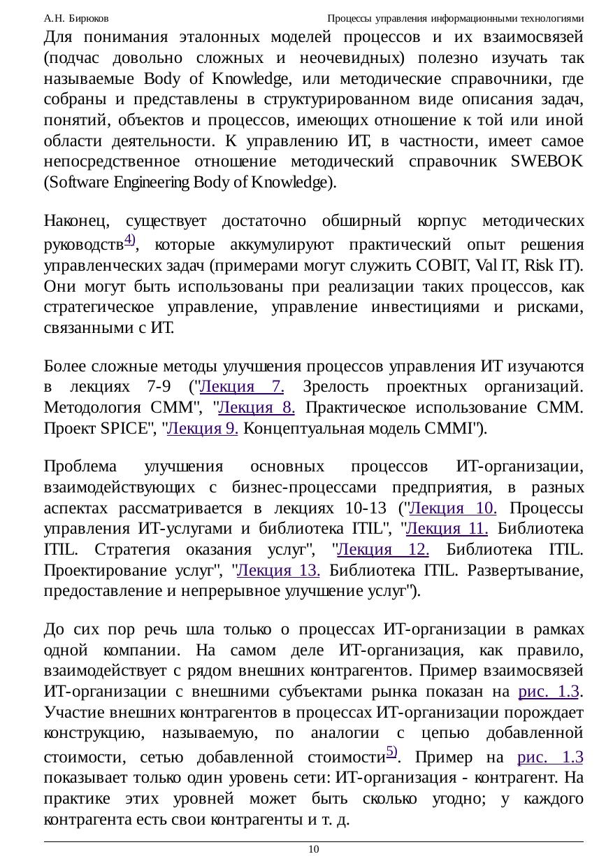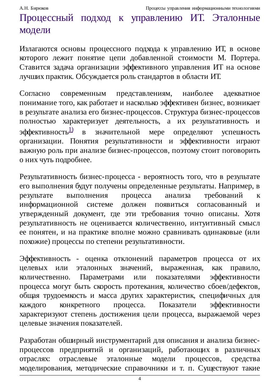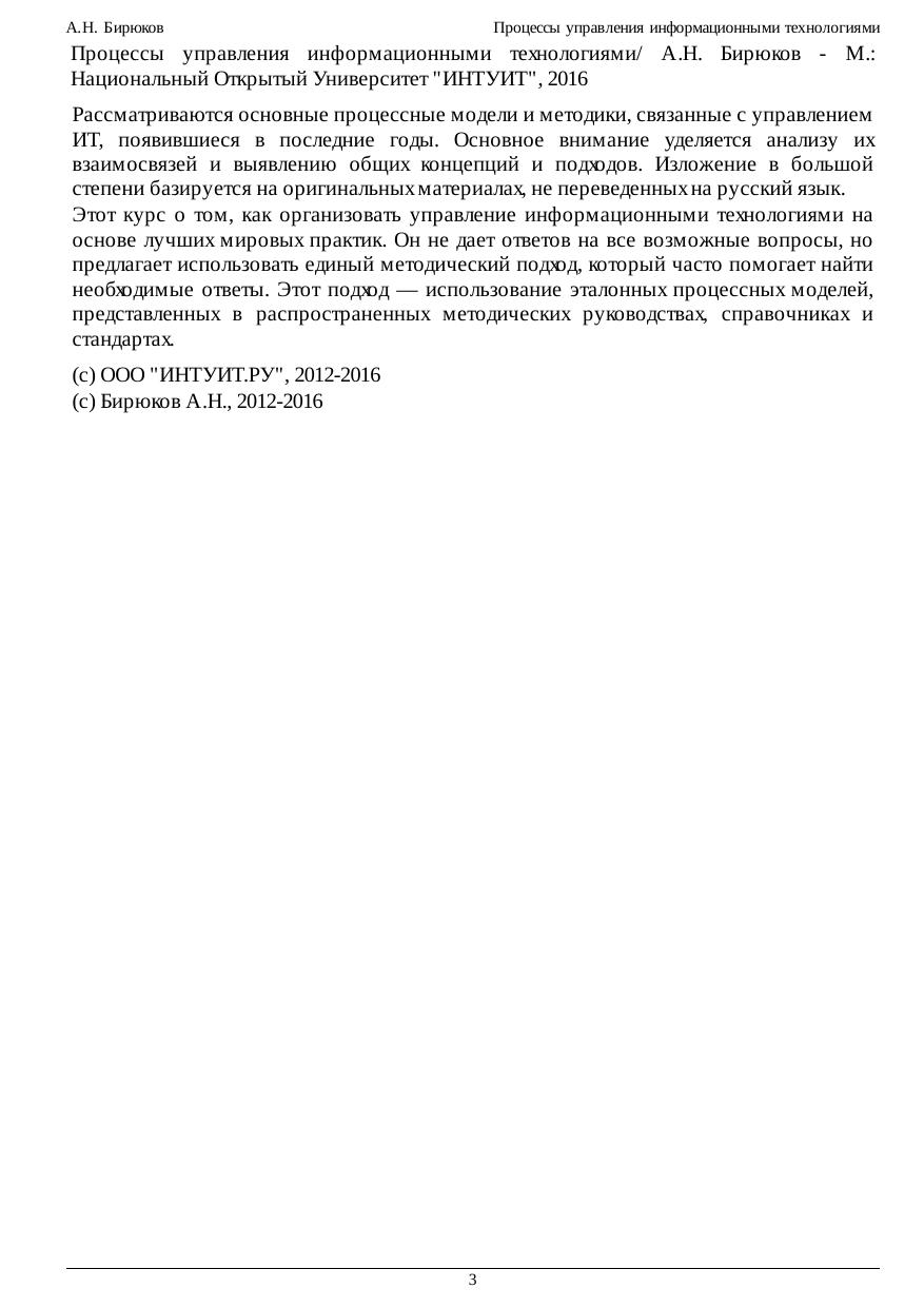 Рассматриваются основные процессные модели и методики, связанные с управлением ИТ, появившиеся в последние годы. Основное внимание уделяется анализу их взаимосвязей и выявлению общих концепций и подходов. Изложение в большой степени базируется на оригинальных материалах, не переведенных на русский язык. Этот курс о том, как организовать управление информационными технологиями на основе лучших мировых практик. Он не дает ответов на все возможные вопросы, но предлагает использовать единый методический подход, который часто помогает найти необходимые ответы. Этот подход — использование эталонных процессных моделей, представленных в распространенных методических руководствах, справочниках и стандартах.