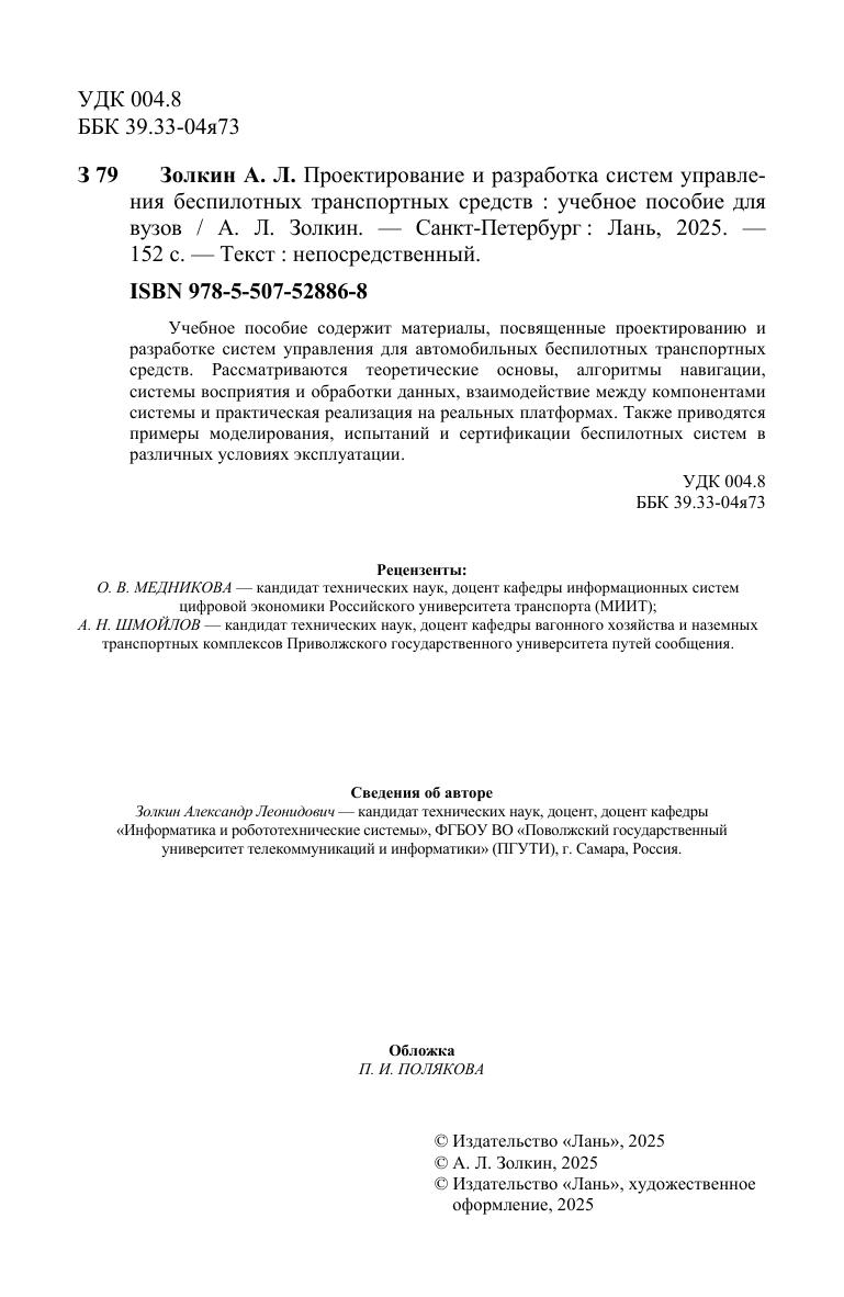 Учебное пособие содержит материалы, посвященные проектированию и разработке систем управления для автомобильных беспилотных транспортных средств. Рассматриваются теоретические основы, алгоритмы навигации, системы восприятия и обработки данных, взаимодействие между компонентами системы и практическая реализация на реальных платформах. Также приводятся примеры моделирования, испытаний и сертификации беспилотных систем в различных условиях эксплуатации.
