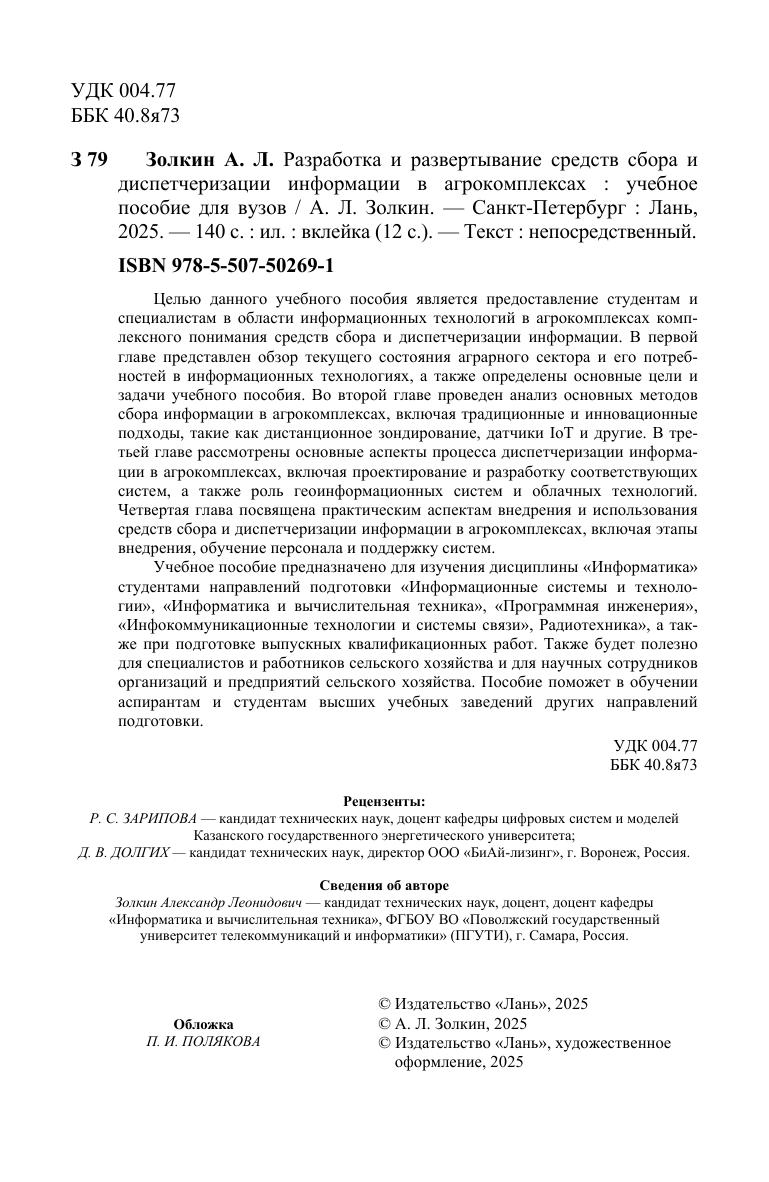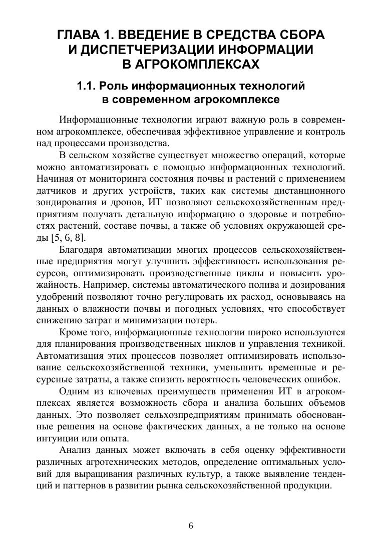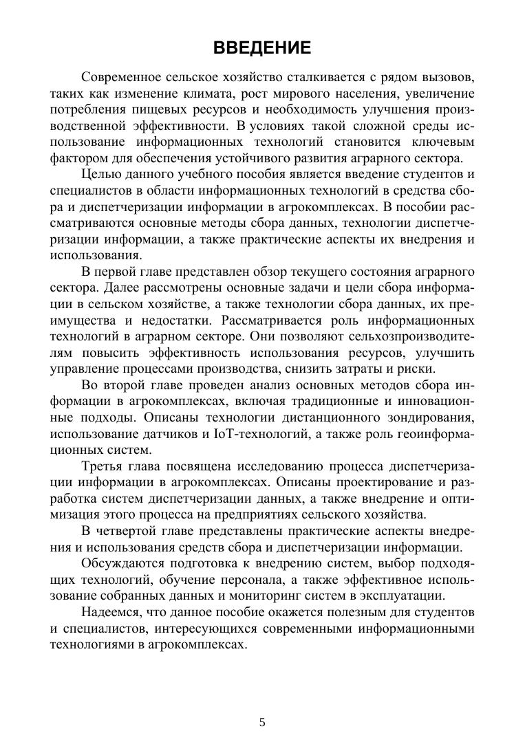 Целью данного учебного пособия является предоставление студентам и специалистам в области информационных технологий в агрокомплексах комплексного понимания средств сбора и диспетчеризации информации. В первой главе представлен обзор текущего состояния аграрного сектора и его потребностей в информационных технологиях, а также определены основные цели и задачи учебного пособия. Во второй главе проведен анализ основных методов сбора информации в агрокомплексах, включая традиционные и инновационные подходы, такие как дистанционное зондирование, датчики IoT и другие. В третьей главе рассмотрены основные аспекты процесса диспетчеризации информации в агрокомплексах, включая проектирование и разработку соответствующих систем, а также роль геоинформационных систем и облачных технологий. Четвертая глава посвящена практическим аспектам внедрения и использования средств сбора и диспетчеризации информации в агрокомплексах, включая этапы внедрения, обучение персонала и поддержку систем. Учебное пособие предназначено для изучения дисциплины «Информатика» студентами направлений подготовки «Информационные системы и технологии», «Информатика и вычислительная техника», «Программная инженерия», «Инфокоммуникационные технологии и системы связи», Радиотехника», а также при подготовке выпускных квалификационных работ. Также будет полезно для специалистов и работников сельского хозяйства и для научных сотрудников организаций и предприятий сельского хозяйства. Пособие поможет в обучении аспирантам и студентам высших учебных заведений других направлений подготовки.