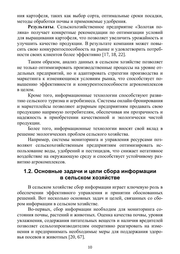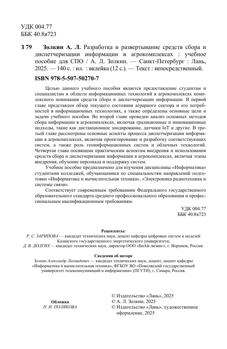 Целью данного учебного пособия является предоставление студентам и специалистам в области информационных технологий в агрокомплексах комплексного понимания средств сбора и диспетчеризации информации. В первой главе представлен обзор текущего состояния аграрного сектора и его потребностей в информационных технологиях, а также определены основные цели и задачи учебного пособия. Во второй главе проведен анализ основных методов сбора информации в агрокомплексах, включая традиционные и инновационные подходы, такие как дистанционное зондирование, датчики IoT и другие. В третьей главе рассмотрены основные аспекты процесса диспетчеризации информации в агрокомплексах, включая проектирование и разработку соответствующих систем, а также роль геоинформационных систем и облачных технологий. Четвертая глава посвящена практическим аспектам внедрения и использования средств сбора и диспетчеризации информации в агрокомплексах, включая этапы внедрения, обучение персонала и поддержку систем. Учебное пособие предназначено для изучения дисциплины «Информатика» студентами колледжей, обучающимися по специальностям направлений подготовки «Информатика и вычислительная техника», «Электроника радиотехника и системы связи». Соответствует современным требованиям Федерального государственного образовательного стандарта среднего профессионального образования и профессиональным квалификационным требованиям.