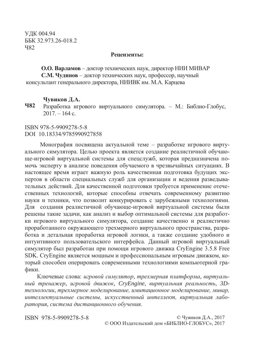 Монография посвящена актуальной теме – разработке игрового виртуального симулятора. Целью проекта является создание реалистичной обучающе-игровой виртуальной системы для спецслужб, которая предназначена помочь эксперту в анализе поведения обучаемого в чрезвычайных ситуациях. В настоящее время играет важную роль качественная подготовка будущих экспертов в области специальных служб для организации и ведения разведывательных действий. Для качественной подготовки требуется применение отечественных технологий, которые способны отвечать современному развитию науки и техники, что позволит конкурировать с зарубежными технологиями. Для создания реалистичной обучающе-игровой виртуальной системы были решены такие задачи, как анализ и выбор оптимальной системы для разработки игрового виртуального симулятора, создание качественно и реалистично проработанного окружающего трехмерного виртуального пространства, разработка и детальная проработка игровой логики, а также создание удобного и интуитивного пользовательского интерфейса. Данный игровой виртуальный симулятор был разработан при помощи игрового движка CryEngine 3.5.8 Free SDK. CryEngine является мощным и профессиональным игровым движком, который способен оперировать современными технологиями компьютерной графики.