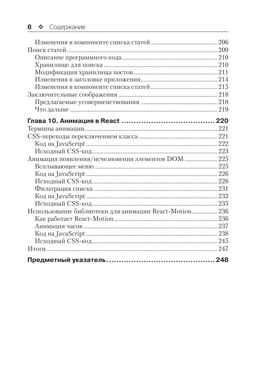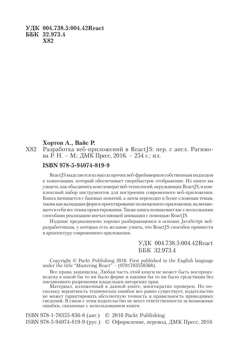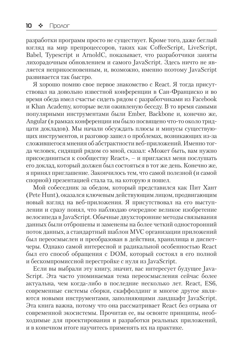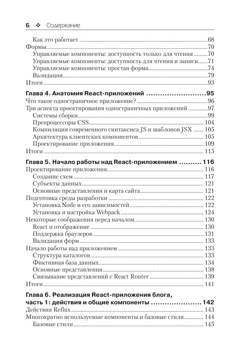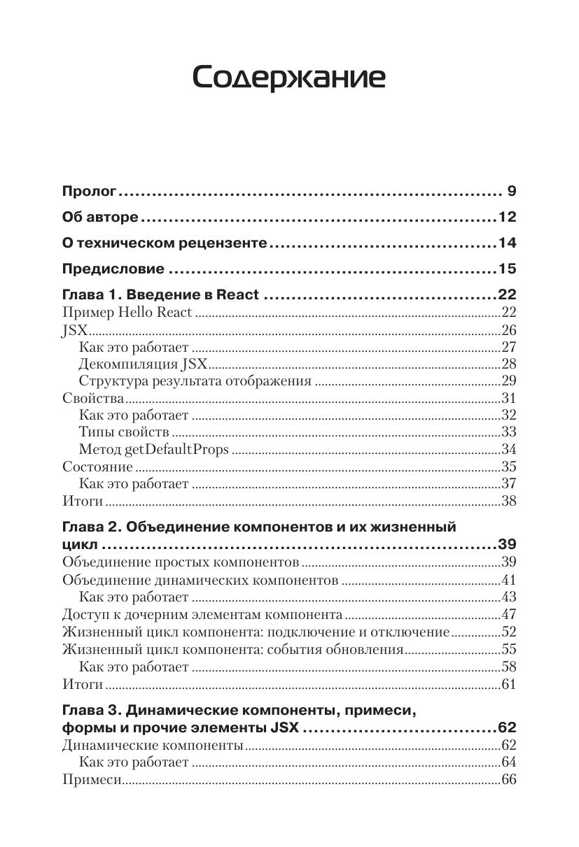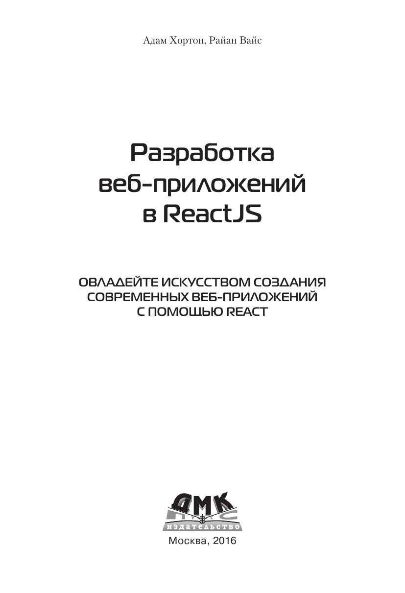 ReactJS выделяется из массы прочих веб-фреймворков собственным подходом к композиции, который обеспечивает сверхбыстрое отображение. Из книги вы узнаете, как объединить конгломерат веб-технологий, окружающих ReactJS, в комплексный набор инструментов для построения современного веб-приложения. Книга начинается с базовых понятий, а затем переходит к более сложным темам, таким как валидация форм и проектирование полноценного приложения, включающего в себя все этапы проектирования. Также книга познакомит вас с несколькими способами реализации впечатляющей анимации с помощью ReactJS. Издание предназначено хорошо разбирающимся в основах JavaScript веб-разработчикам, у которых есть желание узнать, что ReactJS способен привнести в архитектуру современного приложения.