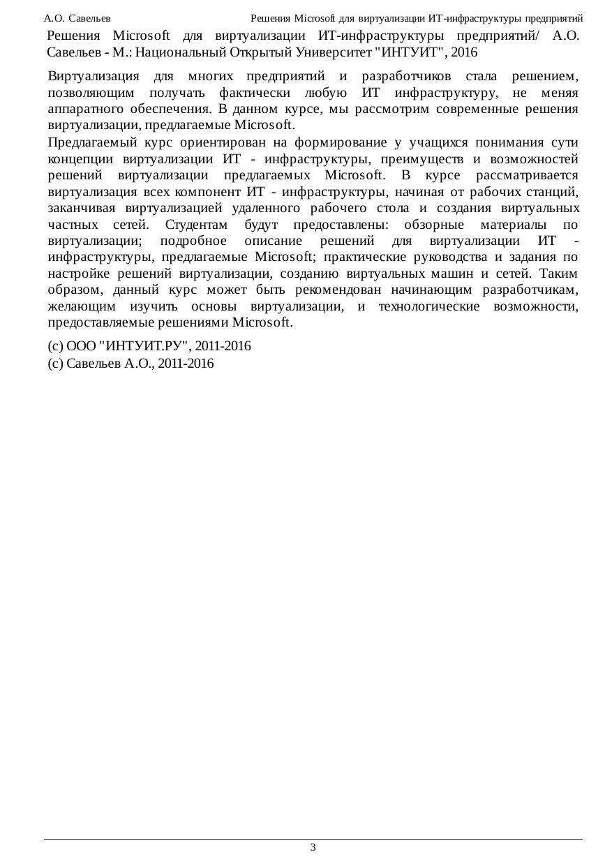 Виртуализация для многих предприятий и разработчиков стала решением, позволяющим получать фактически любую ИТ инфраструктуру, не меняя аппаратного обеспечения. В данном курсе, мы рассмотрим современные решения виртуализации, предлагаемые Microsoft. Предлагаемый курс ориентирован на формирование у учащихся понимания сути концепции виртуализации ИТ - инфраструктуры, преимуществ и возможностей решений виртуализации предлагаемых Microsoft. В курсе рассматривается виртуализация всех компонент ИТ - инфраструктуры, начиная от рабочих станций, заканчивая виртуализацией удаленного рабочего стола и создания виртуальных частных сетей. Студентам будут предоставлены: обзорные материалы по виртуализации; подробное описание решений для виртуализации ИТ - инфраструктуры, предлагаемые Microsoft; практические руководства и задания по настройке решений виртуализации, созданию виртуальных машин и сетей. Таким образом, данный курс может быть рекомендован начинающим разработчикам, желающим изучить основы виртуализации, и технологические возможности, предоставляемые решениями Microsoft.
