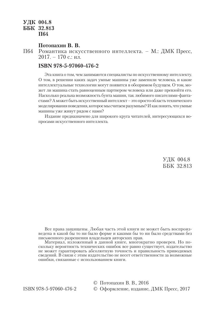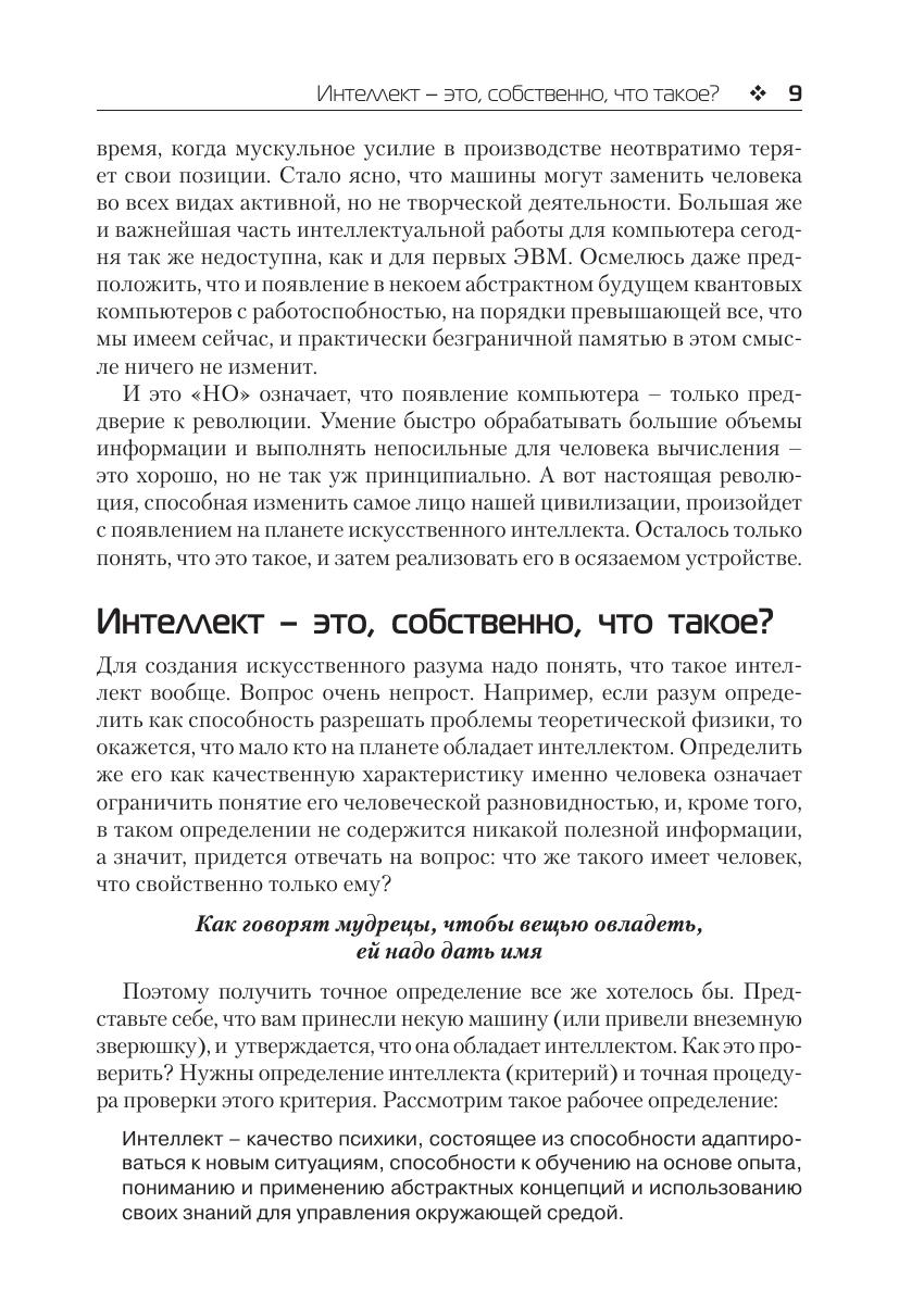 Эта книга о том, чем занимаются специалисты по искусственному интеллекту. О том, в решении каких задач умные машины уже заменили человека, и какие интеллектуальные технологии могут появится в обозримом будущем. О том, может ли машина стать равноценным партнером человека или даже превзойти его. Насколько реальна возможность бунта машин, так любимого писателями-фантастами? А может быть искусственный интеллект – это просто область технического моделирования поведения, которое мы считаем разумным? И как понять, что умные машины уже живут рядом с нами? Издание предназначено для широкого круга читателей, интересующихся вопросами искусственного интеллекта.