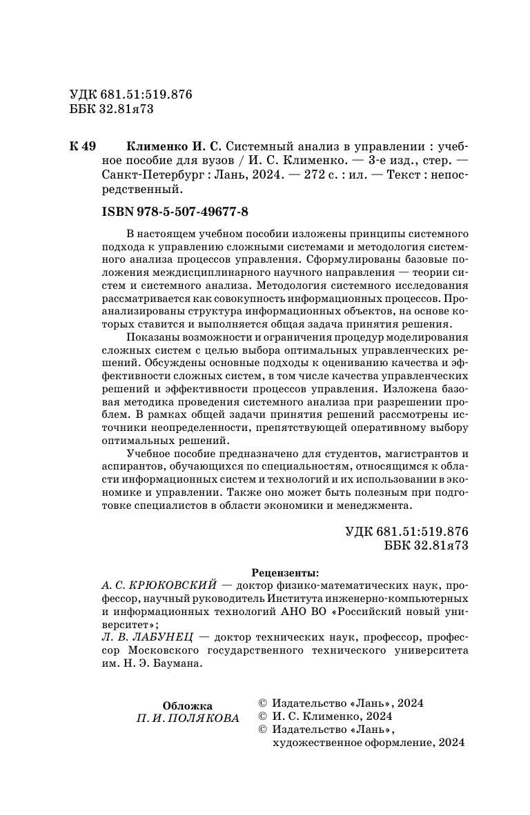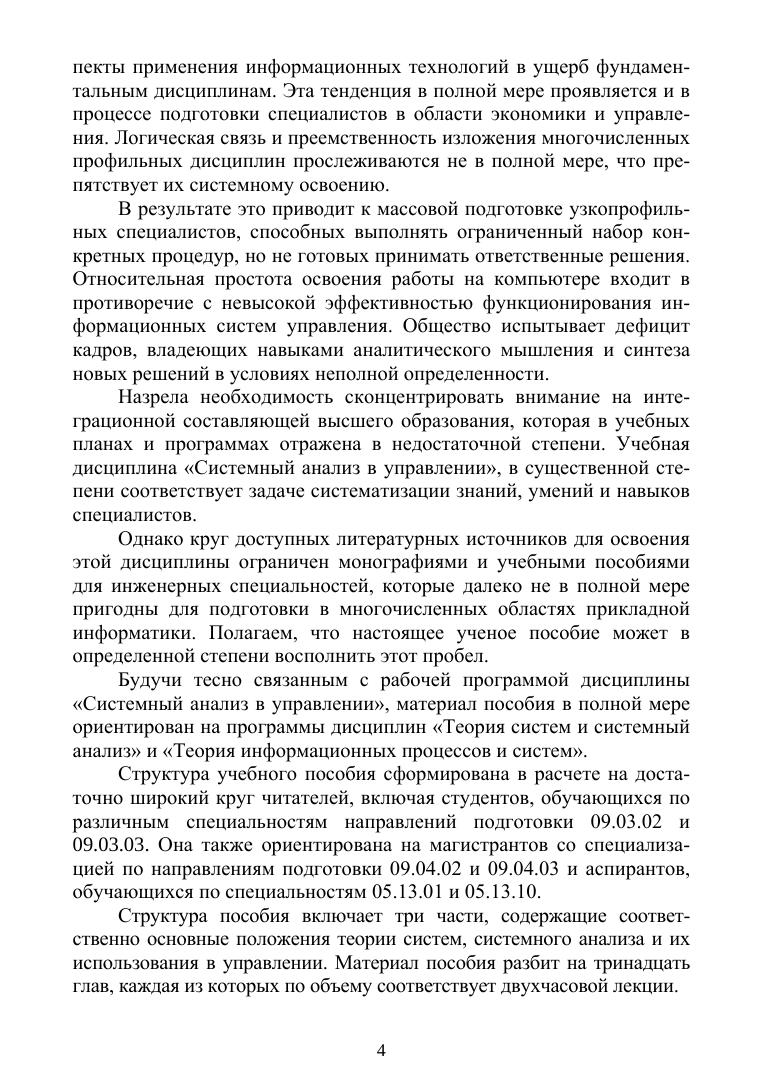 В настоящем учебном пособии изложены принципы системного подхода к управлению сложными систем и методология системного анализа процессов управления. Сформулированы базовые положения междисциплинарного научного направления— теории систем и системного анализа. Методология системного исследования рассматривается как совокупность информационных процессов. Проанализированы структура информационных объектов, на основе которых ставится и выполняется общая задача принятия решения.Показаны возможности и ограничения процедур моделирования сложных систем с целью выбора оптимальных управленческих решений. Обсуждены основные подходы к оцениванию качества и эффективности сложных систем, в том числе качества управленческих решений и эффективности процессов управления. Изложена базовая методика проведения системного анализа при разрешении проблем. В рамках общей задачи принятия решений рассмотрены источники неопределенности, препятствующей оперативному выбору оптимальных решений.Учебное пособие предназначено для студентов, магистрантов и аспирантов, обучающихся по специальностям, относящимся к области информационных систем и технологий и их использовании в экономике и управлении. Также оно может быть полезным при подготовке специалистов в области экономики и менеджмента.