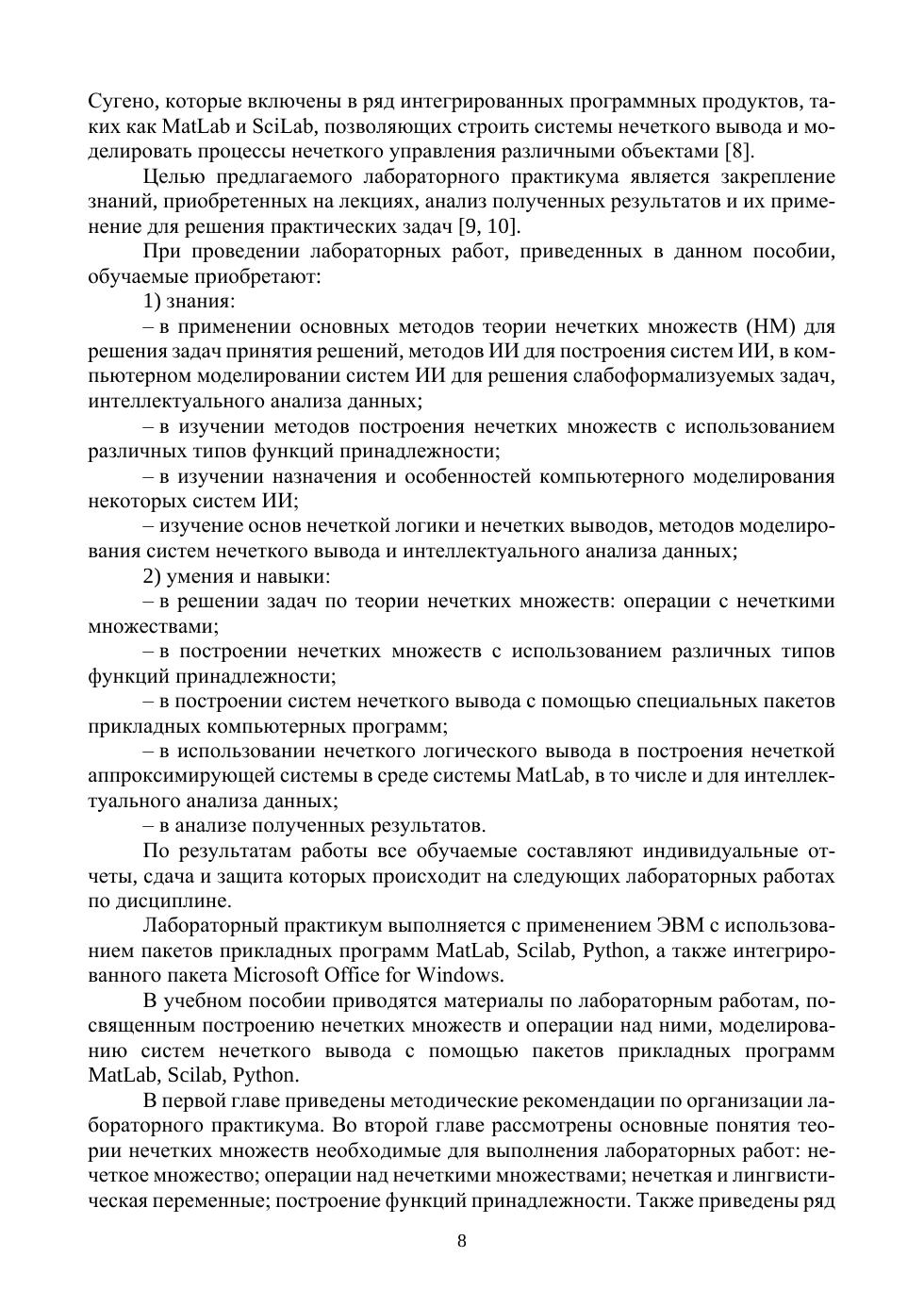 В учебном пособии даны основные теоретические положения искусственного интеллекта и теории нечетких множеств, необходимые для выполнения лабораторных работ по дисциплинам, связанным с изучением систем искусственного интеллекта и интеллектуального анализа данных. Приведены примеры решения задач, контрольные задания, а также содержание, общие требования и рекомендации по выполнению лабораторных работ, справочные данные и литература для их выполнения. В учебное пособие включены материалы по лабораторным работам, посвященным построению функций принадлежности нечетких множеств и моделированию систем нечеткого вывода в различных программных продуктах: Scilab, Python, MatLab. Показан подход к интеллектуальному анализу данных, основанный на использовании нечеткого логического вывода и в построения нечеткой аппроксимирующей системы в среде системы MatLab. Учебное пособие предназначено для студентов всех форм обучения и всех специальностей высших учебных заведений, изучающих искусственный интеллект, а также для специалистов в области искусственного интеллекта и интеллектуального анализа данных.