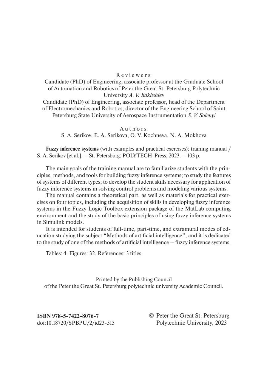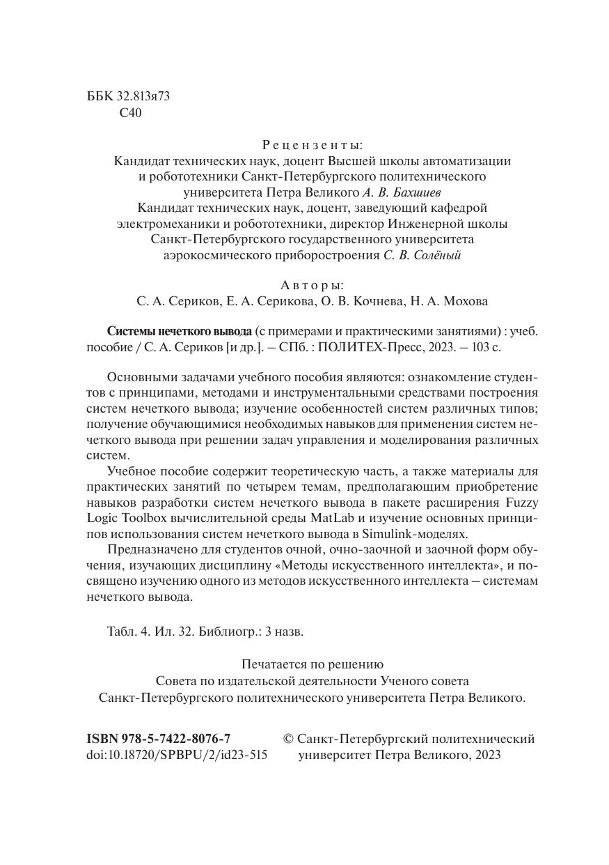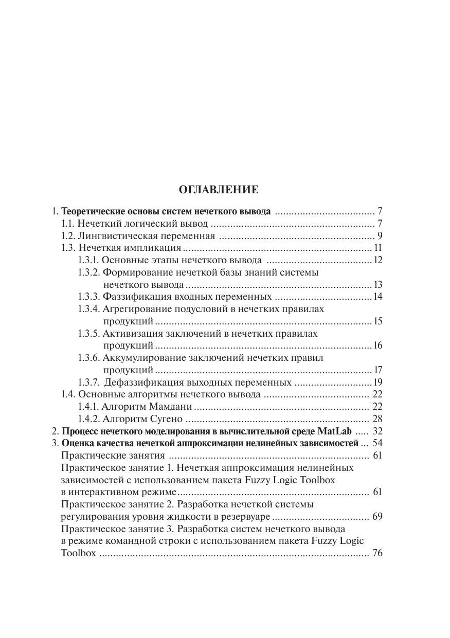 Основными задачами учебного пособия являются: ознакомление студентов с принципами, методами и инструментальными средствами построения систем нечеткого вывода; изучение особенностей систем различных типов; получение обучающимися необходимых навыков для применения систем не- четкого вывода при решении задач управления и моделирования различных систем. Учебное пособие содержит теоретическую часть, а также материалы для практических занятий по четырем темам, предполагающим приобретение навыков разработки систем нечеткого вывода в пакете расширения Fuzzy Logic Toolbox вычислительной среды MatLab и изучение основных принципов использования систем нечеткого вывода в Simulink-моделях. Предназначено для студентов очной, очно-заочной и заочной форм обучения, изучающих дисциплину «Методы искусственного интеллекта», и посвящено изучению одного из методов искусственного интеллекта – системам нечеткого вывода.