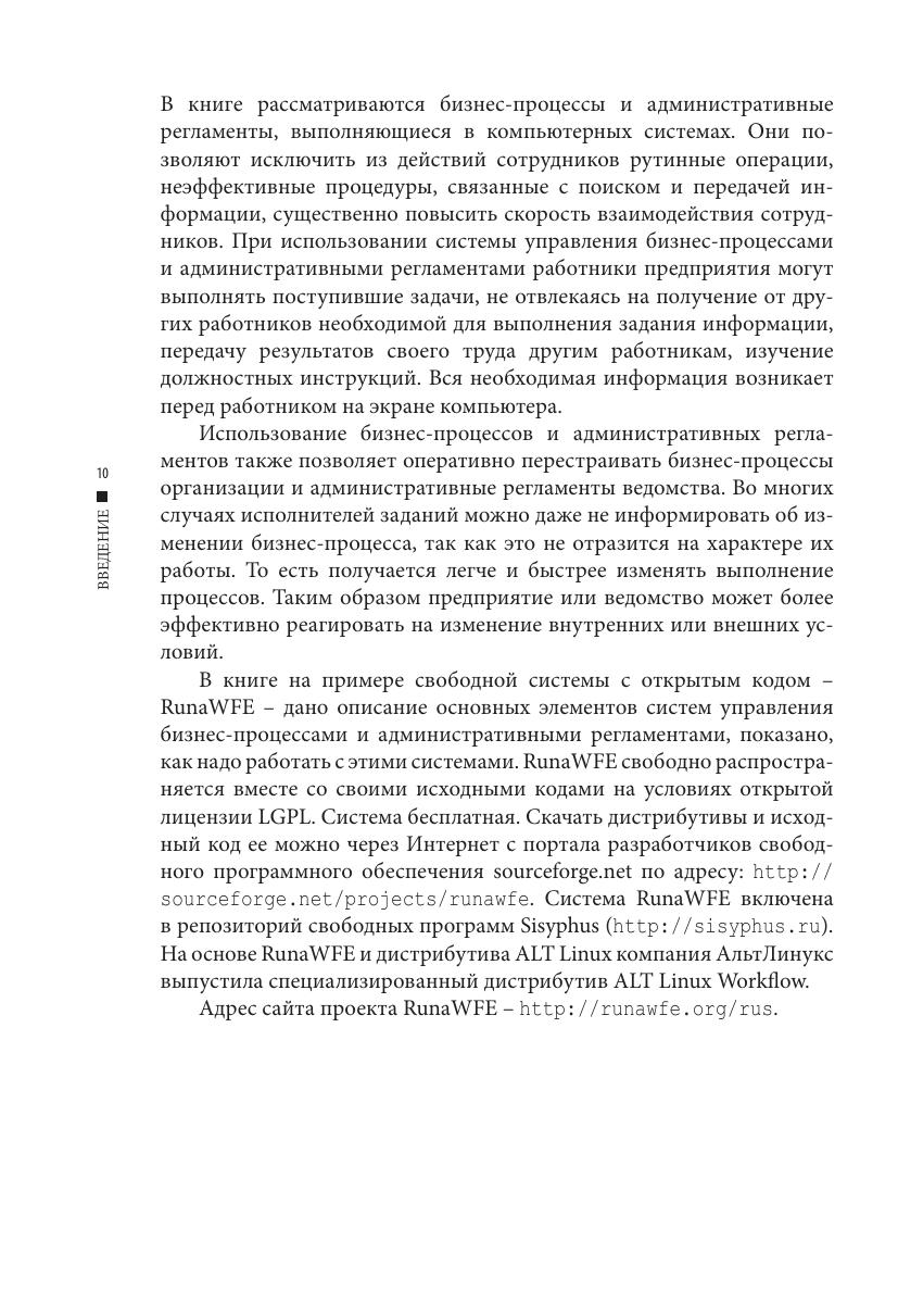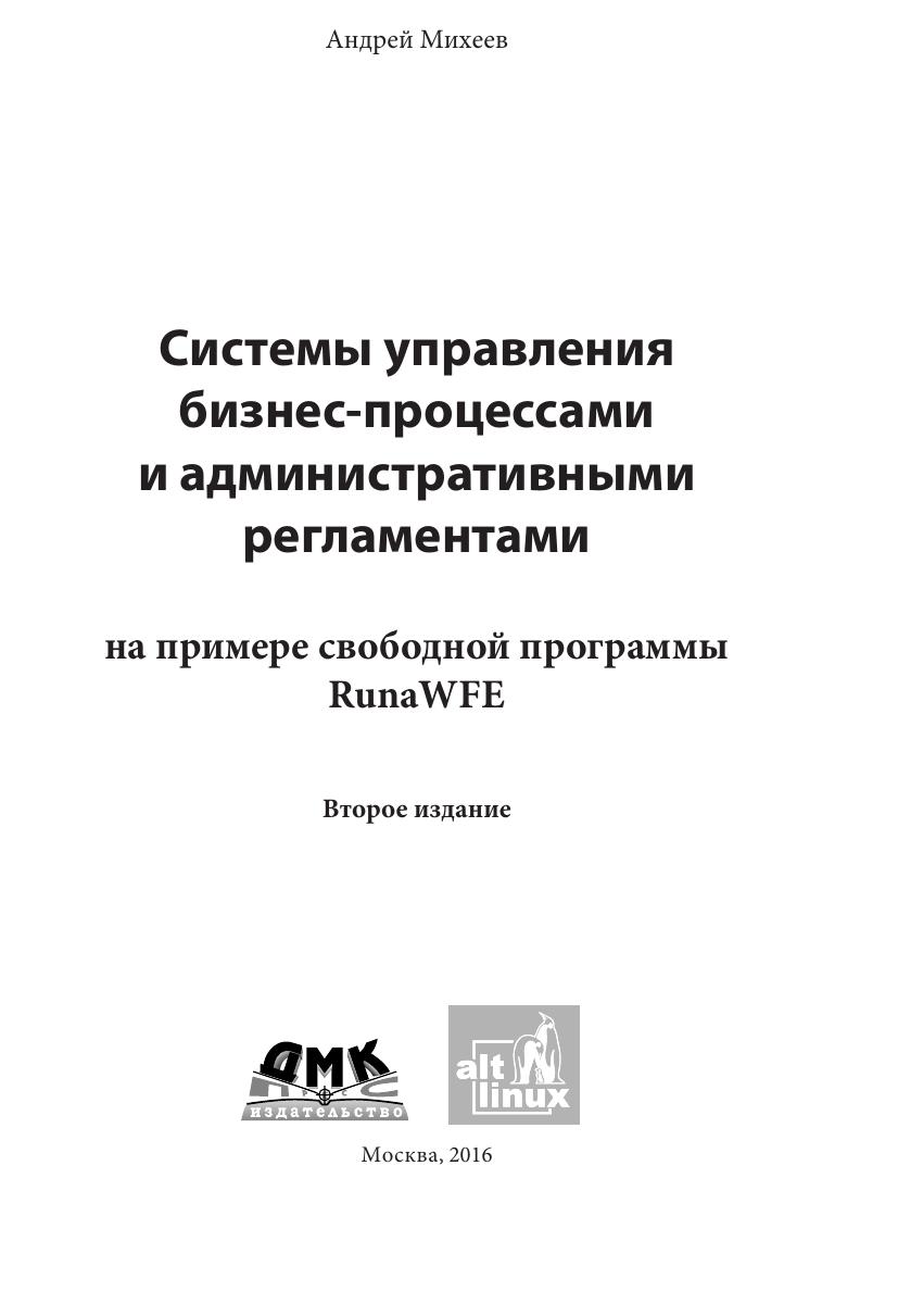 В книге описан процессный подход к организации управления пред- приятием. Даны основы проектирования бизнес-процессов. Подробно рассмотрены исполнимые бизнес-процессы, предполагающие непосредственное их исполнение в компьютерной среде предприятия. Представлено описание основных элементов систем управления бизнес-процессами и административными регламентами. Также затронуты вопросы, связанные с внедрением этих систем и обучением пользователей. Описание работы с системой управления бизнес-процессами и административными регламентами производится на примере свободно- го ПО с открытым кодом RunaWFE. Во 2-м издании материал актуализирован с учетом произошедших изменений в области процессного управления, добавлена глава по основам проектирования бизнес-процессов предприятия. Значительно расширен материал, описывающей работу с системой управления бизнес-процессами. Издание предназначено для студентов, аспирантов, преподавателей, а также всех, интересующихся процессным управлением.