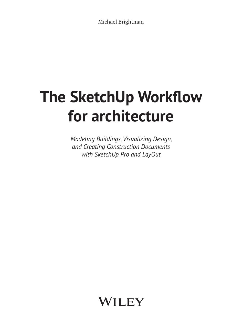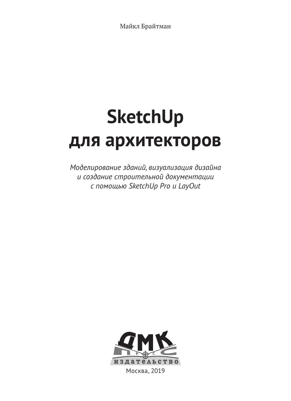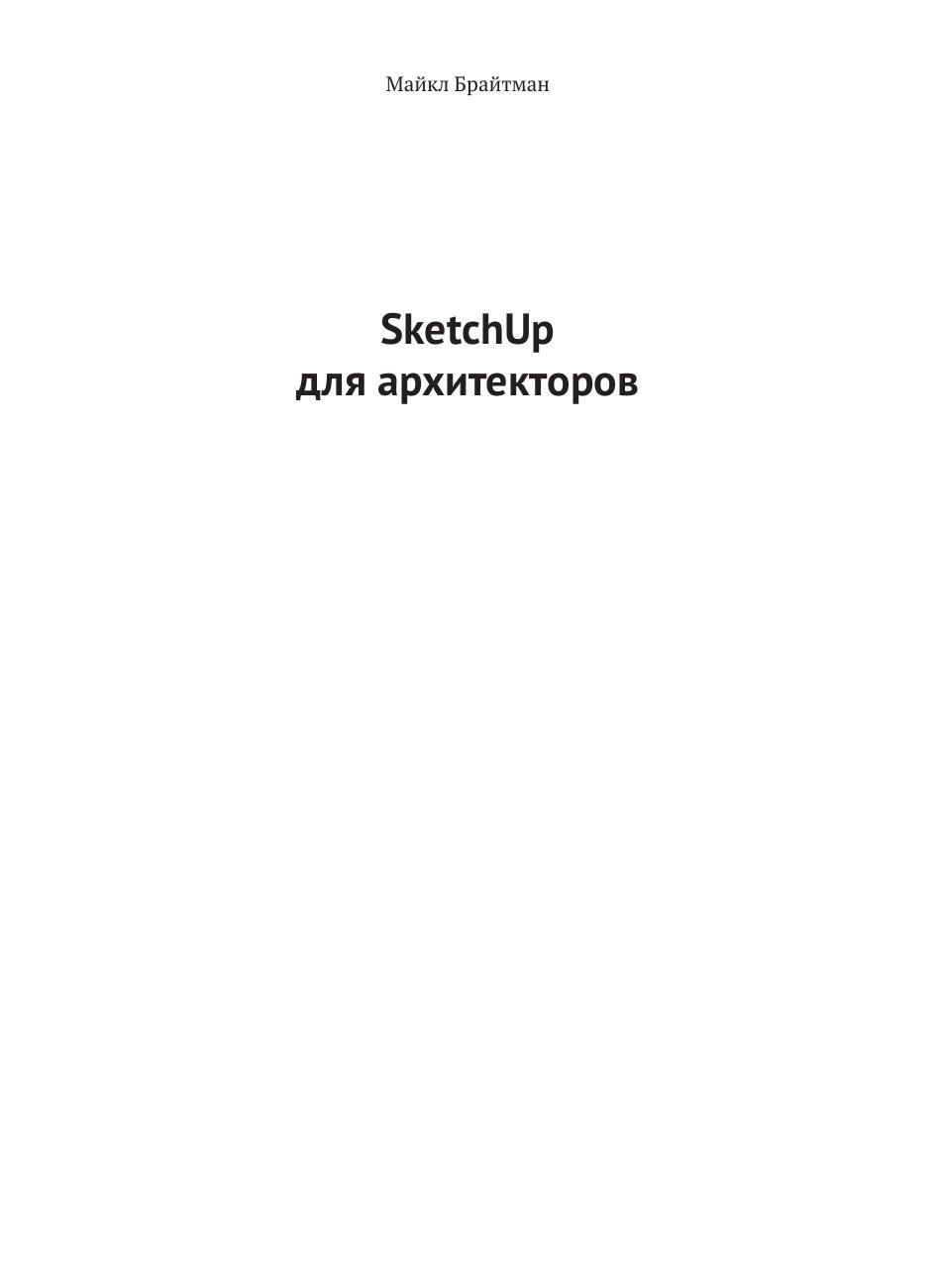 Книга будет полезна всем, кто заинтересован в освоении SketchUp: архитекторам, ландшафтным дизайнерам, дизайнерам интерьеров, подрядчикам. Предполагается, что читатель уже знаком со многими инструментами и основными функциями программы.