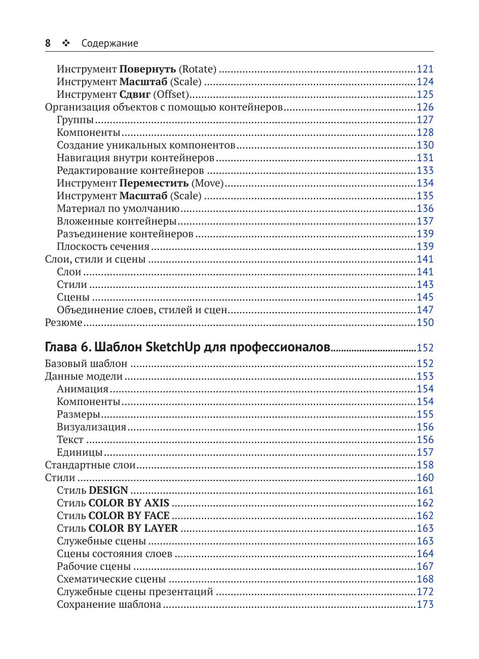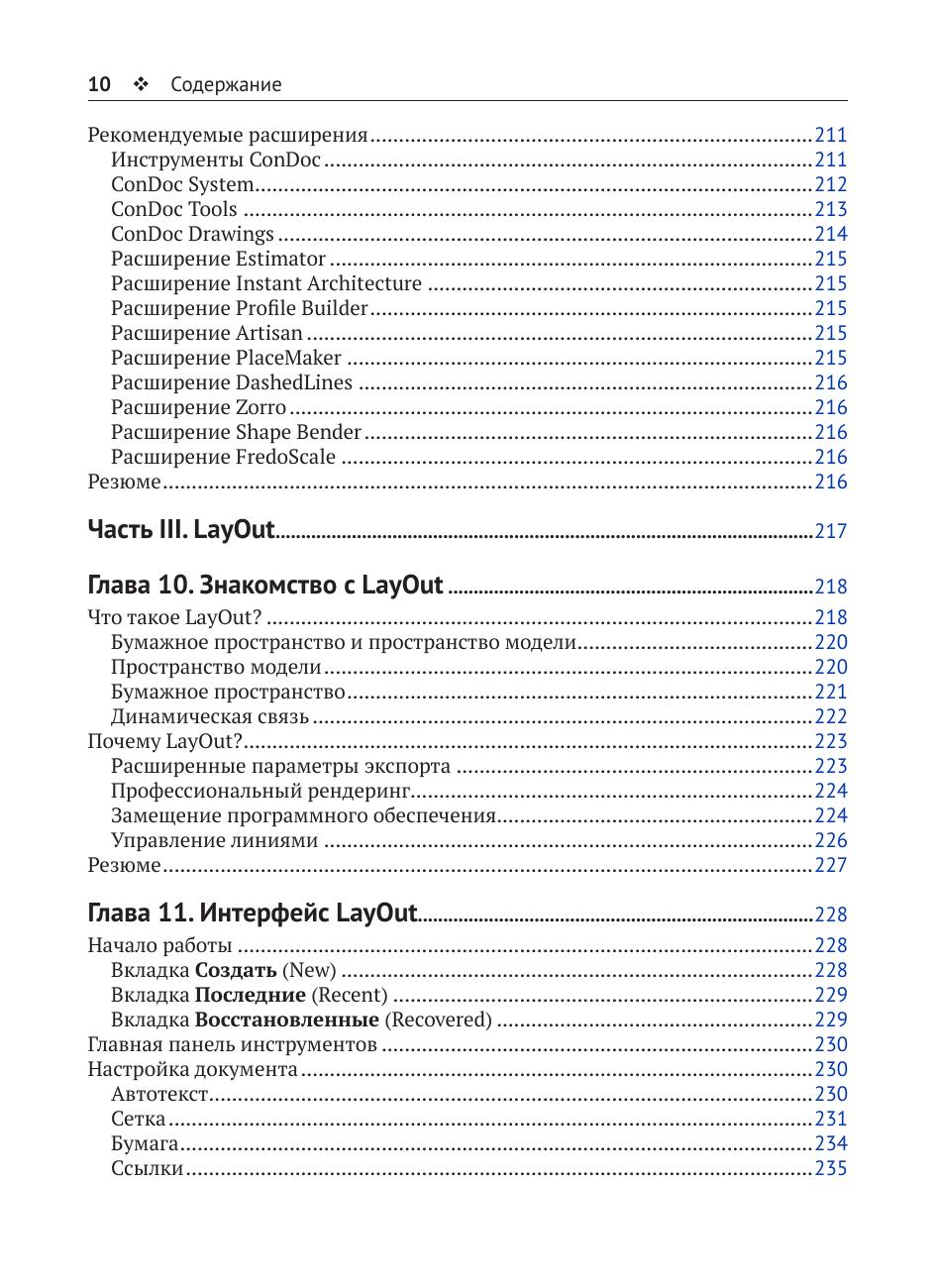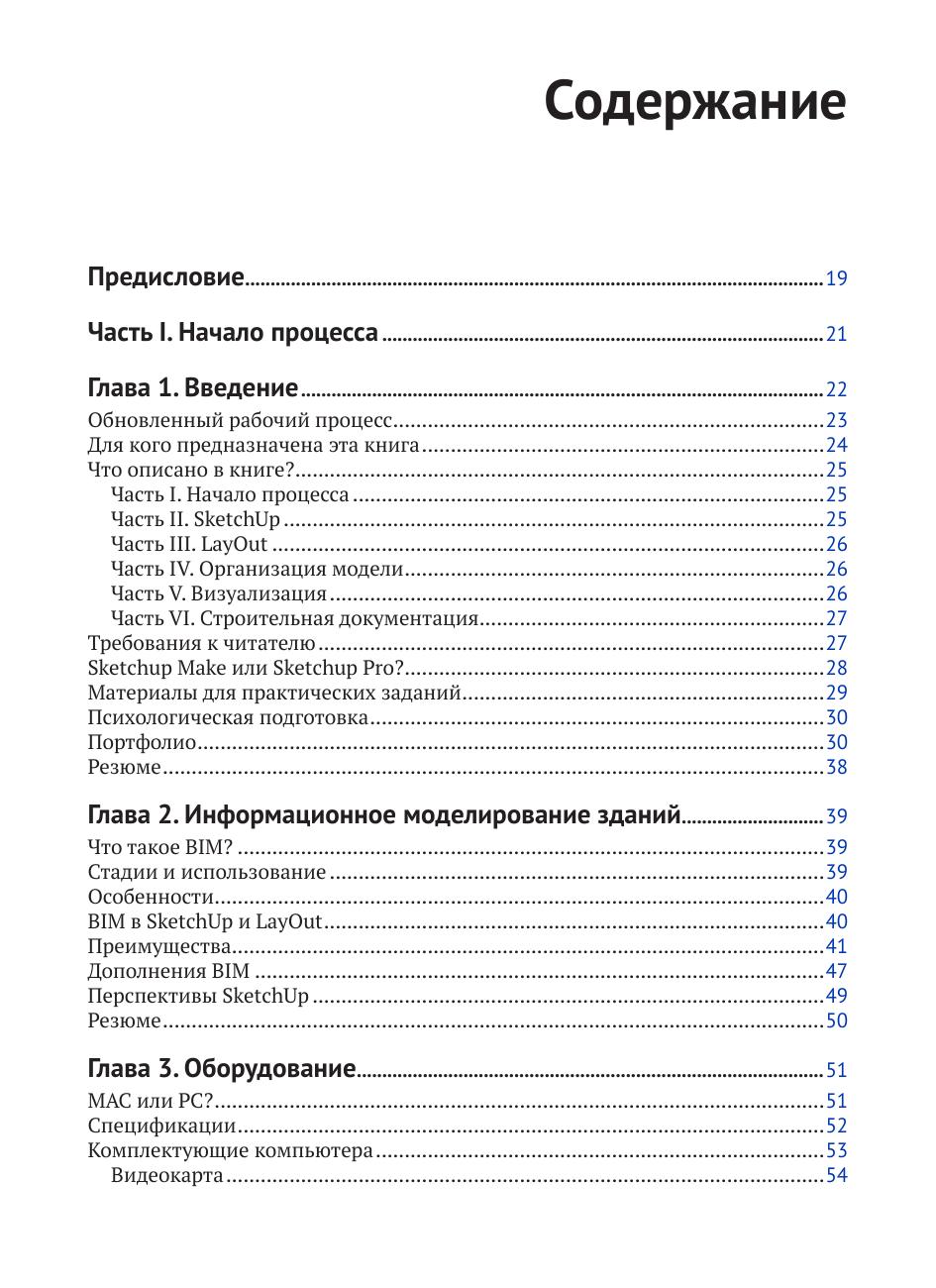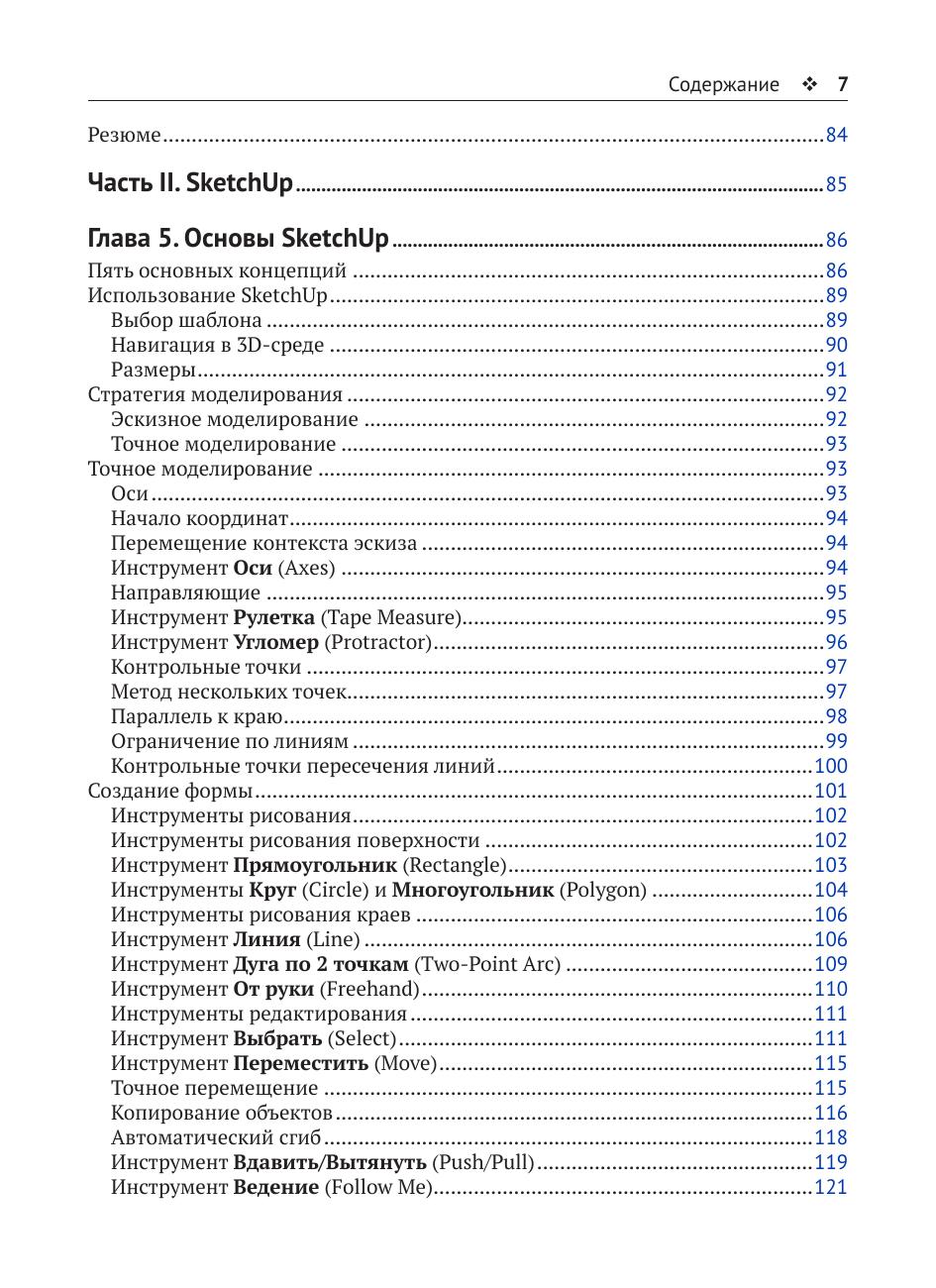 Книга будет полезна всем, кто заинтересован в освоении SketchUp: архитекторам, ландшафтным дизайнерам, дизайнерам интерьеров, подрядчикам. Предполагается, что читатель уже знаком со многими инструментами и основными функциями программы.