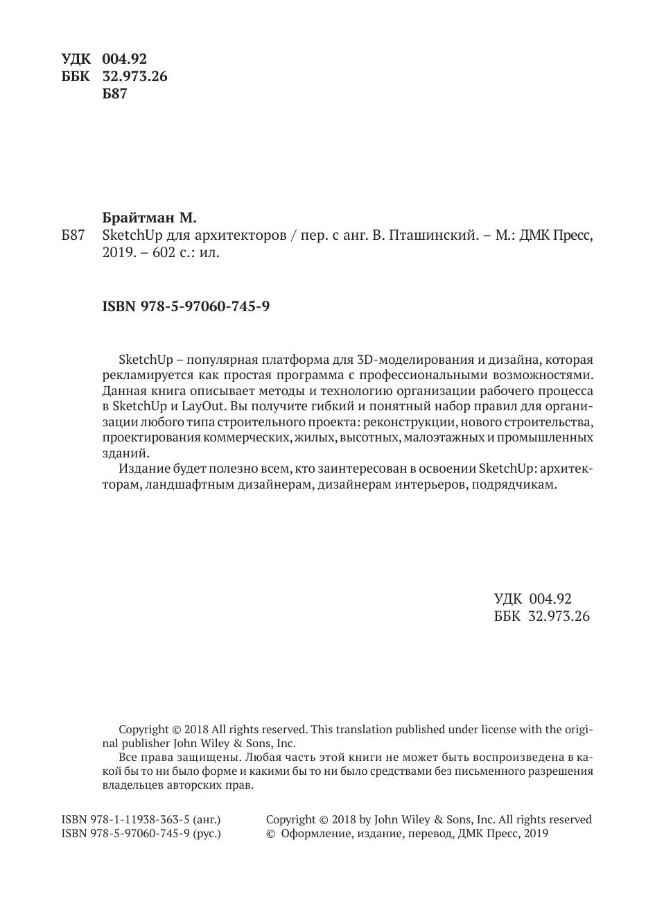 Данная книга описывает методы и технологию организации рабочего процесса в SketchUp и LayOut. Вы получите гибкий и понятный набор правил для организации любого типа строительного проекта: реконструкции, нового строительства, проектирования коммерческих, жилых, высотных, малоэтажных и промышленных зданий.
