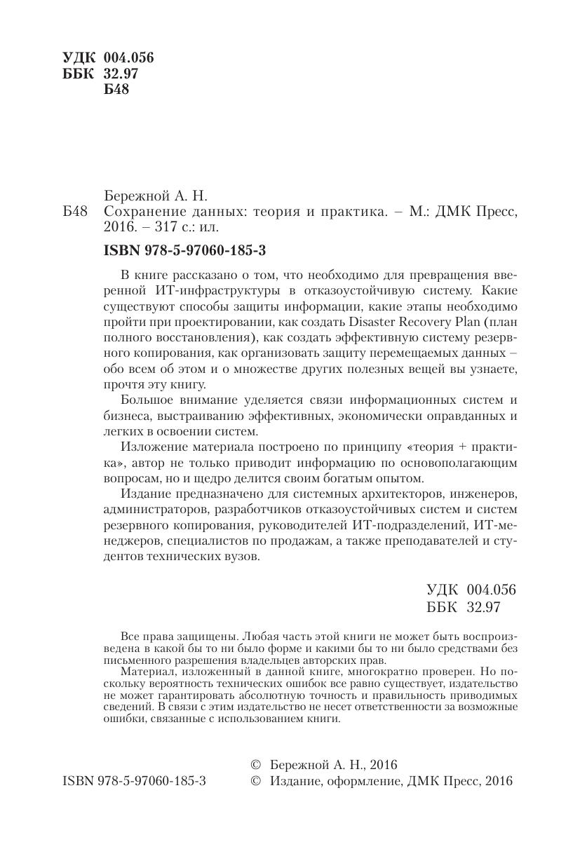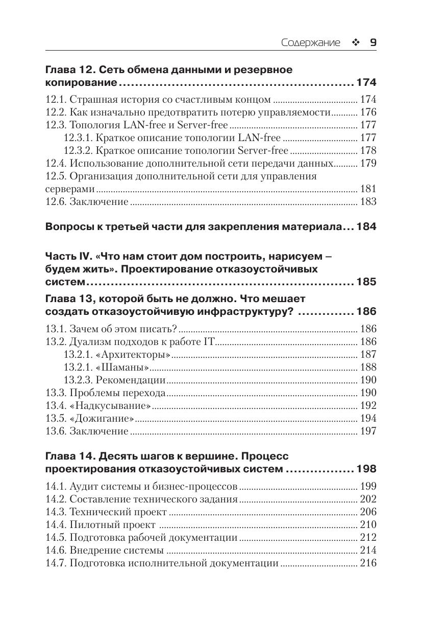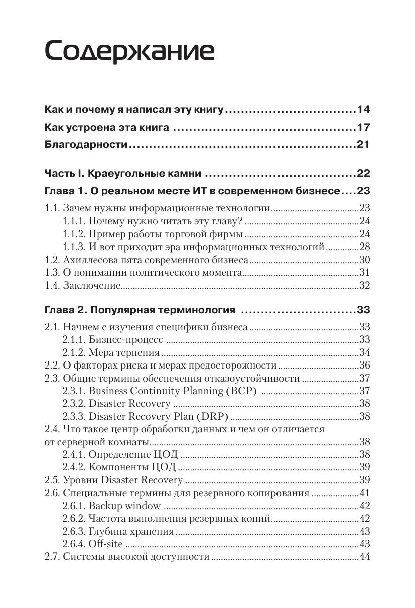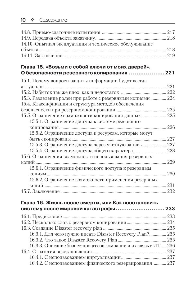 В книге рассказано о том, что необходимо для превращения вверенной ИТ-инфраструктуры в отказоустойчивую систему. Какие существуют способы защиты информации, какие этапы необходимо пройти при проектировании, как создать Disaster Recovery Plan (план полного восстановления), как создать эффективную систему резервного копирования, как организовать защиту перемещаемых данных – обо всем об этом и о множестве других полезных вещей вы узнаете, прочтя эту книгу. Большое внимание уделяется связи информационных систем и бизнеса, выстраиванию эффективных, экономически оправданных и легких в освоении систем. Изложение материала построено по принципу «теория + практика», автор не только приводит информацию по основополагающим вопросам, но и щедро делится своим богатым опытом. Издание предназначено для системных архитекторов, инженеров, администраторов, разработчиков отказоустойчивых систем и систем резервного копирования, руководителей ИТ-подразделений, ИТ-менеджеров, специалистов по продажам, а также преподавателей и студентов технических вузов.