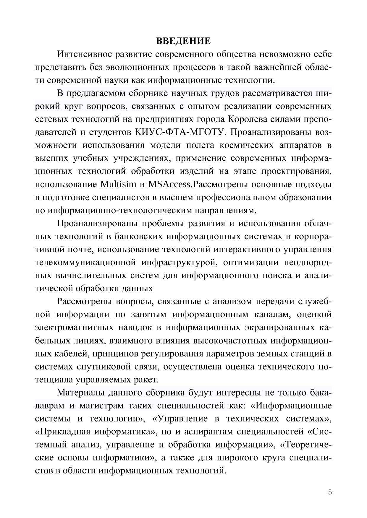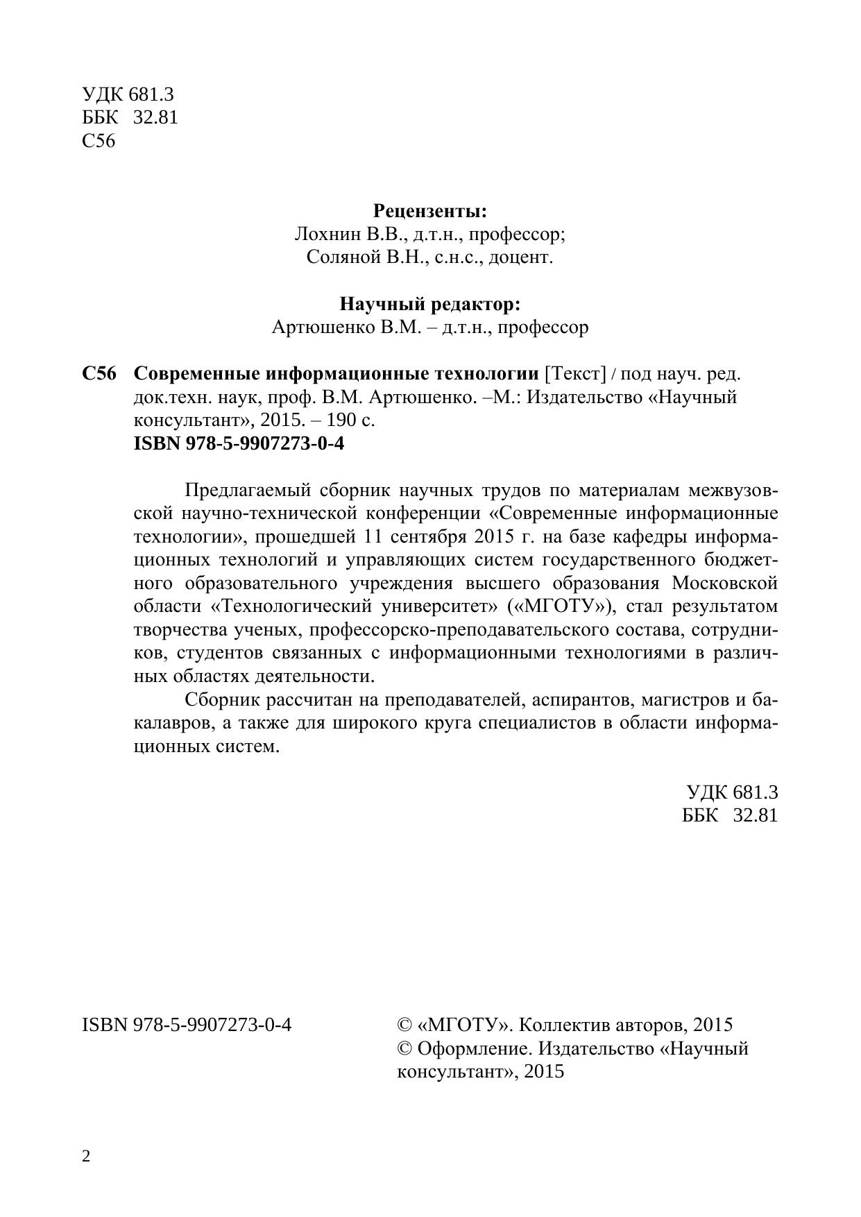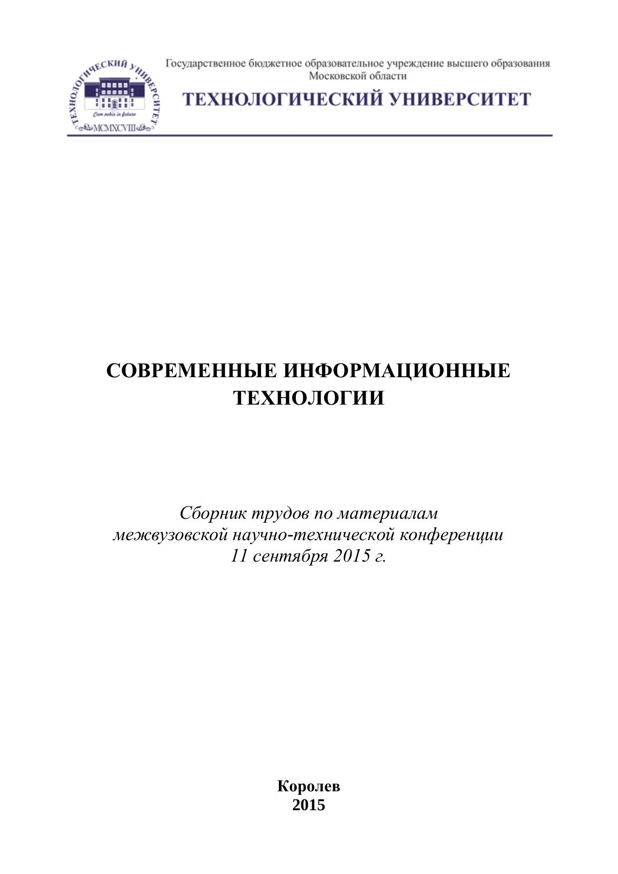 Предлагаемый сборник научных трудов по материалам межвузовской научно-технической конференции «Современные информационные технологии», прошедшей 11 сентября 2015 г. на базе кафедры информационных технологий и управляющих систем государственного бюджетного образовательного учреждения высшего образования Московской области «Технологический университет» («МГОТУ»), стал результатом творчества ученых, профессорско-преподавательского состава, сотрудников, студентов связанных с информационными технологиями в различных областях деятельности. Сборник рассчитан на преподавателей, аспирантов, магистров и бакалавров, а также для широкого круга специалистов в области информационных систем.