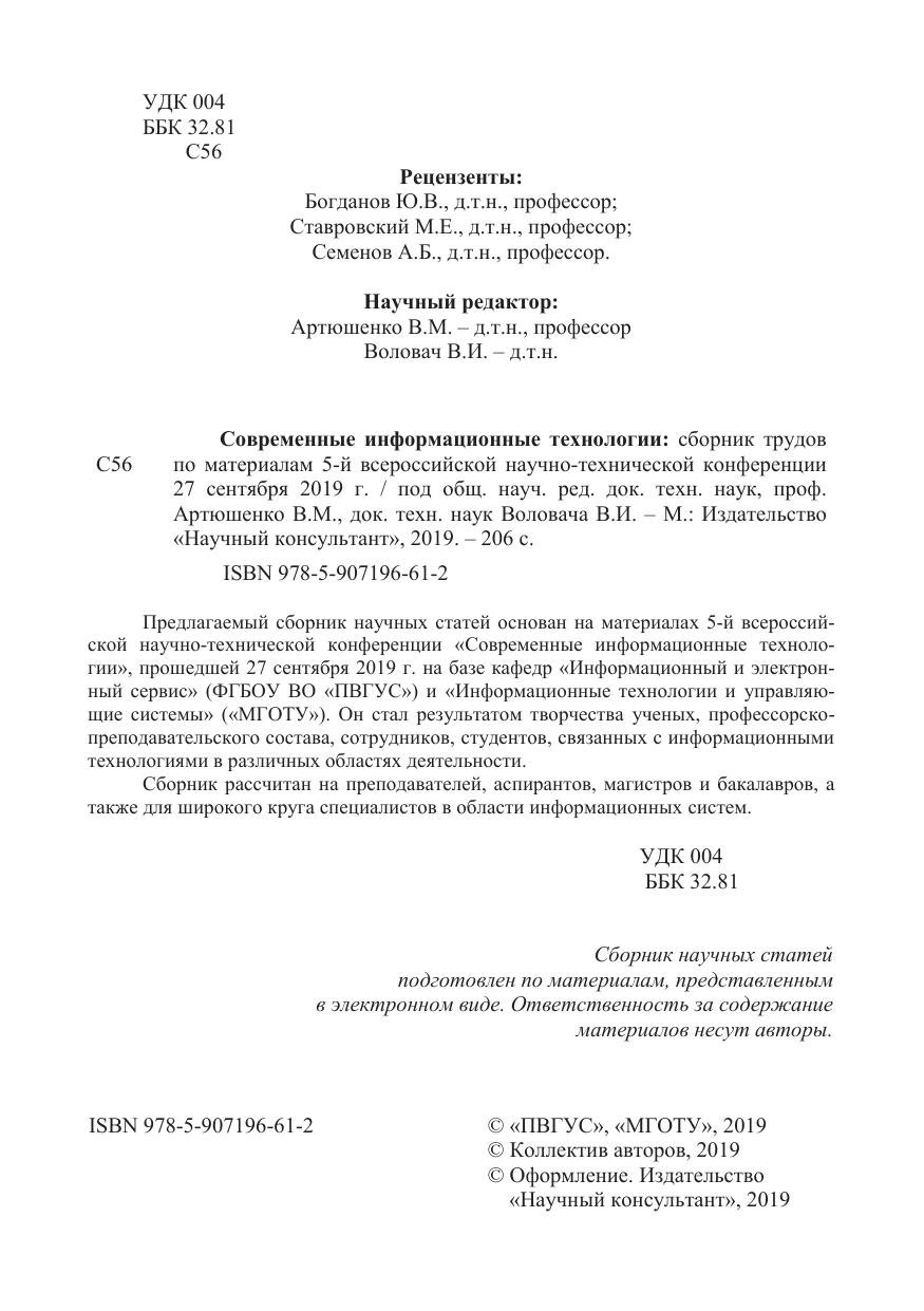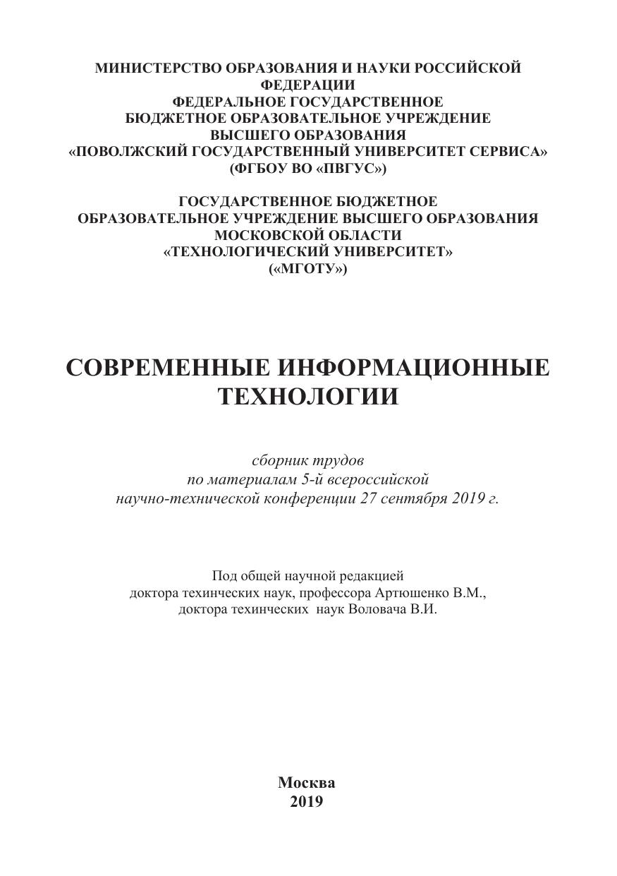 Сборник трудов. Предлагаемый сборник научных статей основан на материалах 5-й всероссийской научно-технической конференции «Современные информационные технологии», прошедшей 27 сентября 2019 г. на базе кафедр «Информационный и электронный сервис» (ФГБОУ ВО «ПВГУС») и «Информационные технологии и управляющие системы» («МГОТУ»). Он стал результатом творчества ученых, профессорско-преподавательского состава, сотрудников, студентов, связанных с информационными технологиями в различных областях деятельности.