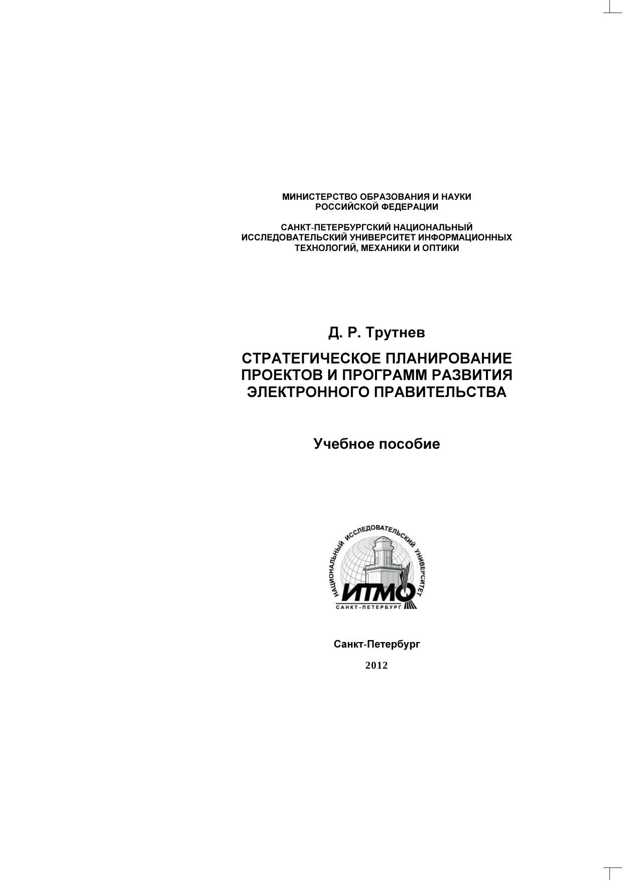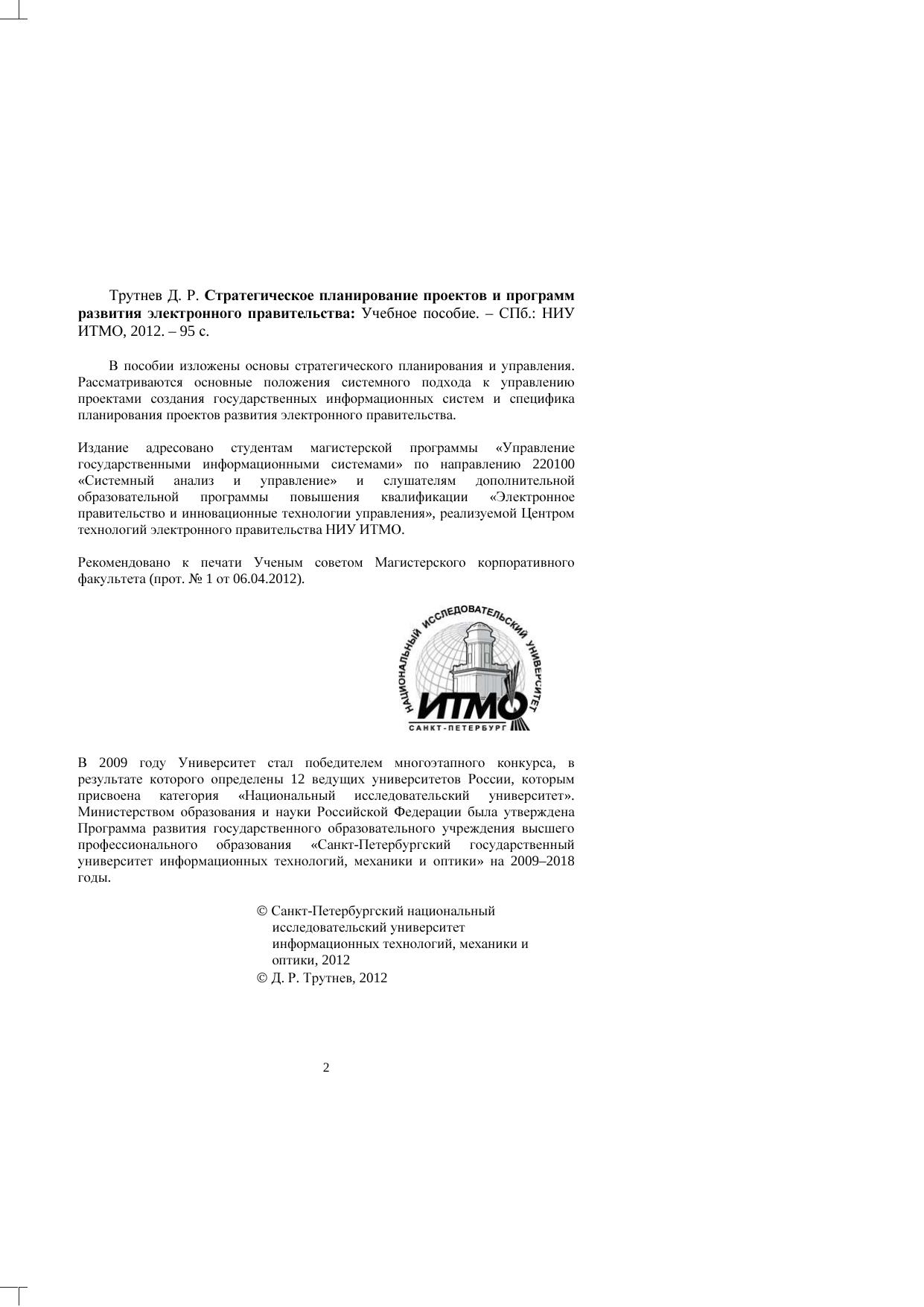В пособии изложены основы стратегического планирования и управления. Рассматриваются основные положения системного подхода к управлению проектами создания государственных информационных систем и специфика планирования проектов развития электронного правительства. Издание адресовано студентам магистерской программы «Управление государственными информационными системами» по направлению 220100 «Системный анализ и управление» и слушателям дополнительной образовательной программы повышения квалификации «Электронное правительство и инновационные технологии управления», реализуемой Центром технологий электронного правительства НИУ ИТМО.