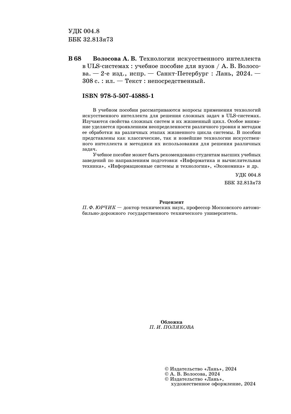 В учебном пособии рассматриваются вопросы применения технологий искусственного интеллекта для решения сложных задач в ULS-системах. Изучаются свойства сложных систем и их жизненный цикл. Особое внимание уделяется проявлениям неопределенности различного уровня и методам ее обработки на различных этапах жизненного цикла системы. В пособии представлены, как классические, так и новейшие технологии искусственного интеллекта и методики их использования для решения различных задач. Учебное пособие может быть рекомендовано студентам по направле-ниям подготовки «Информатика и вычислительная техника», «Информа-ционные системы и технологии», «Экономика» и др.