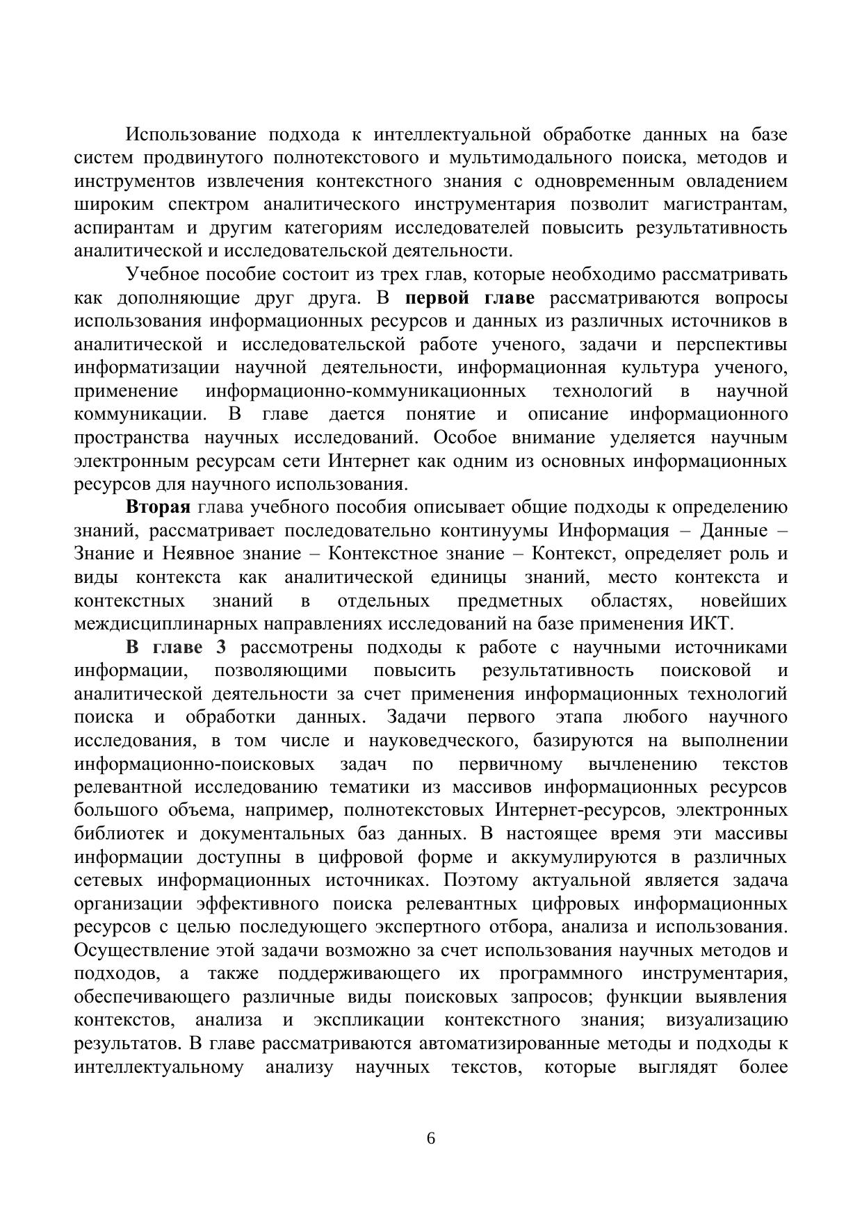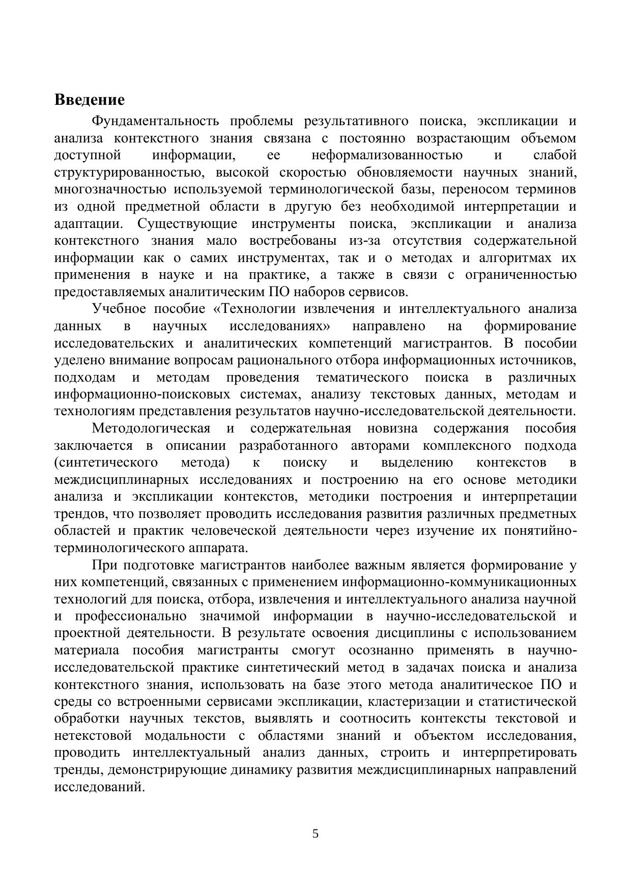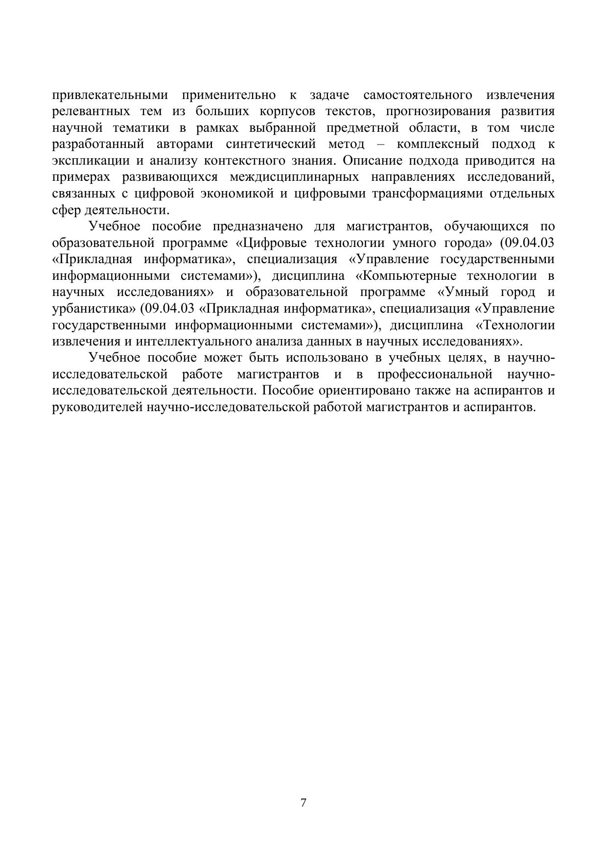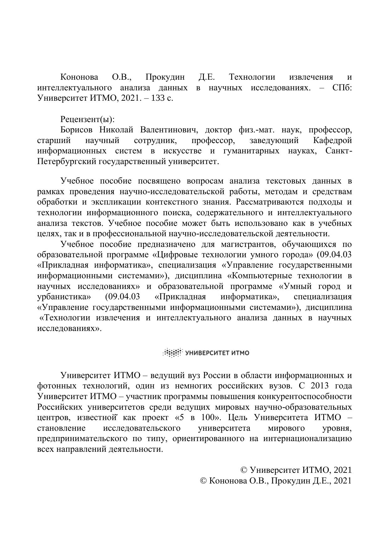 Учебное пособие посвящено вопросам анализа текстовых данных в рамках проведения научно-исследовательской работы, методам и средствам обработки и экспликации контекстного знания. Рассматриваются подходы и технологии информационного поиска, содержательного и интеллектуального анализа текстов. Учебное пособие может быть использовано как в учебных целях, так и в профессиональной научно-исследовательской деятельности. Учебное пособие предназначено для магистрантов, обучающихся по образовательной программе «Цифровые технологии умного города» (09.04.03 «Прикладная информатика», специализация «Управление государственными информационными системами»), дисциплина «Компьютерные технологии в научных исследованиях» и образовательной программе «Умный город и урбанистика» (09.04.03 «Прикладная информатика», специализация «Управление государственными информационными системами»), дисциплина «Технологии извлечения и интеллектуального анализа данных в научных исследованиях».
