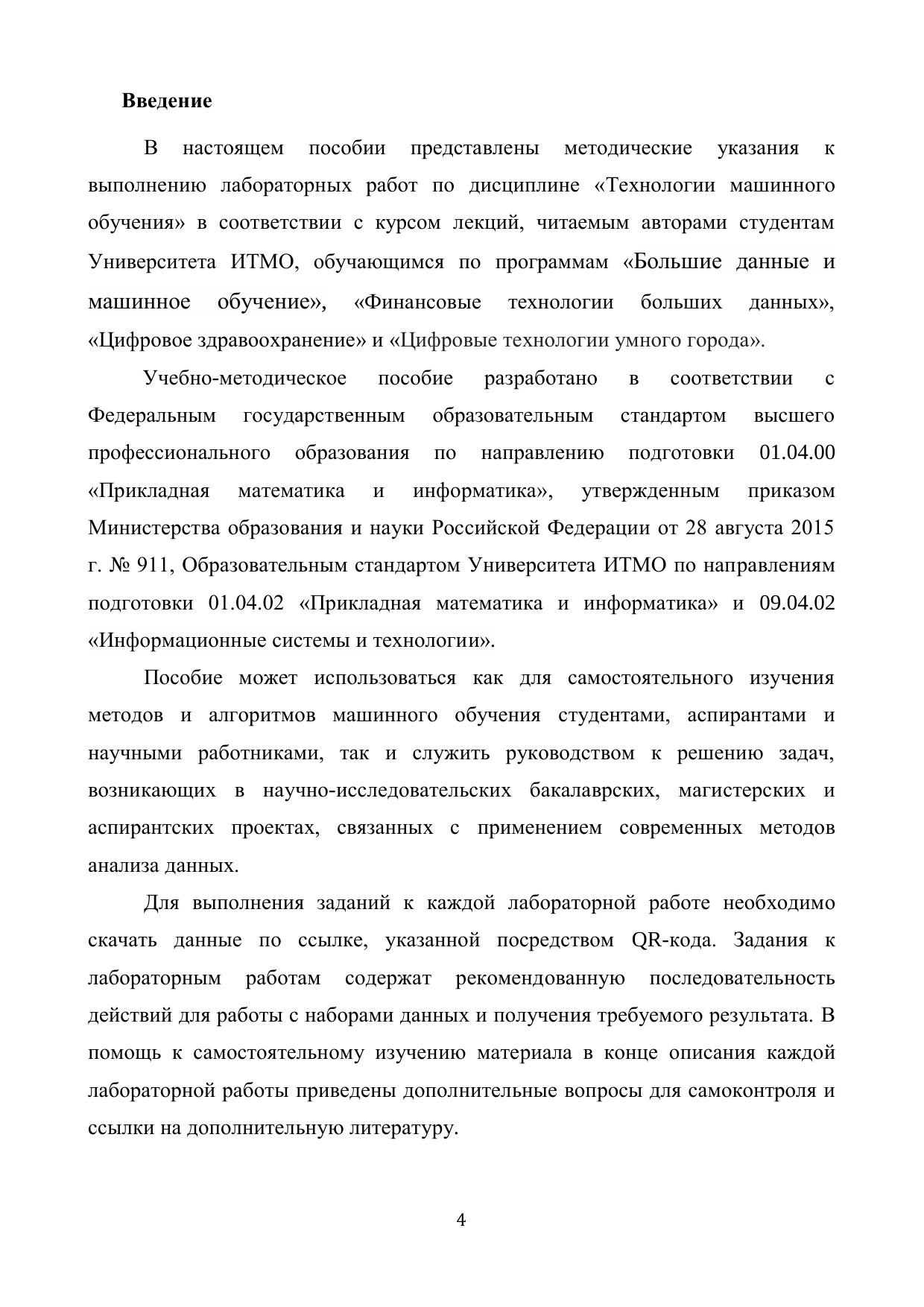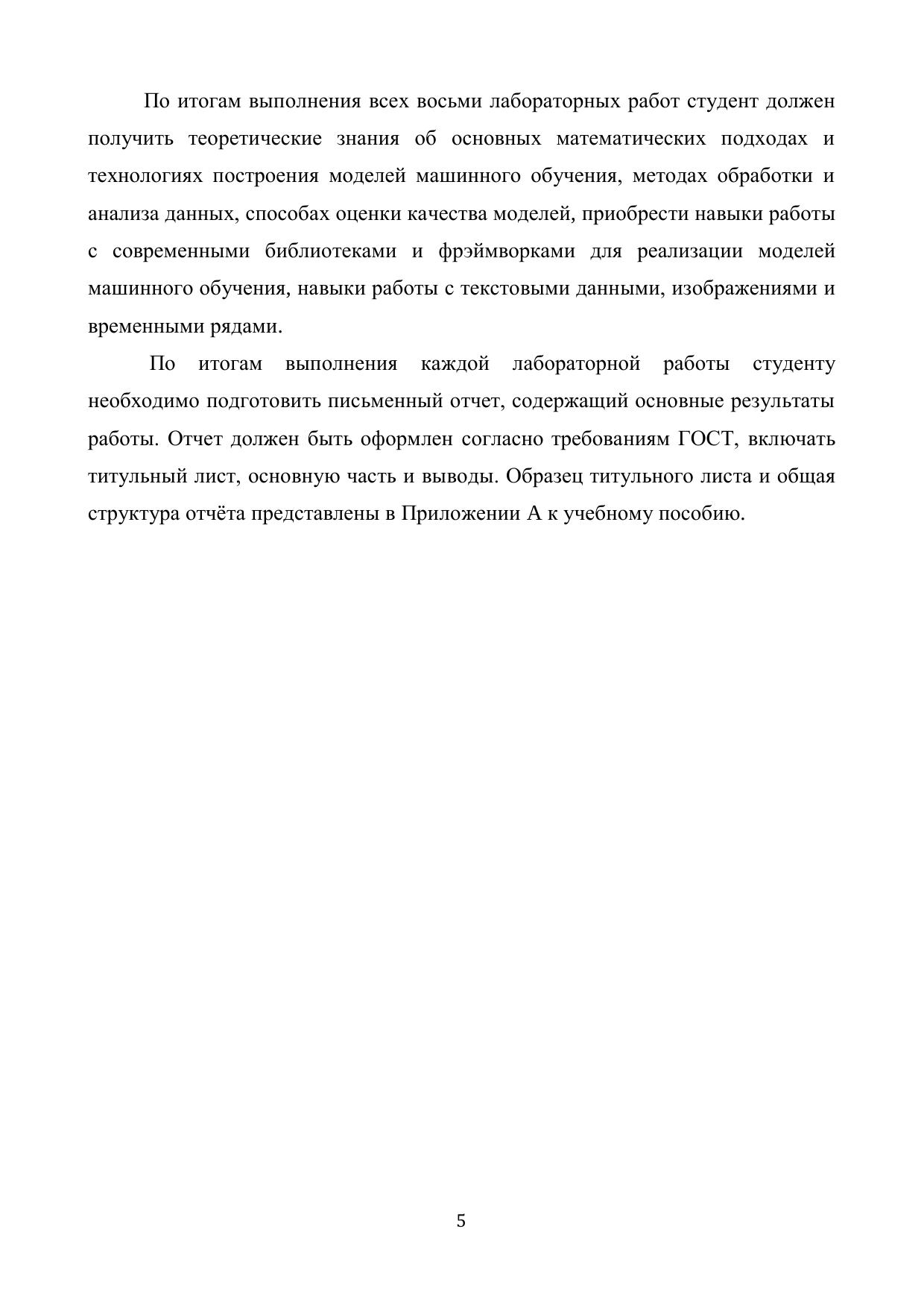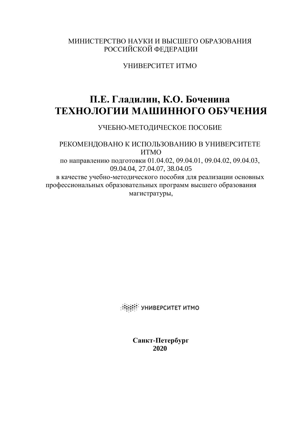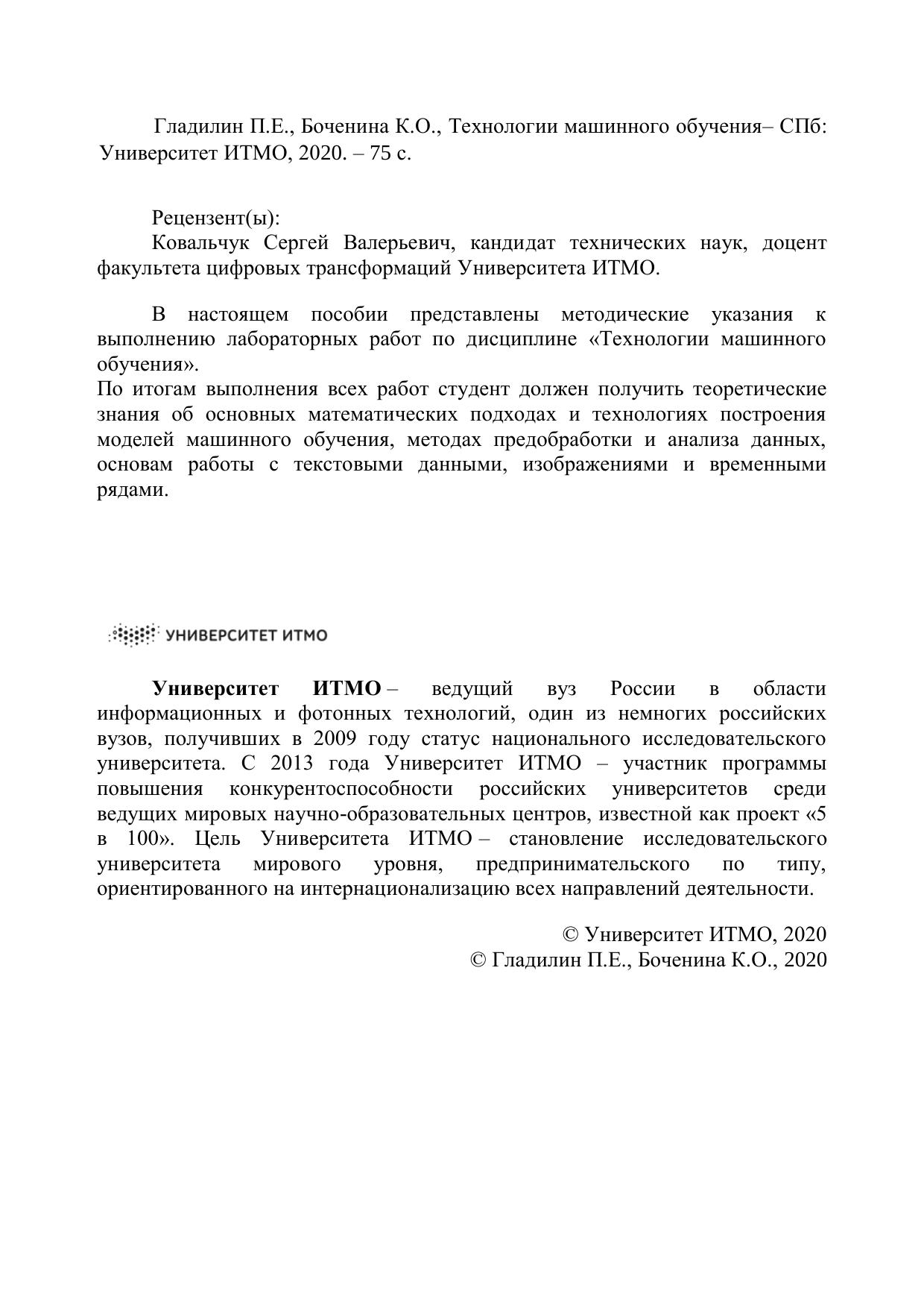 В настоящем пособии представлены методические указания к выполнению лабораторных работ по дисциплине «Технологии машинного обучения». По итогам выполнения всех работ студент должен получить теоретические знания об основных математических подходах и технологиях построения моделей машинного обучения, методах предобработки и анализа данных, основам работы с текстовыми данными, изображениями и временными рядами.