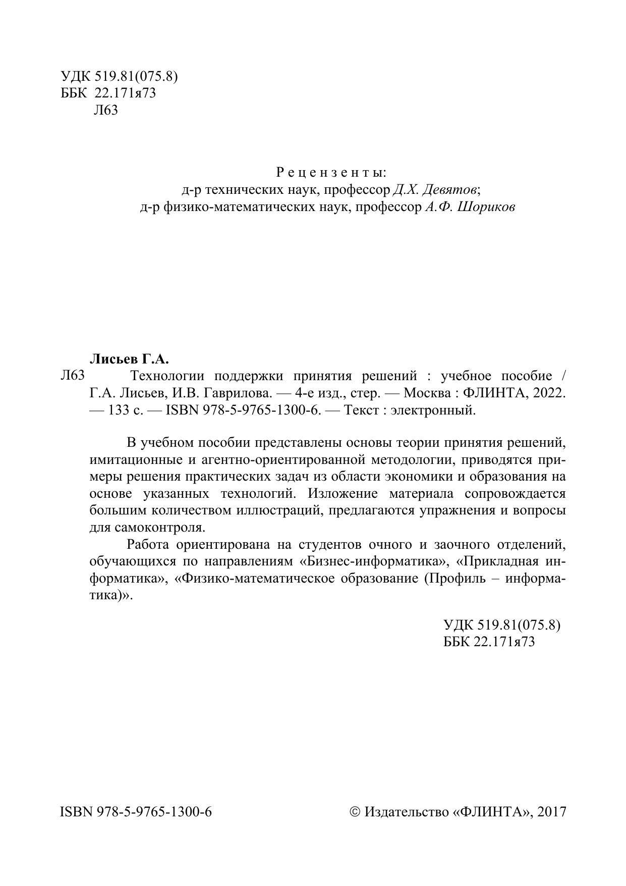 В учебном пособии представлены основы теории принятия решений, имитационные и агентно-ориентированной методологии, приводятся примеры решения практических задач из области экономики и образования на основе указанных технологий. Изложение материала сопровождается большим количеством иллюстраций, предлагаются упражнения и вопросы для самоконтроля.