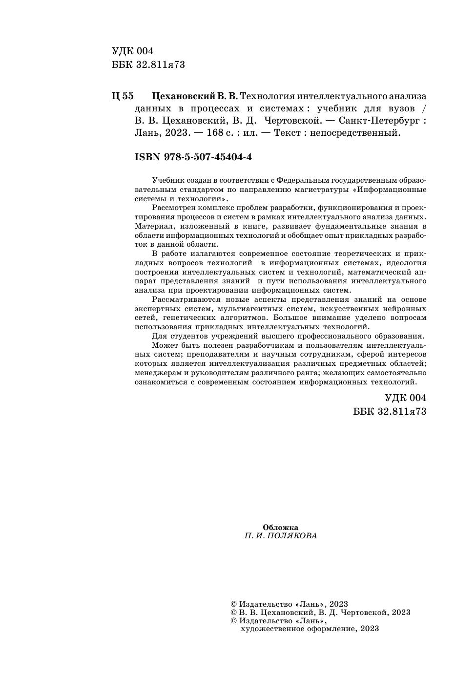 Учебник создан в соответствии с Федеральным государственным образовательным стандартом по направлению магистратуры «Информационные системы и технологии». Рассмотрен комплекс проблем разработки, функционирования и проектирования процессов и систем в рамках интеллектуального анализа данных. Материал, изложенный в книге, развивает фундаментальные знания в области информационных технологий и обобщает опыт прикладных разработок в данной области. В работе излагаются современное состояние теоретических и прикладных вопросов технологий в информационных системах, идеология построения интеллектуальных систем и технологий, математический аппарат представления знаний и пути использования интеллектуального анализа при проектировании информационных систем. Рассматриваются новые аспекты представления знаний на основе экспертных систем, мультиагентных систем, искусственных нейронных сетей, генетических алгоритмов. Большое внимание уделено вопросам использования прикладных интеллектуальных технологий. Для студентов учреждений высшего профессионального образования. Может быть полезен разработчикам и пользователям интеллектуальных систем, преподавателям и научным сотрудникам, сферой интересов которых является интеллектуализация различных предметных областей, менеджерам и руководителям различного ранга, желающих самостоятельно ознакомиться с современным состоянием информационных технологий.