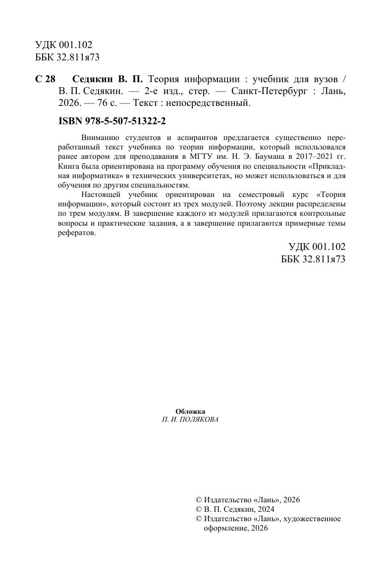 Вниманию студентов и аспирантов предлагается существенно переработанный текст учебника по теории информации, которое использовалось ранее автором для преподавания в МГТУ им. Н.Э. Баумана в 2017–2021 гг. Книга была ориентирована на программу обучения по специальности «Прикладная информатика» в технических университетах, но может использоваться и для обучения по другим специальностям. Настоящей учебник ориентирован на семестровый курс «Теория информации», который состоит из трех модулей. Поэтому лекции распределены по трем модулям. В завершение каждого из модулей прилагаются контрольные вопросы и практические задания, а в завершение прилагаются примерные темы рефератов.