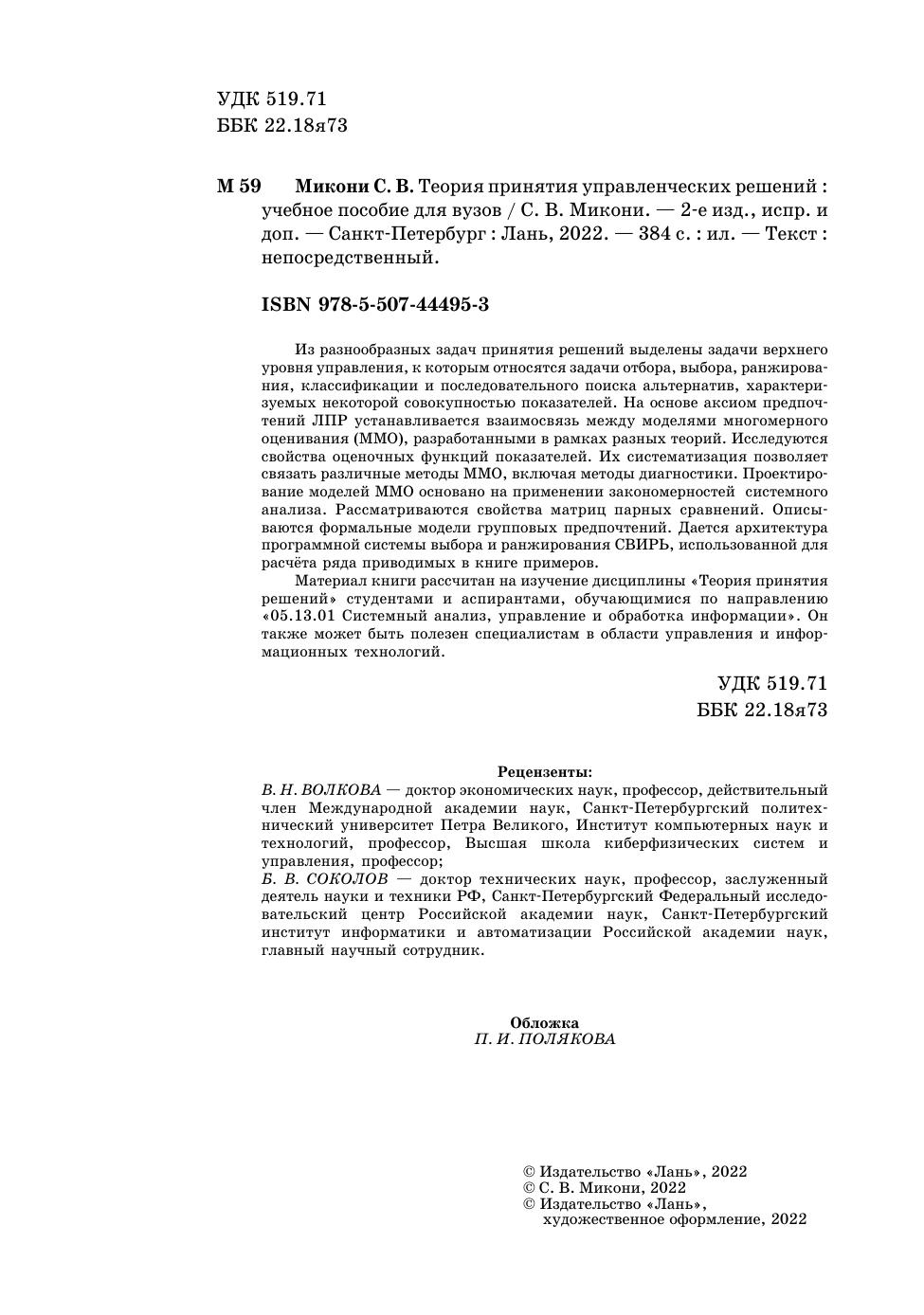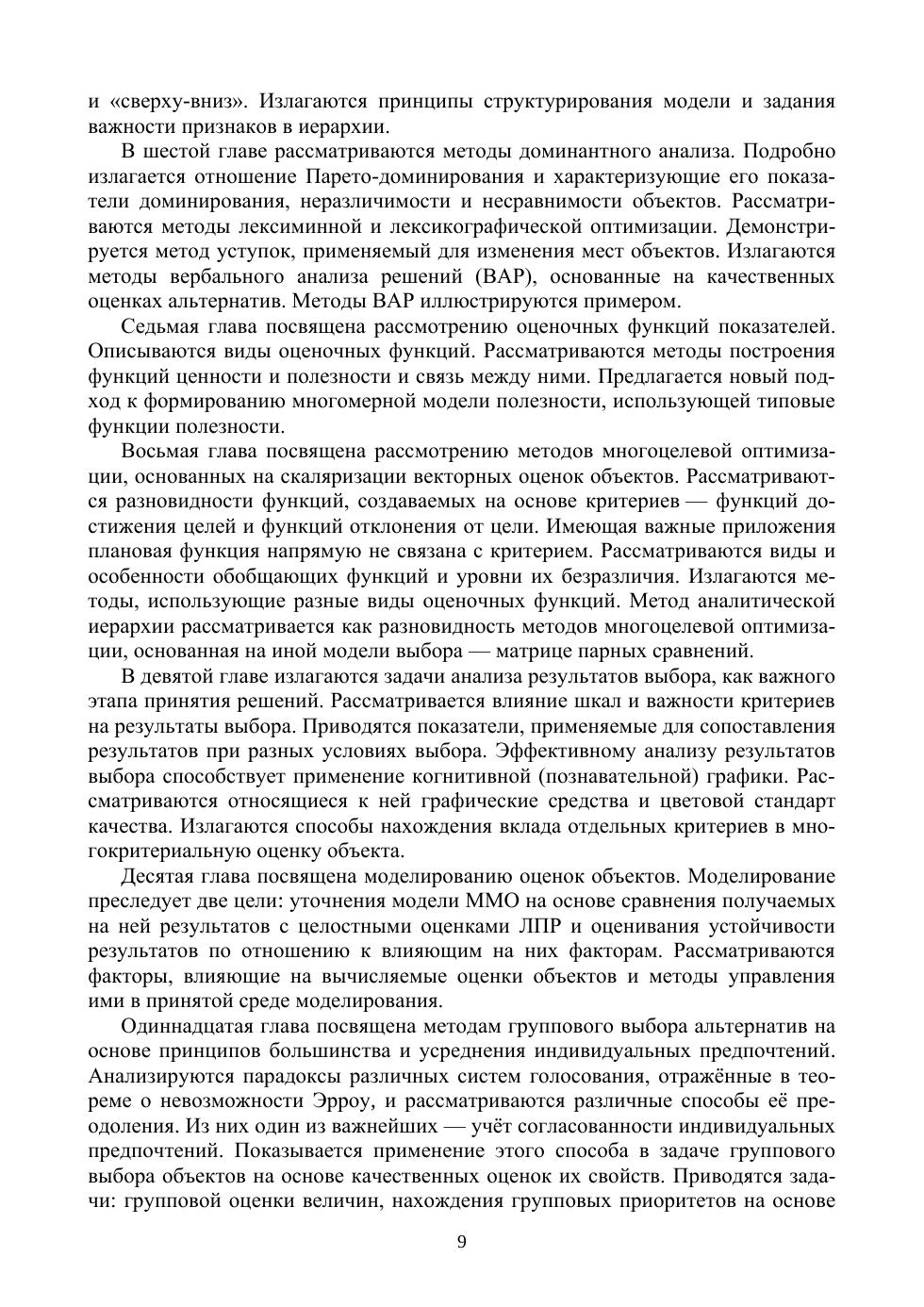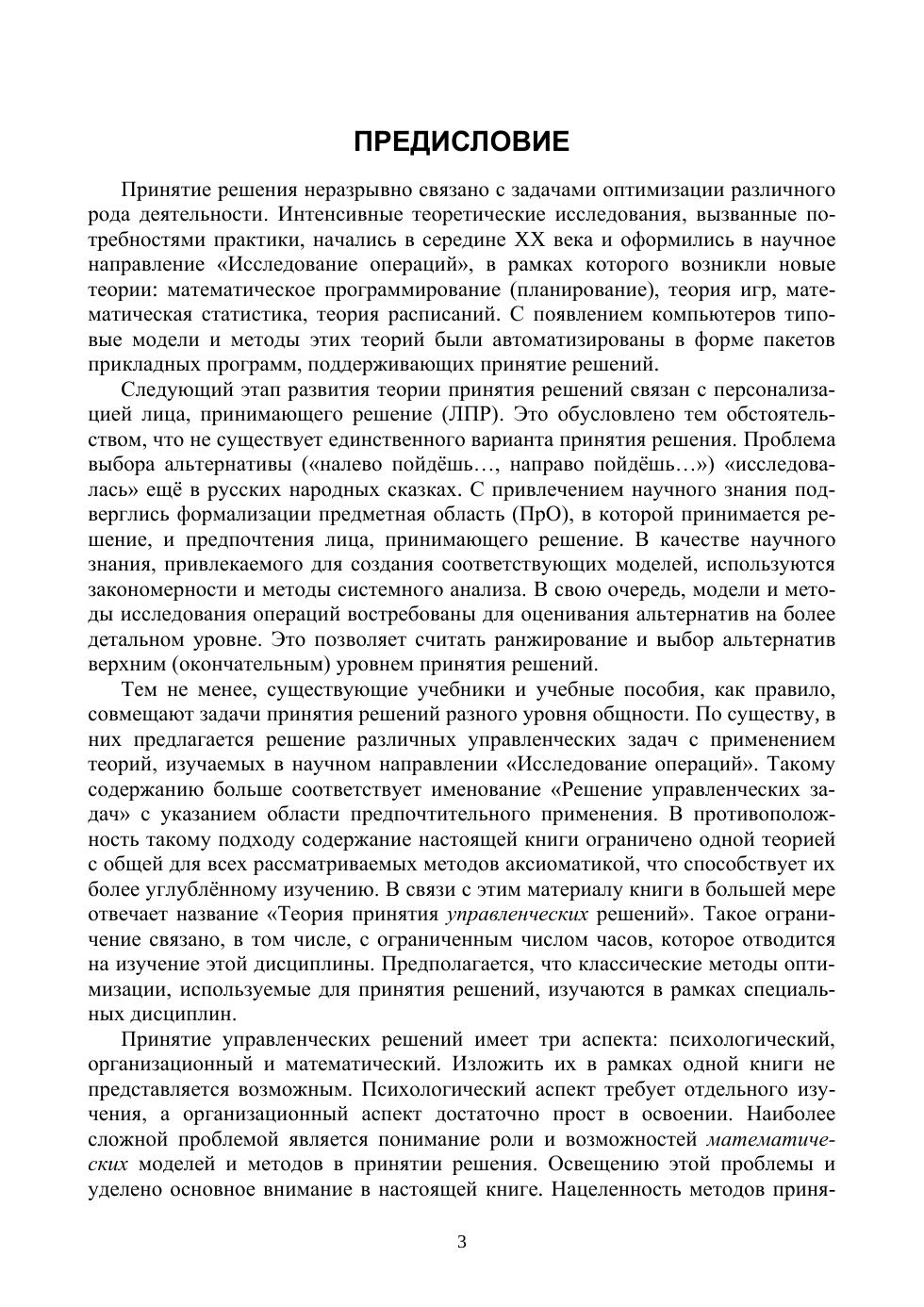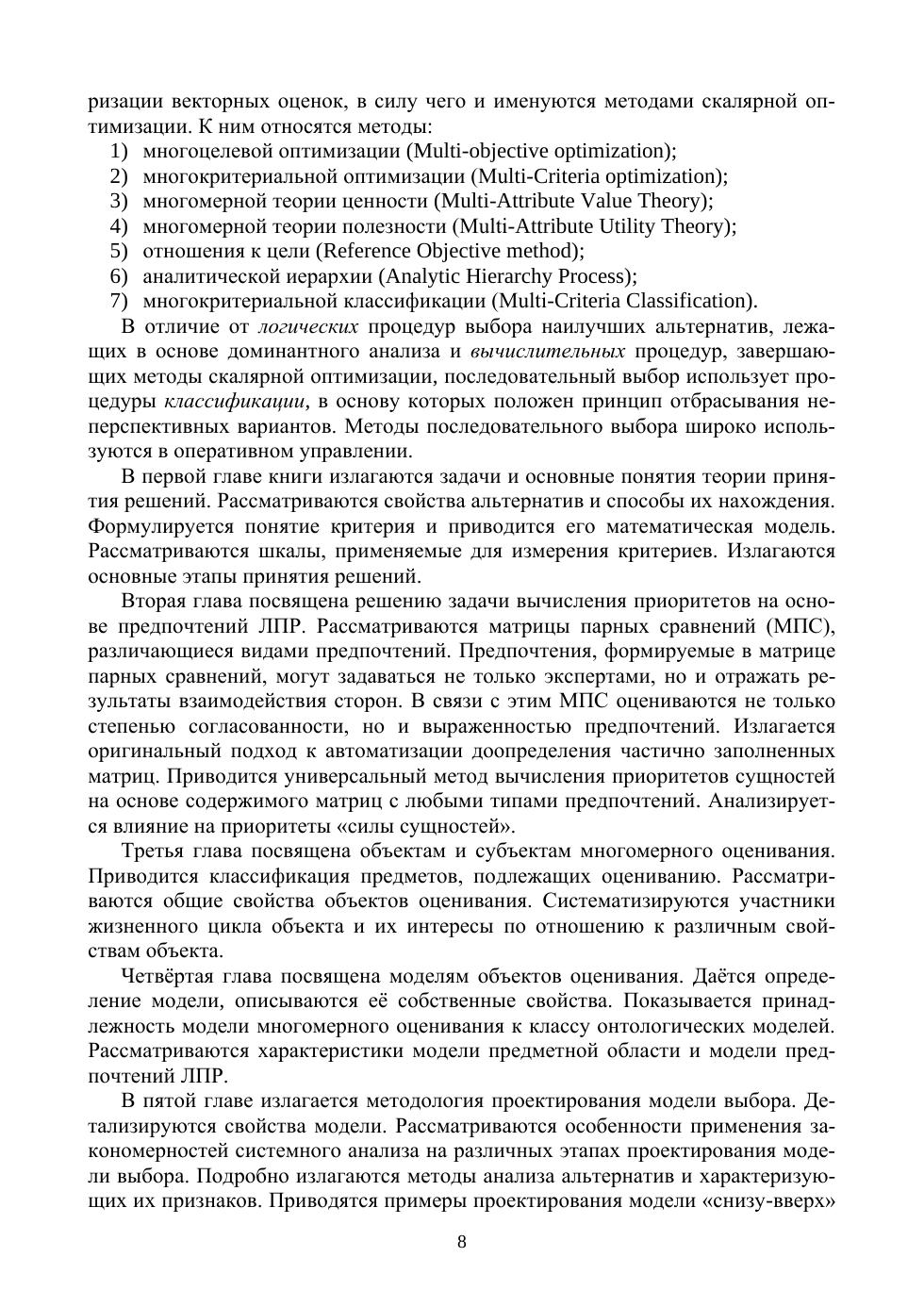 Из разнообразных задач принятия решений выделены задачи верхнего уровня управления, к которым относятся задачи отбора, выбора, ранжирования, классификации и последовательного поиска альтернатив, характеризуемых некоторой совокупностью показателей. На основе аксиом предпочтений ЛПР устанавливается взаимосвязь между моделями многомерного оценивания (ММО), разработанными в рамках разных теорий. Исследуются свойства оценочных функций показателей. Их систематизация позволяет связать различные методы ММО, включая методы диагностики. Проектирование моделей ММО основано на применении закономерностей системного анализа. Рассматриваются свойства матриц парных сравнений. Описываются формальные модели групповых предпочтений. Дается архитектура программной системы выбора и ранжирования СВИРЬ, использованной для расчёта ряда приводимых в книге примеров. Материал книги рассчитан на изучение дисциплины «Теория принятия решений» студентами и аспирантами, обучающимися по направлению «05.13.01 Системный анализ, управление и обработка информации». Он также может быть полезен специалистам в области управления и информационных технологий.