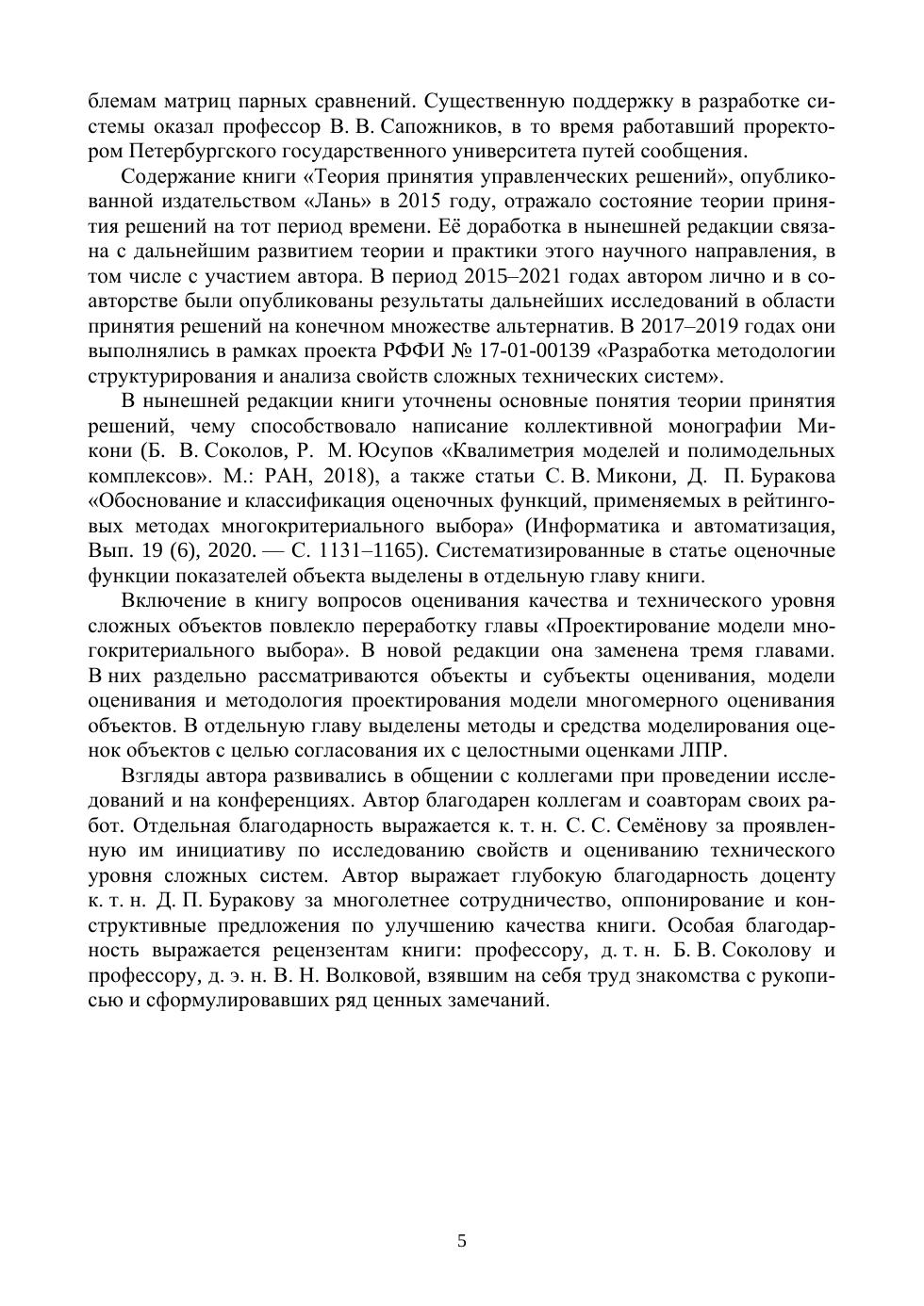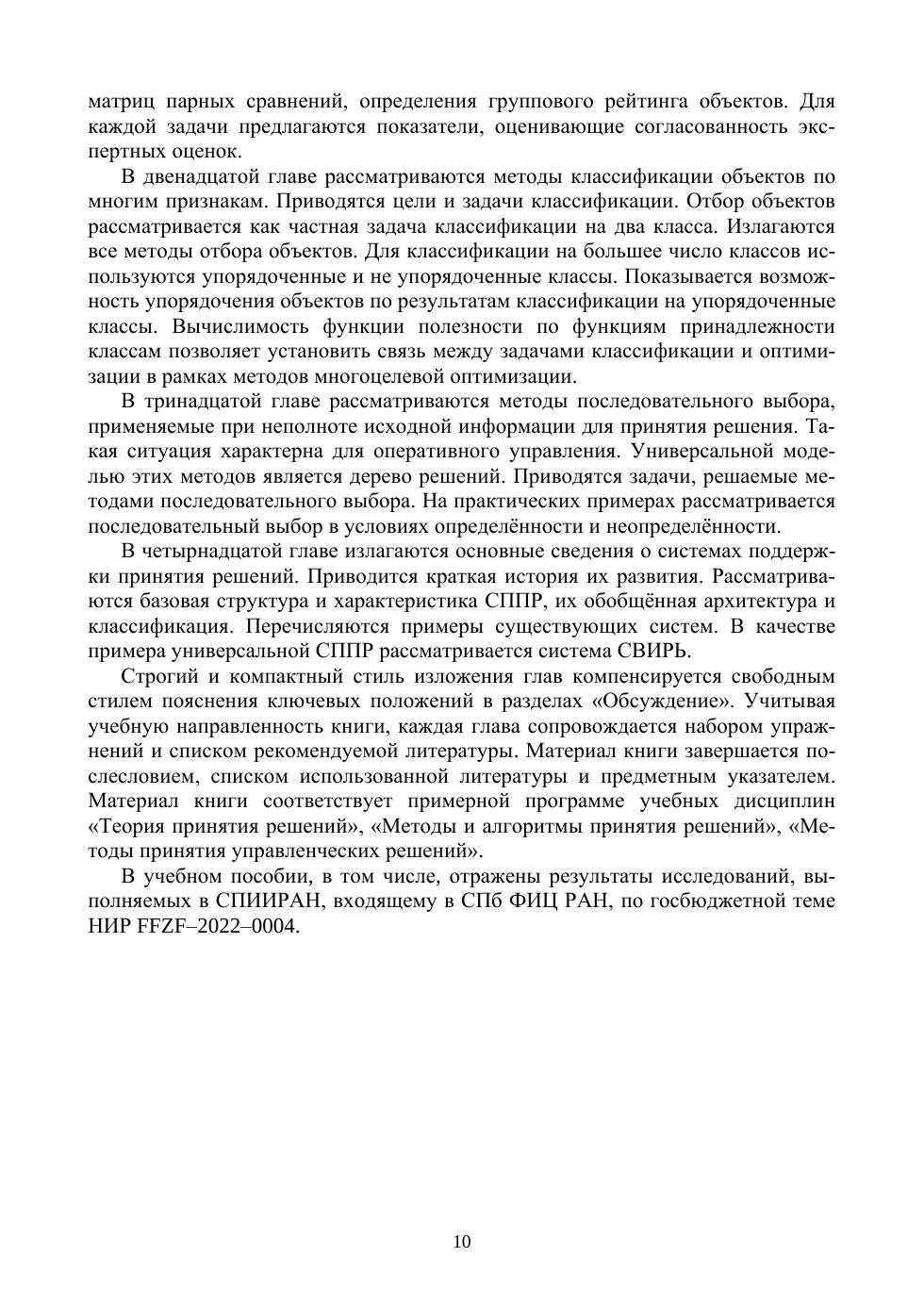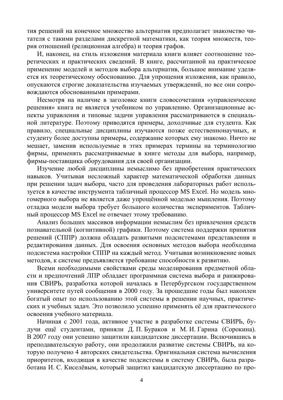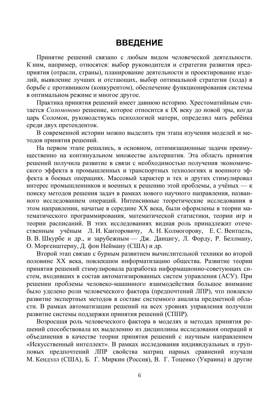 Из разнообразных задач принятия решений выделены задачи верхнего уровня управления, к которым относятся задачи отбора, выбора, ранжирования, классификации и последовательного поиска альтернатив, характеризуемых некоторой совокупностью показателей. На основе аксиом предпочтений ЛПР устанавливается взаимосвязь между моделями многомерного оценивания (ММО), разработанными в рамках разных теорий. Исследуются свойства оценочных функций показателей. Их систематизация позволяет связать различные методы ММО, включая методы диагностики. Проектирование моделей ММО основано на применении закономерностей системного анализа. Рассматриваются свойства матриц парных сравнений. Описываются формальные модели групповых предпочтений. Дается архитектура программной системы выбора и ранжирования СВИРЬ, использованной для расчёта ряда приводимых в книге примеров. Материал книги рассчитан на изучение дисциплины «Теория принятия решений» студентами и аспирантами, обучающимися по направлению «05.13.01 Системный анализ, управление и обработка информации». Он также может быть полезен специалистам в области управления и информационных технологий.