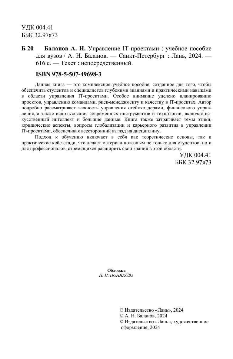 Данная книга — это комплексное учебное пособие, созданное для того, чтобы обеспечить студентов и специалистов глубокими знаниями и практическими навыками в области управления IT-проектами. Особое внимание уделено планированию проектов, управлению командами, риск-менеджменту и качеству в IT-проектах. Автор подробно рассматривает важность управления стейкхолдерами, финансового управления, а также использования современных инструментов и технологий, включая искусственный интеллект и большие данные. Книга также затрагивает темы этики, юридические аспекты, вопросы глобализации и карьерного развития в управлении IT-проектами, обеспечивая всесторонний взгляд на дисциплину. Подход к обучению включает в себя как теоретические основы, так и практические кейс-стади, что делает материал полезным не только для студентов, но и для профессионалов, стремящихся расширить свои знания в этой области.