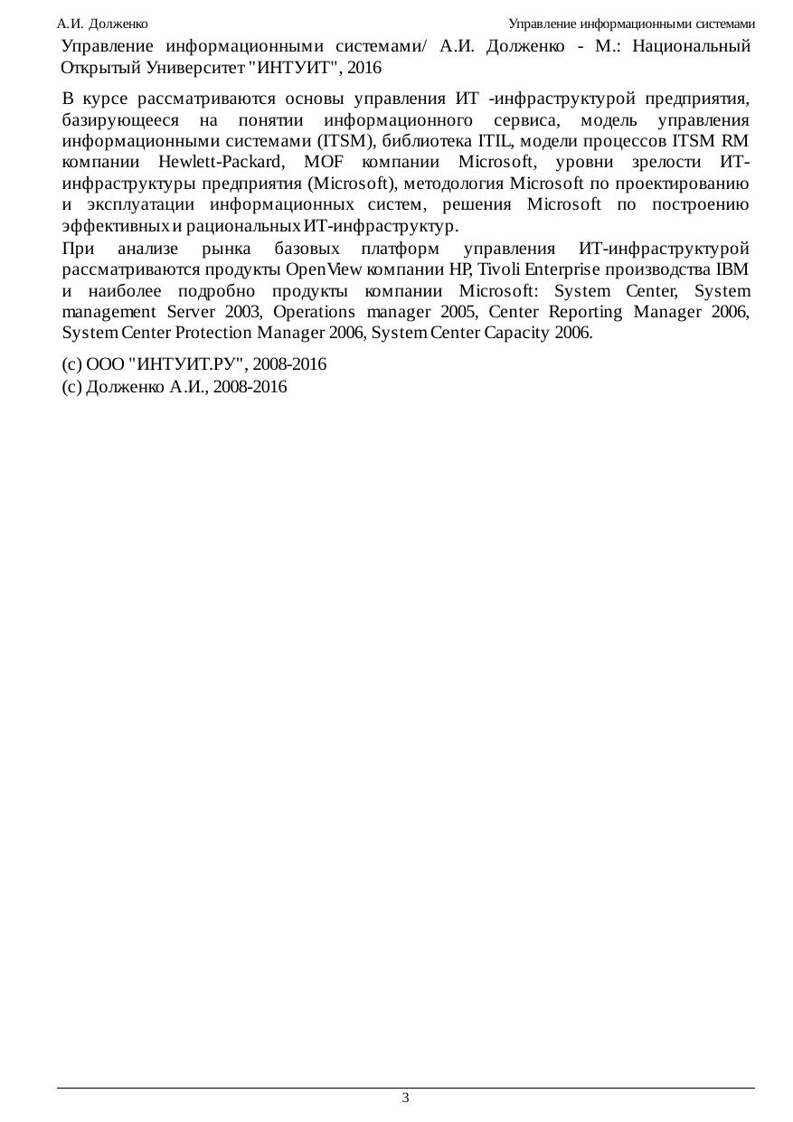 В курсе рассматриваются основы управления ИТ -инфраструктурой предприятия, базирующееся на понятии информационного сервиса, модель управления информационными системами (ITSM), библиотека ITIL, модели процессов ITSM RM компании Hewlett-Packard, MOF компании Microsoft, уровни зрелости ИТ-инфраструктуры предприятия (Microsoft), методология Microsoft по проектированию и эксплуатации информационных систем, решения Microsoft по построению эффективных и рациональных ИТ-инфраструктур. При анализе рынка базовых платформ управления ИТ-инфраструктурой рассматриваются продукты OpenView компании HP, Tivoli Enterprise производства IBM и наиболее подробно продукты компании Microsoft: System Center, System management Server 2003, Operations manager 2005, Center Reporting Manager 2006, System Center Protection Manager 2006, System Center Capacity 2006.