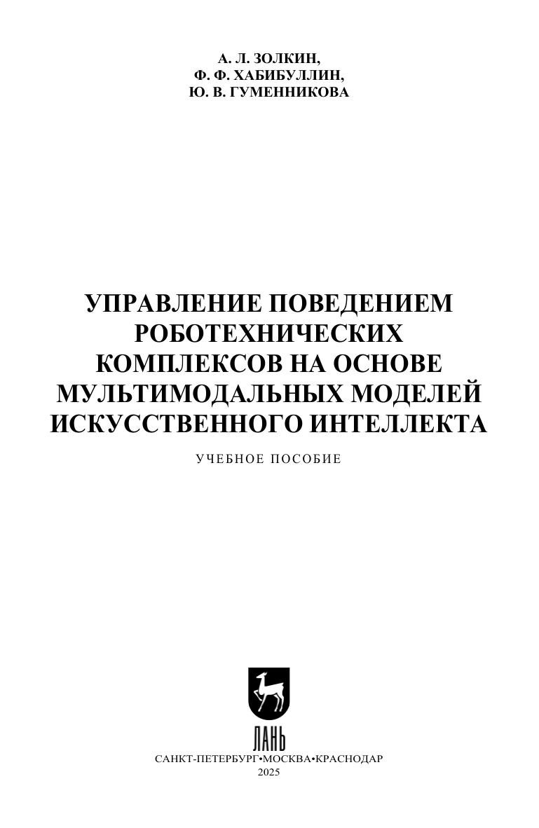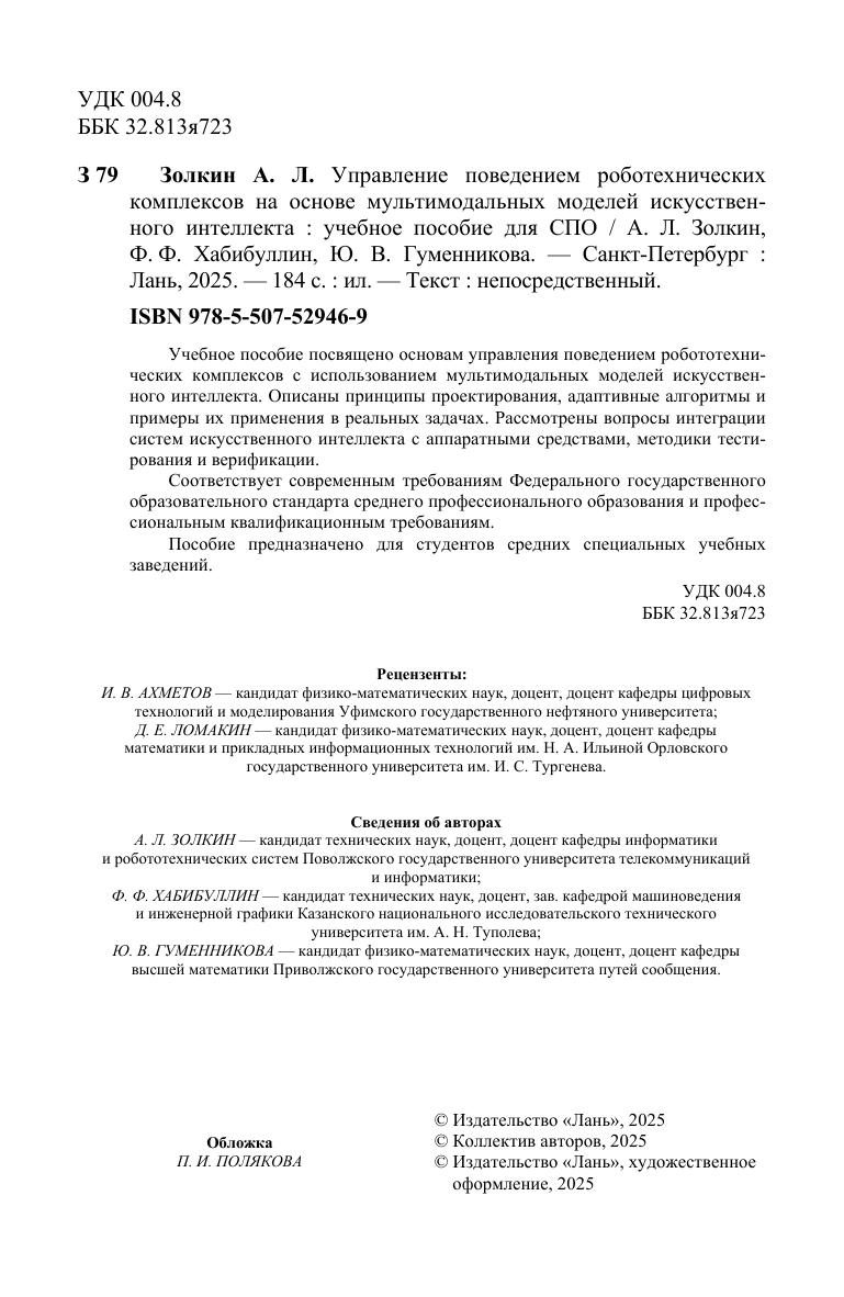 Учебное пособие посвящено основам управления поведением робототехнических комплексов с использованием мультимодальных моделей искусственного интеллекта. Описаны принципы проектирования, адаптивные алгоритмы и примеры их применения в реальных задачах. Рассмотрены вопросы интеграции систем искусственного интеллекта с аппаратными средствами, методики тестирования и верификации. Соответствует современным требованиям Федерального государственного образовательного стандарта среднего профессионального образования и профессиональным квалификационным требованиям. Пособие предназначено для студентов средних специальных учебных заведений.