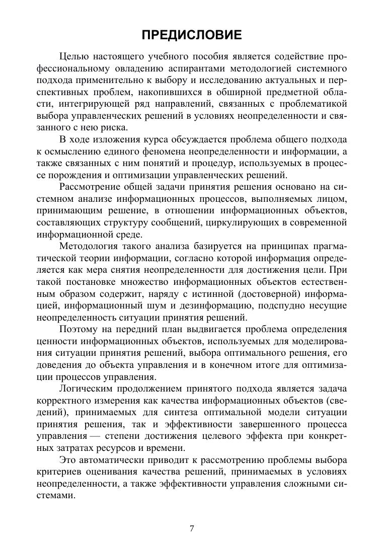 В данном учебном пособии изложены основные принципы и методология управления сложными организационно-техническими системами в условиях неопределенности и порождаемого ею риска. Изложение базируется на системном и информационном подходах к исследованию процессов управления. Главная особенность книги состоит в ее направленности на подготовку научных кадров, а также в том, что значительная часть ее содержания представляет собой обобщение материала оригинальных работ авторов, опубликованных в последние годы, и поэтому отражает современное состояние предметной области. Кроме того, большинство существующих книг по этой дисциплине акцентируют внимание на теоретико-игровом подходе, здесь же основное внимание уделяется принятию управленческих решений в условиях риска. Учебное пособие предназначено для аспирантов, обучающихся по специальности «Управление в организационных системах», а также по специальности «Системный анализ, управление и обработка информации», но может быть использовано для подготовки магистров и специалистов в области управления, в том числе с использованием информационных технологий.