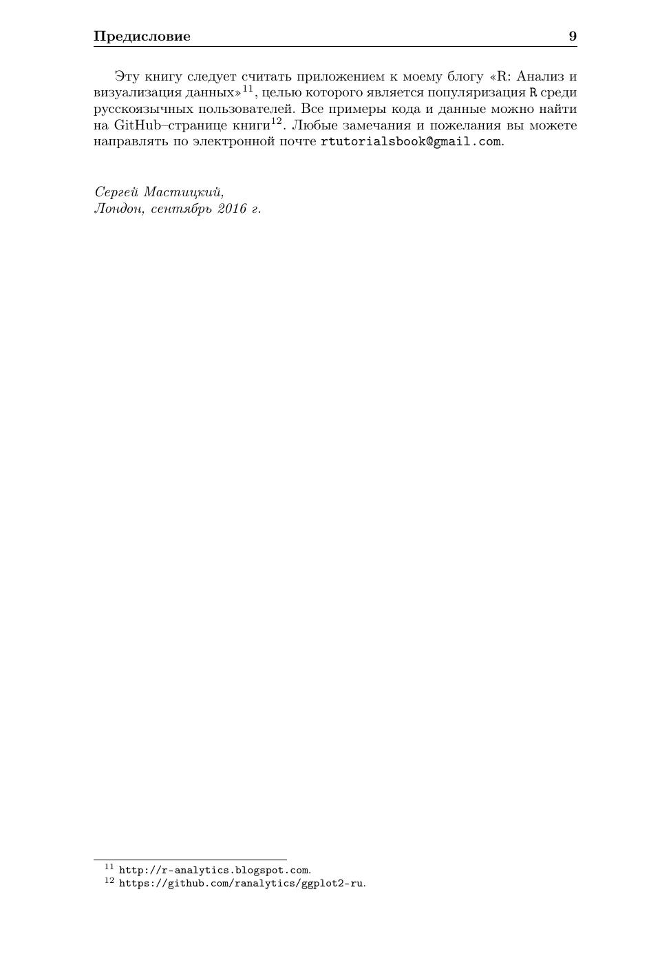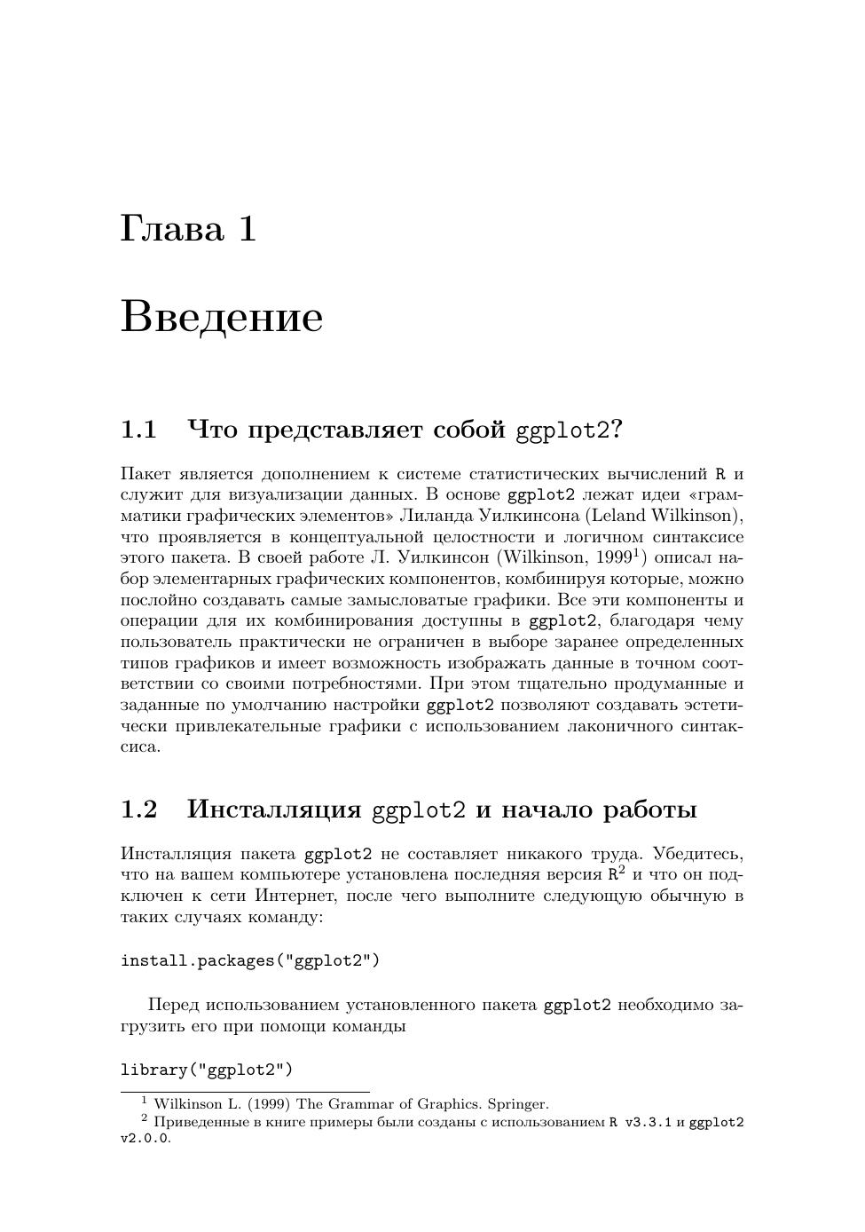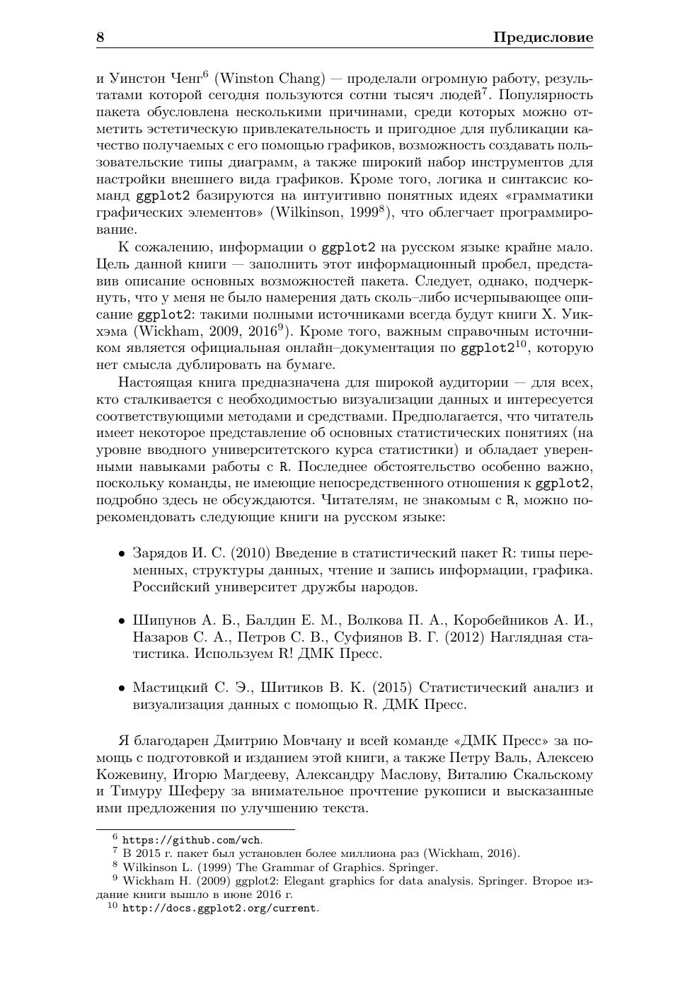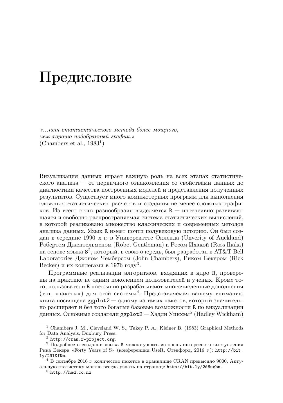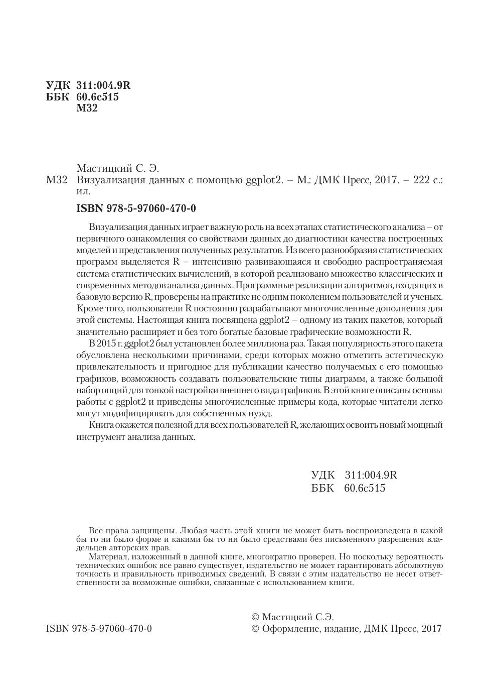 Визуализация данных играет важную роль на всех этапах статистического анализа – от первичного ознакомления со свойствами данных до диагностики качества построенных моделей и представления полученных результатов. Из всего разнообразия статистических программ выделяется R – интенсивно развивающаяся и свободно распространяемая система статистических вычислений, в которой реализовано множество классических и современных методов анализа данных. Программные реализации алгоритмов, входящих в базовую версию R, проверены на практике не одним поколением пользователей и ученых. Кроме того, пользователи R постоянно разрабатывают многочисленные дополнения для этой системы. Настоящая книга посвящена ggplot2 – одному из таких пакетов, который значительно расширяет и без того богатые базовые графические возможности R. В 2015 г. ggplot2 был установлен более миллиона раз. Такая популярность этого пакета обусловлена несколькими причинами, среди которых можно отметить эстетическую привлекательность и пригодное для публикации качество получаемых с его помощью графиков, возможность создавать пользовательские типы диаграмм, а также большой набор опций для тонкой настройки внешнего вида графиков. В этой книге описаны основы работы с ggplot2 и приведены многочисленные примеры кода, которые читатели легко могут модифицировать для собственных нужд. Книга окажется полезной для всех пользователей R, желающих освоить новый мощный инструмент анализа данных.