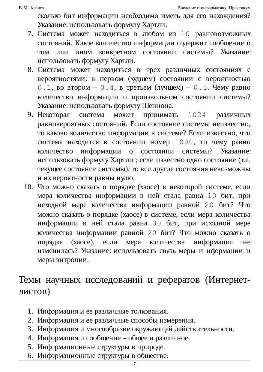 указания к решению и могут составить основу для практических работ. Приведены и лабораторные работы с указаниями к выполнению заданий, которые могут составить основу и для самостоятельной работы студентов. Этой же цели служат и темы рефератов и Интернет-листов к каждому занятию. Так как учебные планы по некоторым указанным специальностям предусматривают не практические, а