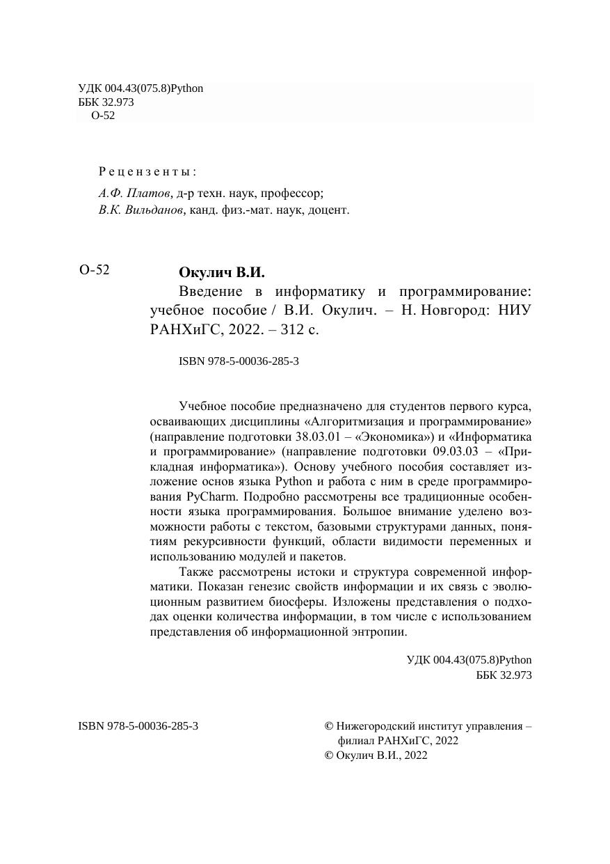 Учебное пособие предназначено для студентов первого курса, осваивающих дисциплины «Алгоритмизация и программирование» (направление подготовки 38.03.01 – «Экономика») и «Информатика и программирование» (направление подготовки 09.03.03 – «Прикладная информатика»). Основу учебного пособия составляет изложение основ языка Python и работа с ним в среде программирования PyCharm. Подробно рассмотрены все традиционные особенности языка программирования. Большое внимание уделено возможности работы с текстом, базовыми структурами данных, понятиям рекурсивности функций, области видимости переменных и использованию модулей и пакетов. Также рассмотрены истоки и структура современной информатики. Показан генезис свойств информации и их связь с эволюционным развитием биосферы. Изложены представления о подходах оценки количества информации, в том числе с использованием представления об информационной энтропии.
