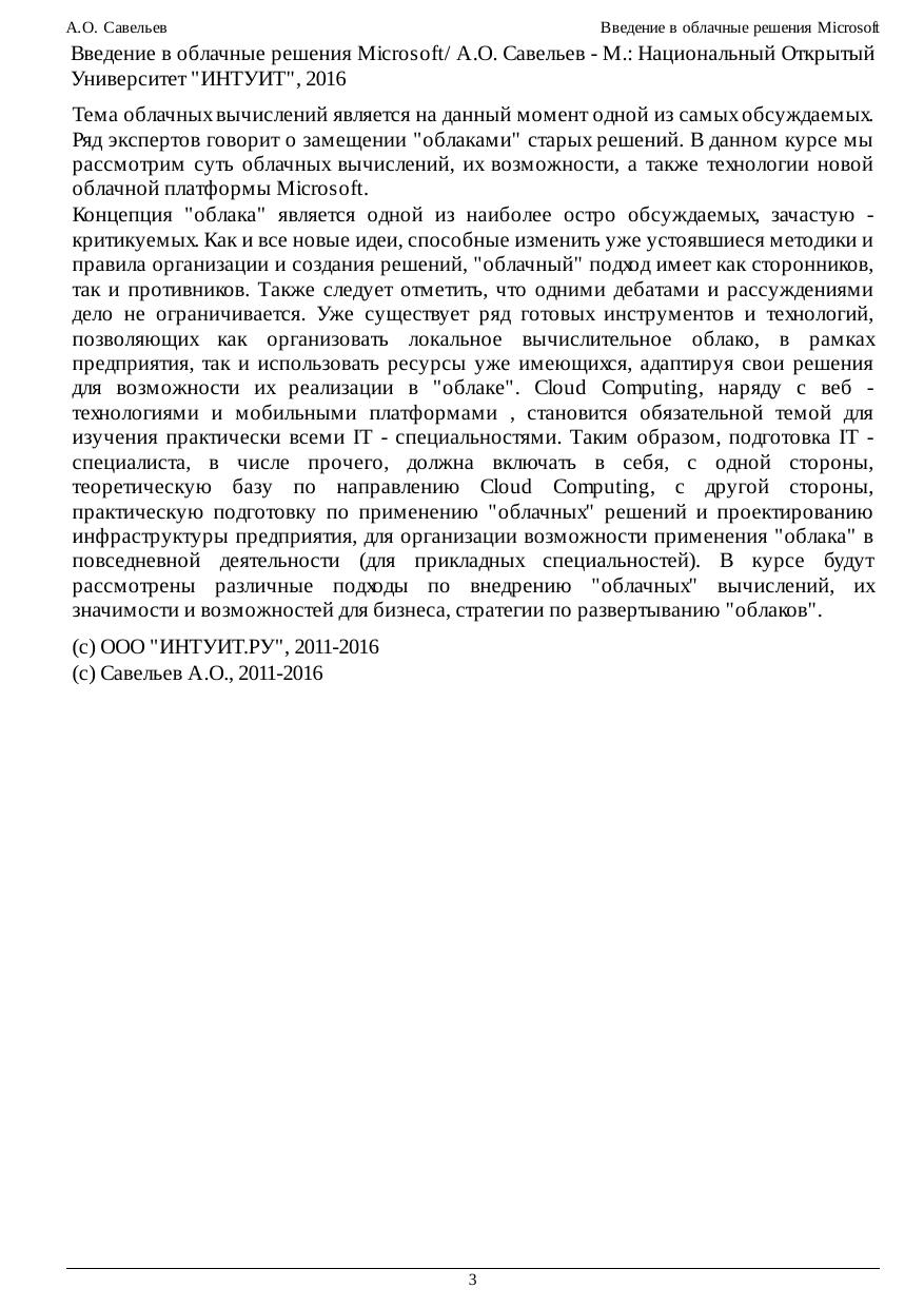 позволяющих как организовать локальное вычислительное облако, в рамках предприятия, так и использовать ресурсы уже имеющихся, адаптируя свои решения для возможности их реализации в "облаке". Cloud Computing, наряду с веб - технологиями и мобильными платформами , становится обязательной темой для изучения практически всеми IT - специальностями. Таким образом, подготовка IT - специалиста, в числе прочего, должна включать в себя, с одной стороны, теоретическую базу по направлению Cloud Computing, с другой стороны, практическую подготовку по применению "облачных" решений и проектированию инфраструктуры предприятия, для организации возможности применения "облака" в повседневной деятельности (для прикладных специальностей). В курсе будут рассмотрены различные подходы по внедрению "облачных" вычислений, их значимости и возможностей для бизнеса, стратегии по развертыванию "облаков".