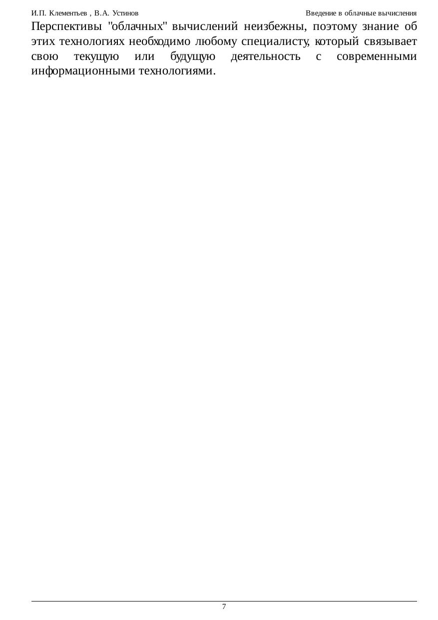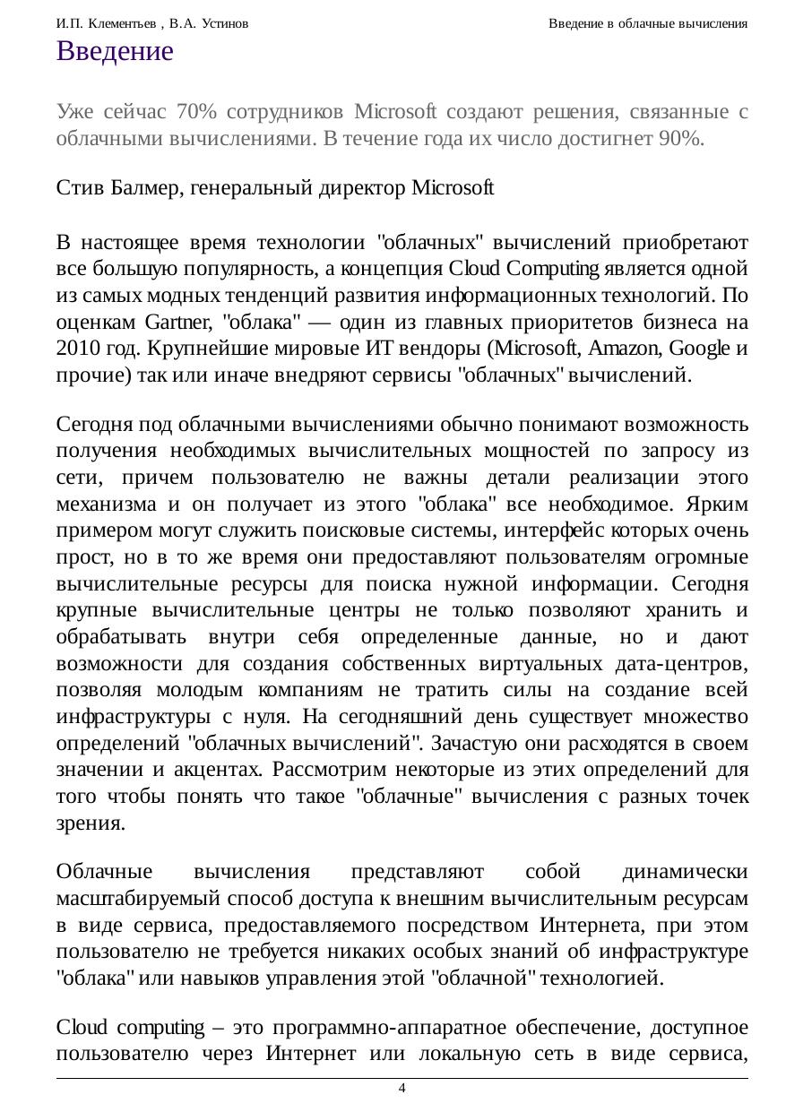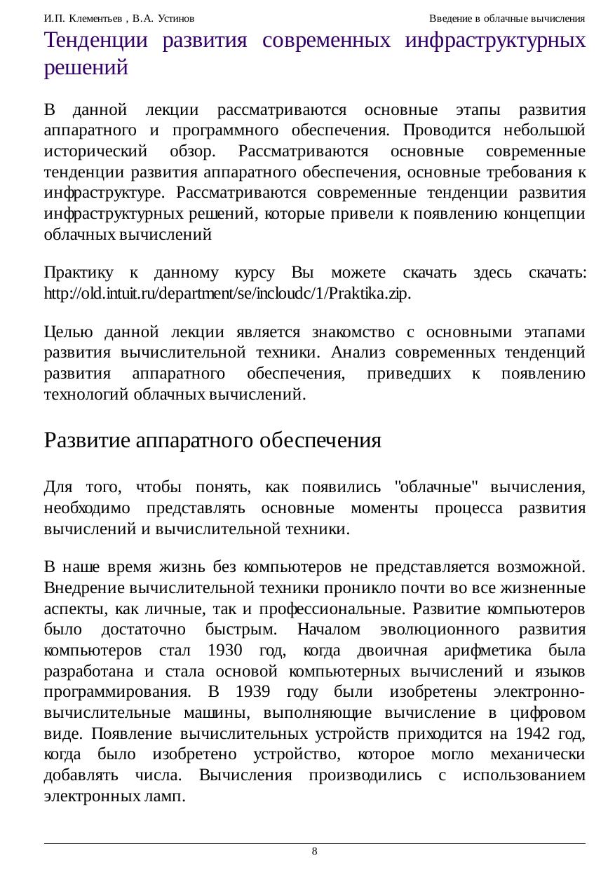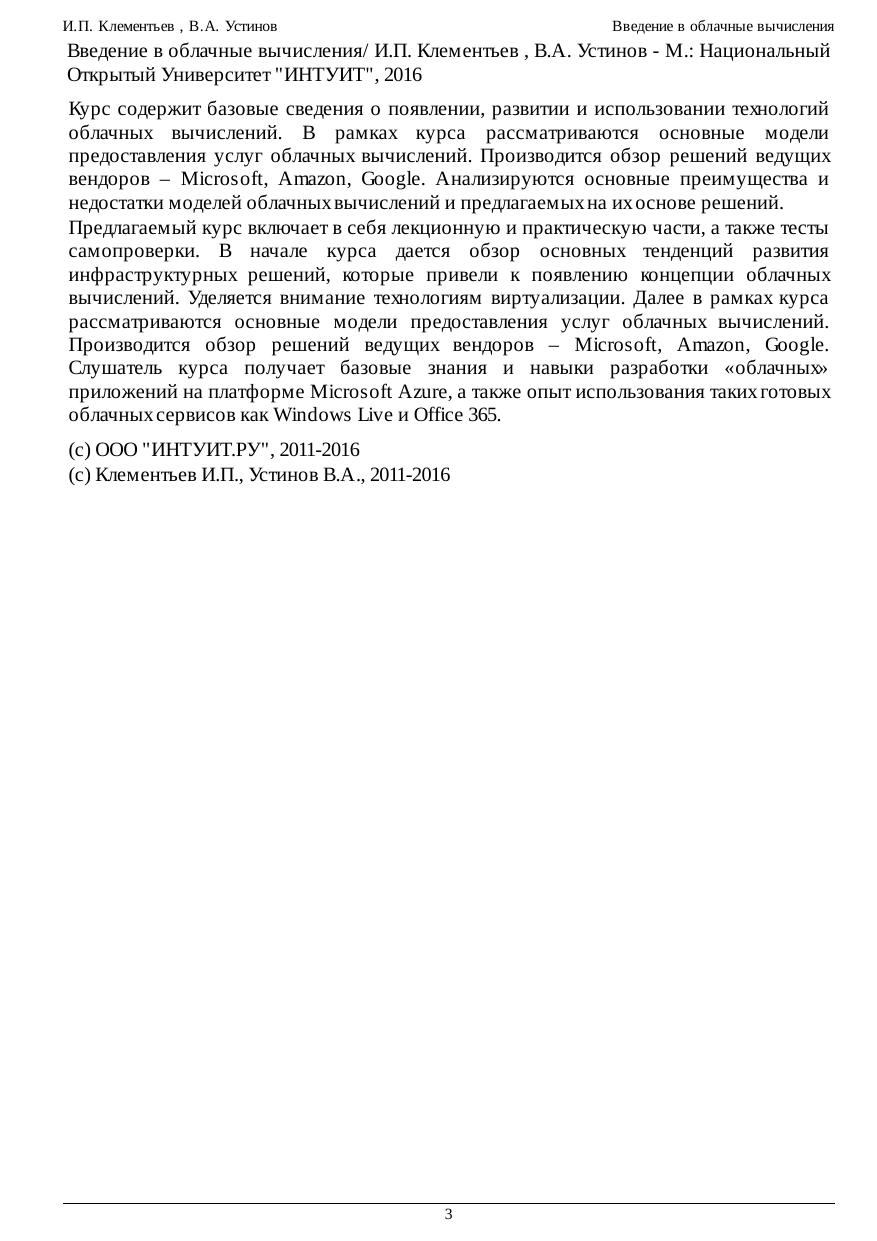 Курс содержит базовые сведения о появлении, развитии и использовании технологий облачных вычислений. В рамках курса рассматриваются основные модели предоставления услуг облачных вычислений. Производится обзор решений ведущих вендоров – Microsoft, Amazon, Google. Анализируются основные преимущества и недостатки моделей облачных вычислений и предлагаемых на их основе решений. Предлагаемый курс включает в себя лекционную и практическую части, а также тесты самопроверки. В начале курса дается обзор основных тенденций развития инфраструктурных решений, которые привели к появлению концепции облачных вычислений. Уделяется внимание технологиям виртуализации. Далее в рамках курса рассматриваются основные модели предоставления услуг облачных вычислений. Производится обзор решений ведущих вендоров – Microsoft, Amazon, Google. Слушатель курса получает базовые знания и навыки разработки «облачных» приложений на платформе Microsoft Azure, а также опыт использования таких готовых облачных сервисов как Windows Live и Office 365.