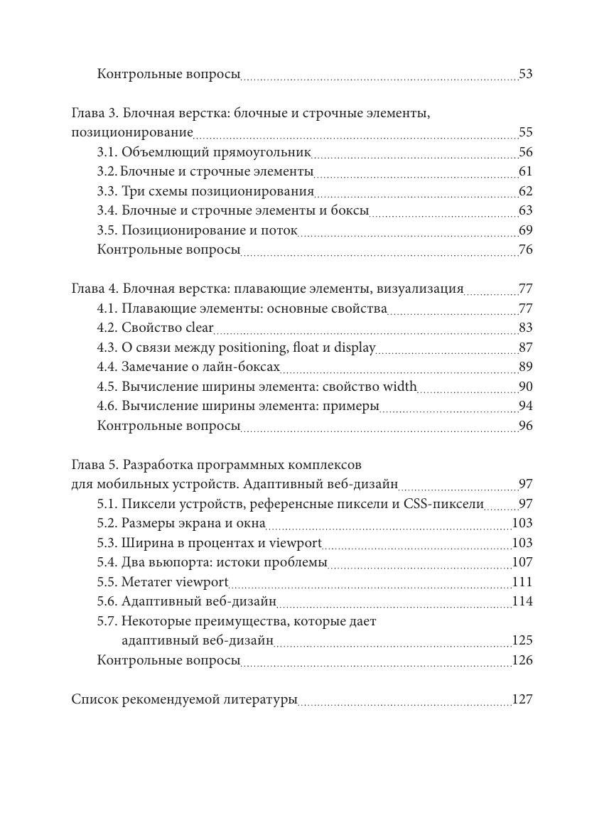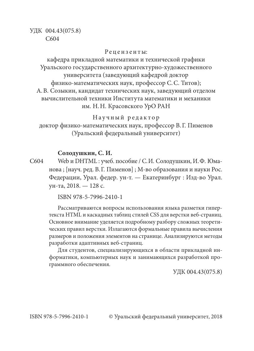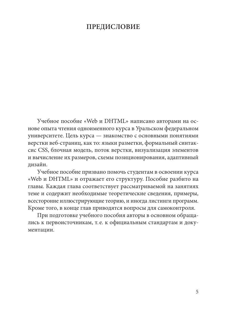 Рассматриваются вопросы использования языка разметки гипертекста HTML и каскадных таблиц стилей CSS для верстки веб‑страниц. Основное внимание уделяется подробному разбору сложных теоретических правил верстки. Излагаются формальные правила вычисления размеров и положения элементов на странице. Анализируются методы разработки адаптивных веб‑страниц. Для студентов, специализирующихся в области прикладной информатики, компьютерных наук и занимающихся разработкой программного обеспечения.