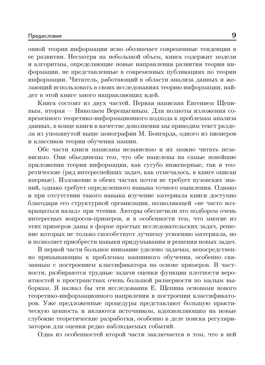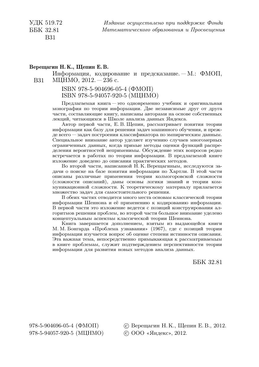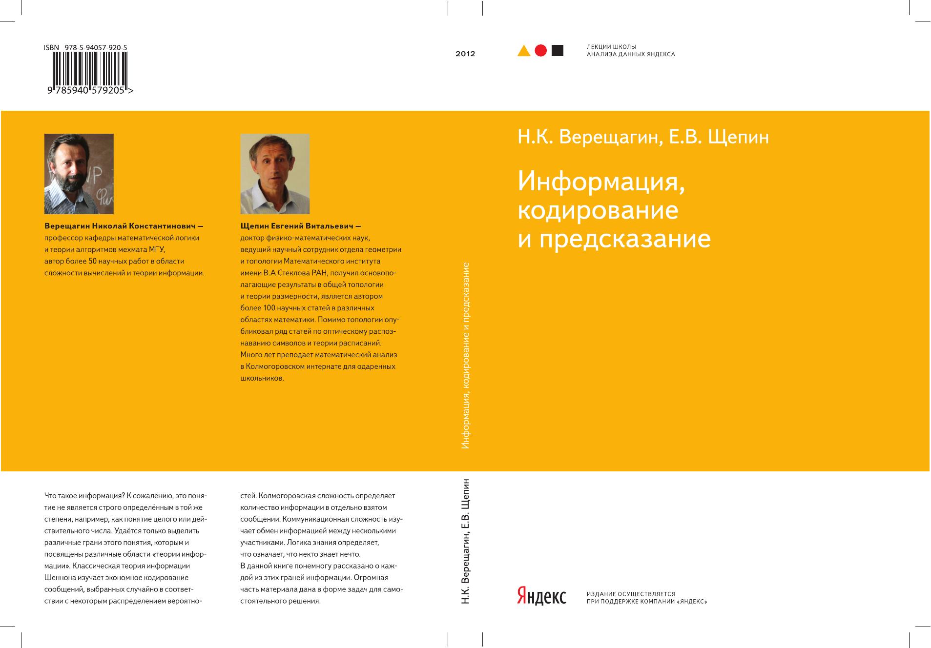 Предлагаемая книга - это одновременно учебник и оригинальная монография по теории информации. Две независимые друг от друга части, составляющие книгу, написаны авторами на основе собственных лекций, читающихся в Школе анализа данных Яндекса. Автор первой части, Е.В. Щепин, рассматривает понятия теории информации как базу для решения задач машинного обучения, и прежде всего - задач построения классификатора по эмпирическим данным. Специальное внимание автор уделяет изучению случаев многомерных ограниченных данных, когда прямые методы оценки функций распределения вероятностей неприменимы. Обсуждение этих вопросов редко встречается в работах по теории информации. В предлагаемой книге изложение доведено до описания практических методов. Во второй части, написанной Н.К. Верещагиным, исследуются задачи о поиске на базе понятия информации по Хартли. В этой части описаны различные применения теории колмогоровской сложности (сложности описаний), даны основы логики знаний и теории коммуникационной сложности. К теоретическому материалу прилагается множество задач для самостоятельного решения. В обеих частях отводится много места основам классической теории информации Шеннона и её применению к кодированию информации. В первой части это изложение ведется с позиций конструирования алгоритмов решения проблем, во второй части большое внимание уделено концептуальным аспектам классической теории Шеннона. Книга завершается дополнением, взятым из выдающейся книги М.М. Бонгарда «Проблема узнавания» (1967), где с позиций теории информации изучается вопрос об оценке степени истинности описания. Эта важная тема, непосредственно примыкающая к рассматриваемым в книге проблемам, служит подтверждением перспективности теории информации для развития новых методов анализа данных.