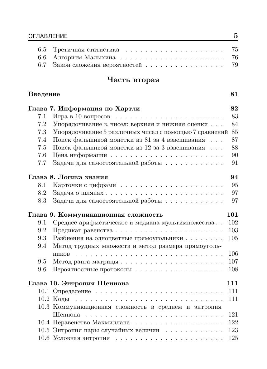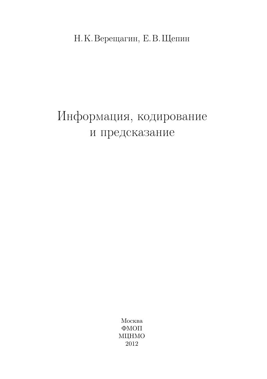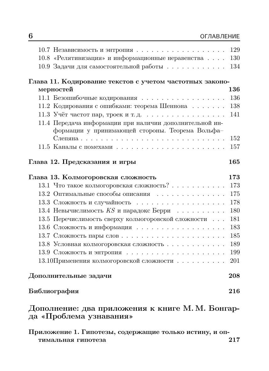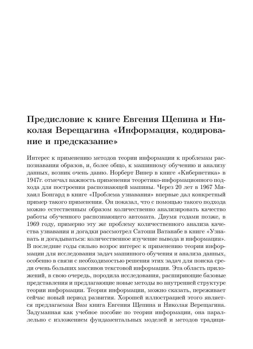 Предлагаемая книга - это одновременно учебник и оригинальная монография по теории информации. Две независимые друг от друга части, составляющие книгу, написаны авторами на основе собственных лекций, читающихся в Школе анализа данных Яндекса. Автор первой части, Е.В. Щепин, рассматривает понятия теории информации как базу для решения задач машинного обучения, и прежде всего - задач построения классификатора по эмпирическим данным. Специальное внимание автор уделяет изучению случаев многомерных ограниченных данных, когда прямые методы оценки функций распределения вероятностей неприменимы. Обсуждение этих вопросов редко встречается в работах по теории информации. В предлагаемой книге изложение доведено до описания практических методов. Во второй части, написанной Н.К. Верещагиным, исследуются задачи о поиске на базе понятия информации по Хартли. В этой части описаны различные применения теории колмогоровской сложности (сложности описаний), даны основы логики знаний и теории коммуникационной сложности. К теоретическому материалу прилагается множество задач для самостоятельного решения. В обеих частях отводится много места основам классической теории информации Шеннона и её применению к кодированию информации. В первой части это изложение ведется с позиций конструирования алгоритмов решения проблем, во второй части большое внимание уделено концептуальным аспектам классической теории Шеннона. Книга завершается дополнением, взятым из выдающейся книги М.М. Бонгарда «Проблема узнавания» (1967), где с позиций теории информации изучается вопрос об оценке степени истинности описания. Эта важная тема, непосредственно примыкающая к рассматриваемым в книге проблемам, служит подтверждением перспективности теории информации для развития новых методов анализа данных.