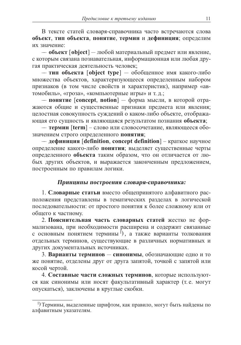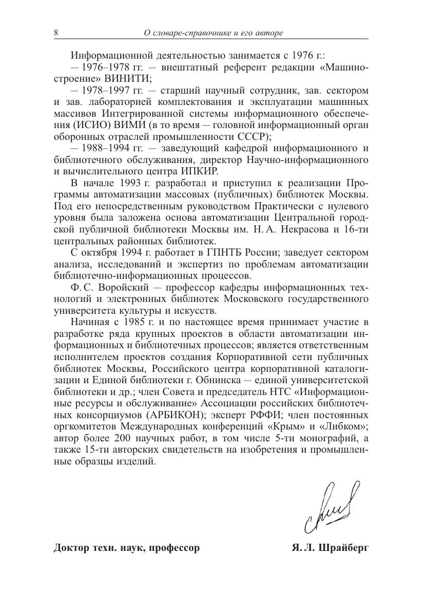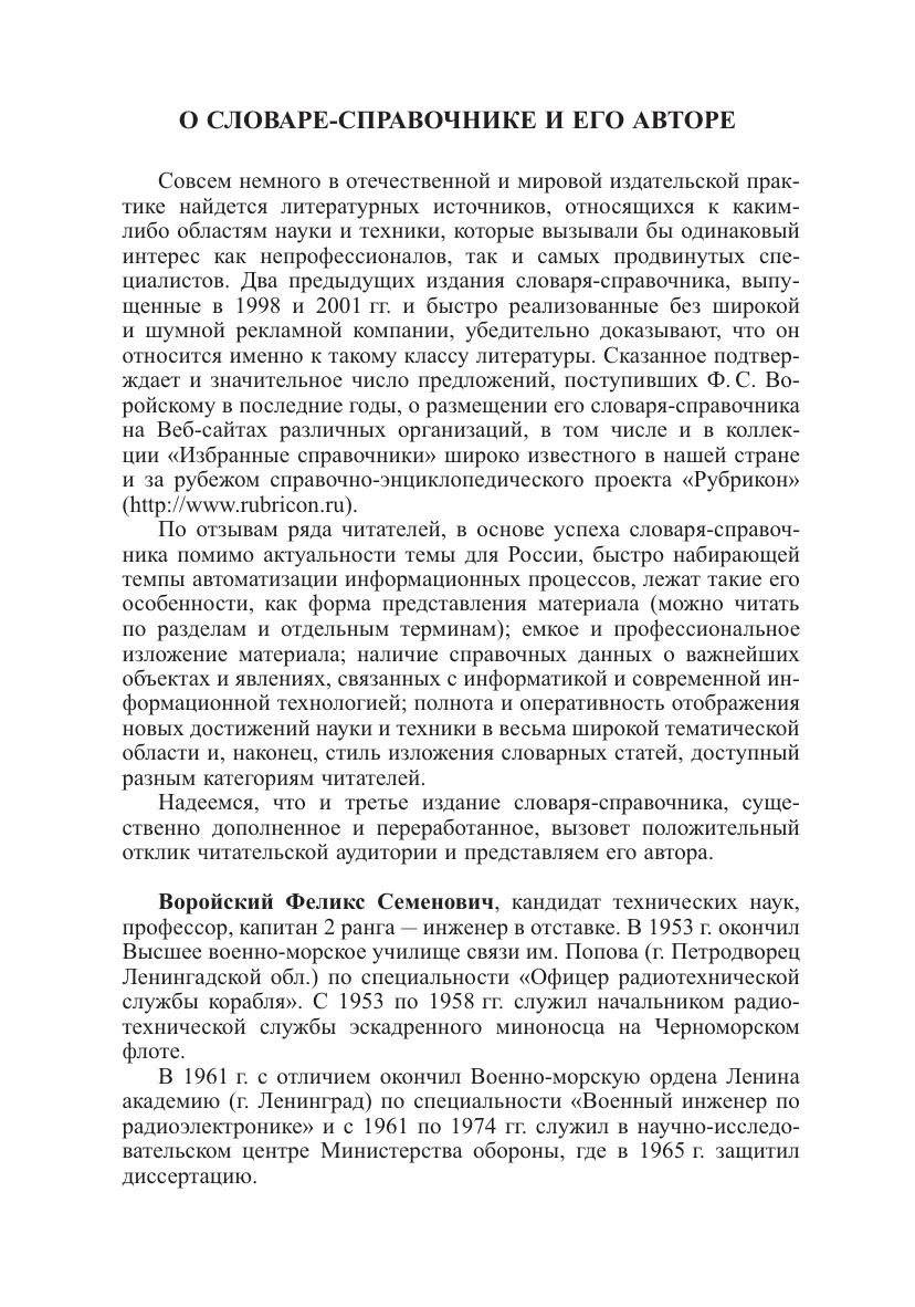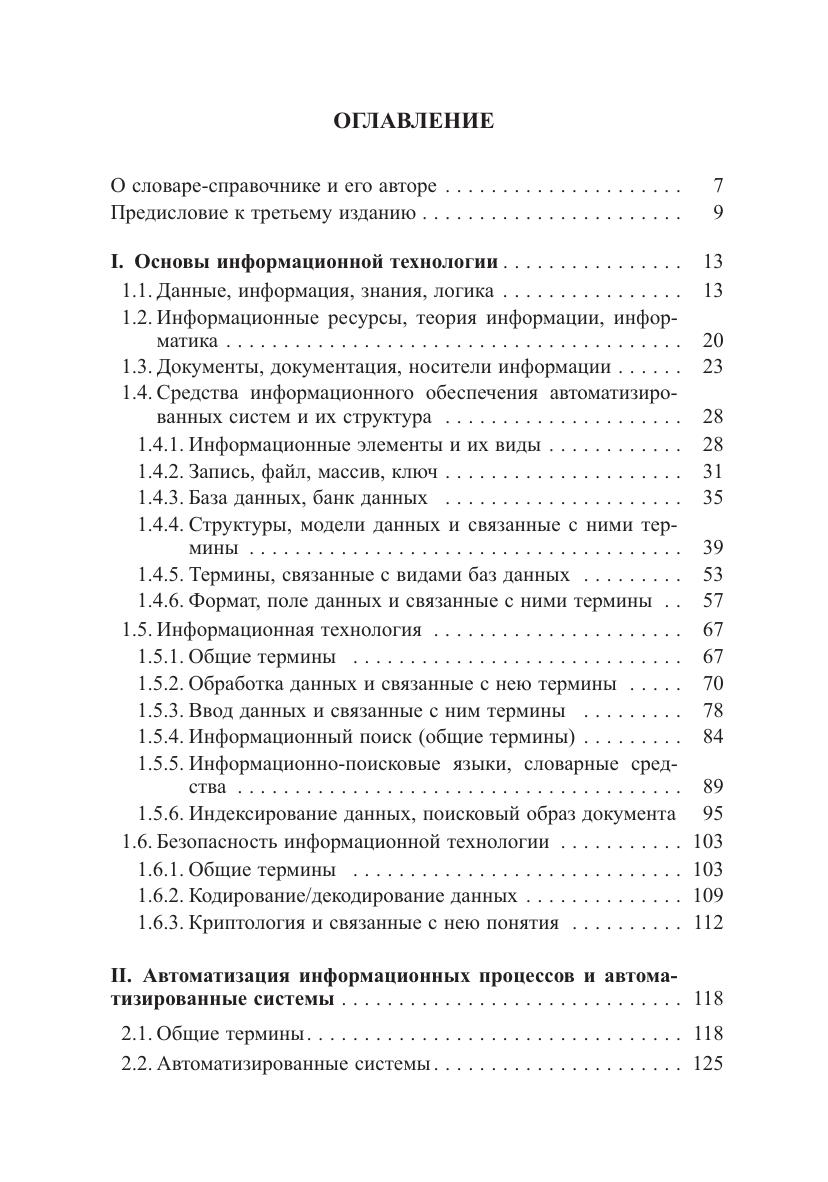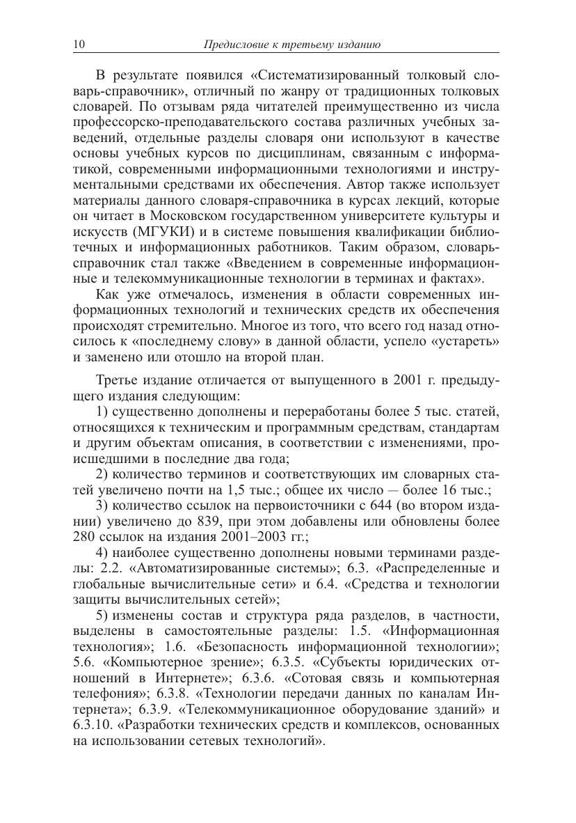 Толковый словарь-справочник, содержит 16 тыс. русско- и англоязычных терминов, расположенных в логической последовательности по тематическим направлениям: «Основы информационной технологии», «Автоматизация информационных процессов и автоматизированные системы», «Средства технического обеспечения автоматизированных систем», «Средства программного обеспечения автоматизированных систем», «Мультимедиа, гипермедиа, виртуальная реальность и машинное зрение», «Сетевые технологии обработки и передачи данных». Словарь-справочник ориентирован на широкий круг читателей - преимущественно не специалистов в области вычислительной техники и программирования, использующих в своей деятельности современные программно-технические средства, информационные и телекоммуникационные технологии. Он может использоваться в учебных процессах профессорско-преподавательским составом и студентами вузов, а также квалифицированными техническими специалистами при разработке и эксплуатации разного рода автоматизированных информационных, библиотечно-информационных и других систем по смежным для них областям знаний.
