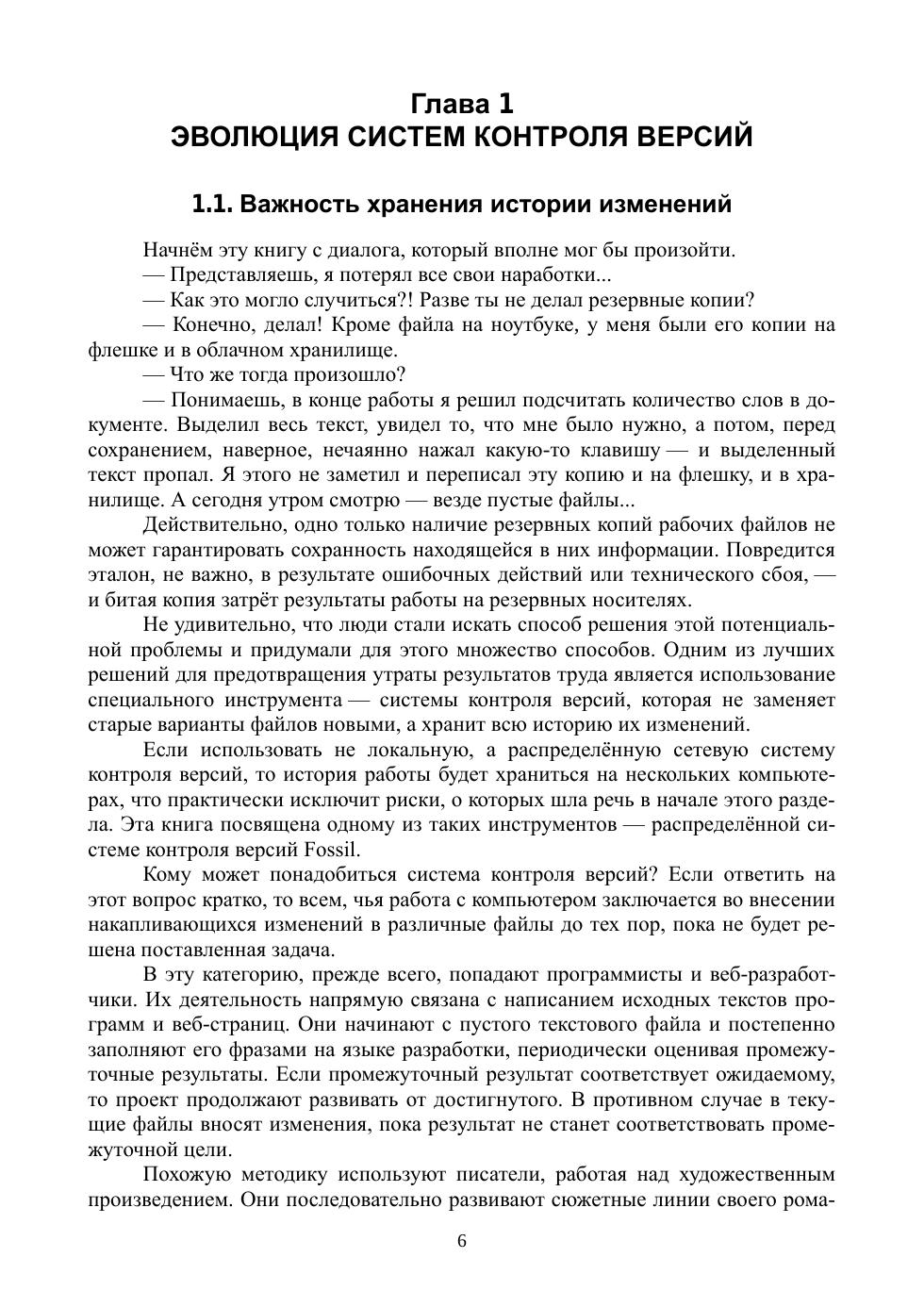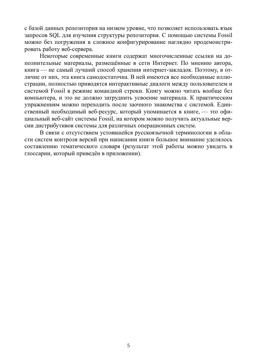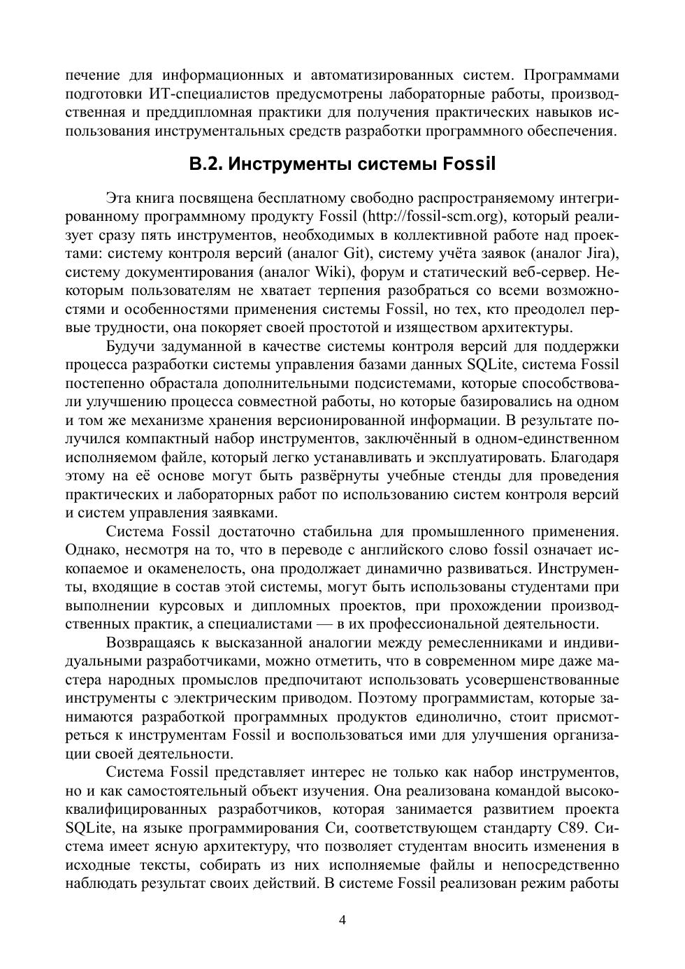 Учебное пособие посвящено свободно распространяемому программному продукту Fossil, который представляет собой интегрированный набор инструментальных средств разработки программного обеспечения, предназначенных для улучшения процесса коллективной работы над проектами. В состав Fossil входят: система контроля версий (version control system), система учёта заявок на доработку (bug tracking system), система документирования (Wiki), форум, веб-сервер. В книге рассматривается учебный пример разработки простого веб-сайта командой из четырёх участников, которые используют инструменты Fossil для организации совместной работы. Пособие предназначено для студентов младших курсов IT-специальностей и может быть рекомендовано широкому кругу читателей для начального ознакомления с современными инструментами коллективной работы над проектами. Большое количество иллюстраций и примеров облегчат новичку изучение нового инструмента, а профессионал сможет быстро оценить возможности системы Fossil и принять решение о целесообразности использования её в своей деятельности.