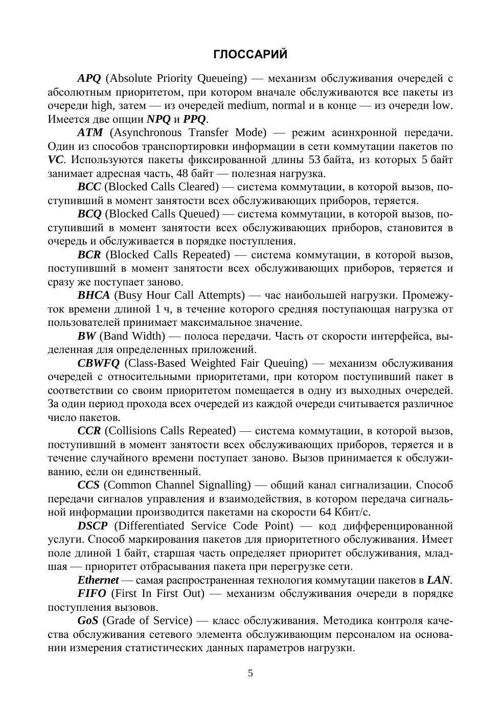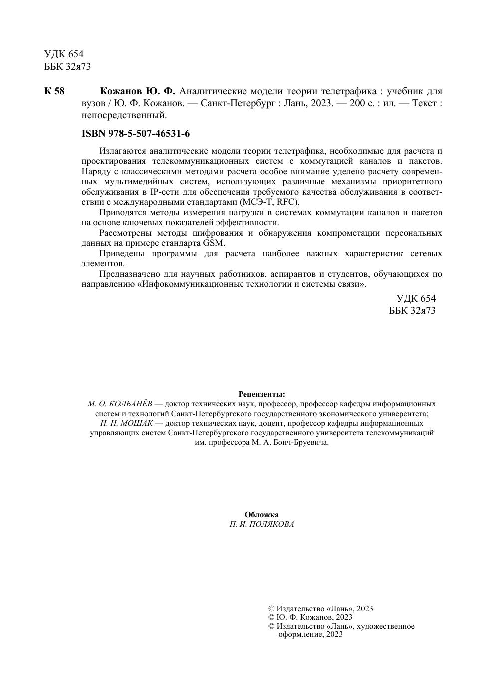Излагаются аналитические модели теории телетрафика, необходимые для расчета и проектирования телекоммуникационных систем с коммутацией каналов и пакетов. Наряду с классическими методами расчета особое внимание уделено расчету современных мультимедийных систем, использующих различные механизмы приоритетного обслуживания в IP-сети для обеспечения требуемого качества обслуживания в соответствии с международными стандартами (МСЭ-Т, RFC). Приводятся методы измерения нагрузки в системах коммутации каналов и пакетов на основе ключевых показателей эффективности. Рассмотрены методы шифрования и обнаружения компрометации персональных данных на примере стандарта GSM. Приведены программы для расчета наиболее важных характеристик сетевых элементов. Предназначено для научных работников, аспирантов и студентов, обучающихся по направлению «Инфокоммуникационные технологии и системы связи».