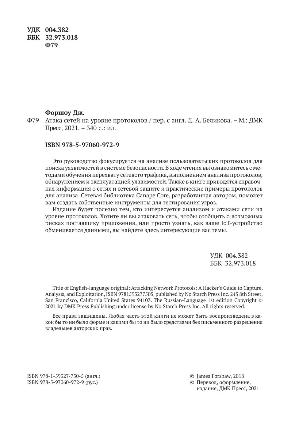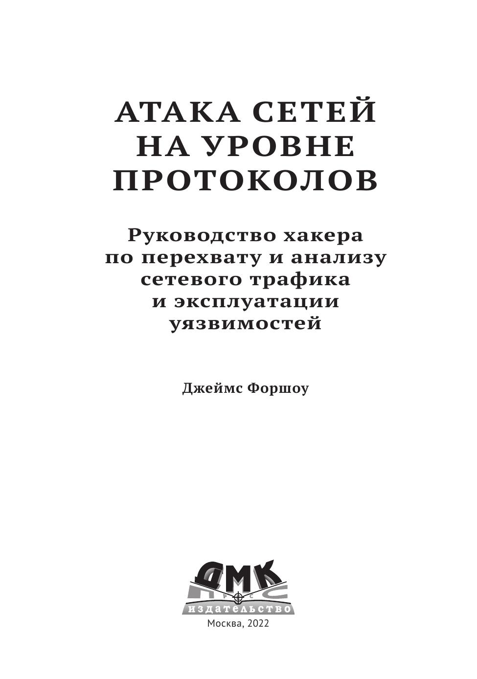 Книга пригодится специалистам, которые занимаются тестированием на проникновение и исследуют программные ошибки, а также разра-ботчикам, которым важно понимать и выявлять сетевые уязвимости.
