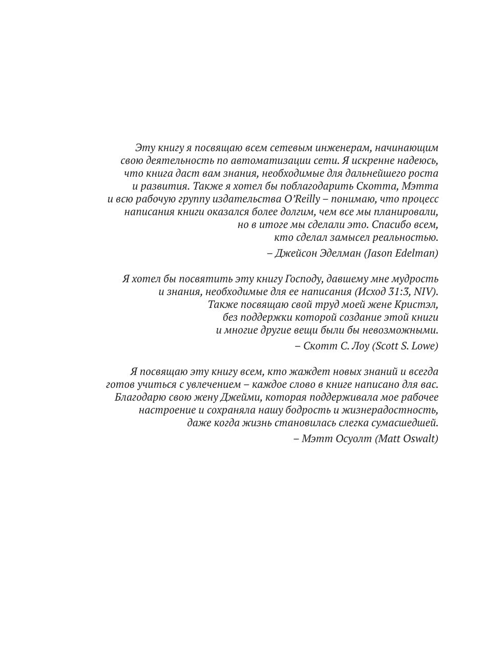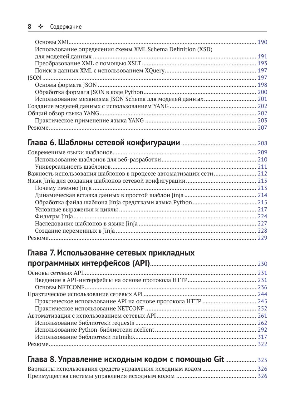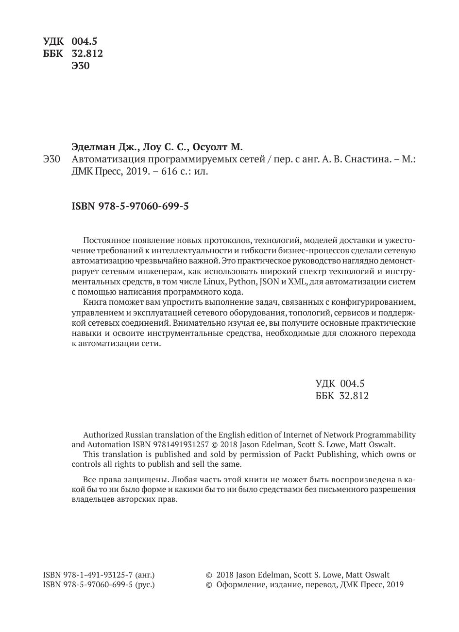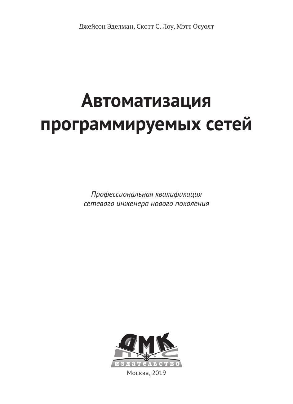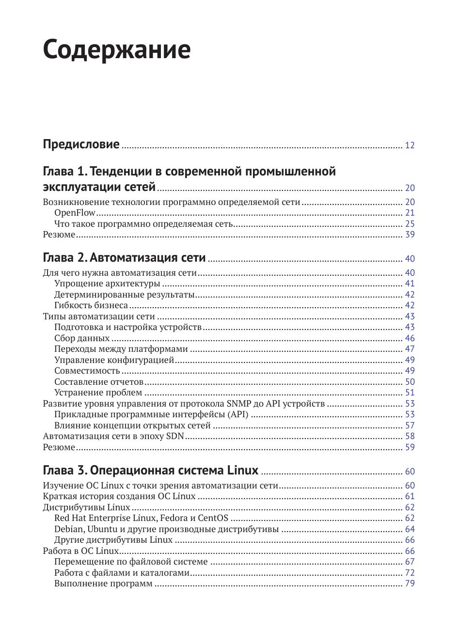 Постоянное появление новых протоколов, технологий, моделей доставки и ужесточение требований к интеллектуальности и гибкости бизнес-процессов сделали сетевую автоматизацию чрезвычайно важной. Это практическое руководство наглядно демонстрирует сетевым инженерам, как использовать широкий спектр технологий и инструментальных средств, в том числе Linux, Python, JSON и XML, для автоматизации систем с помощью написания программного кода. Книга поможет вам упростить выполнение задач, связанных с конфигурированием, управлением и эксплуатацией сетевого оборудования, топологий, сервисов и поддержкой сетевых соединений. Внимательно изучая ее, вы получите основные практические навыки и освоите инструментальные средства, необходимые для сложного перехода к автоматизации сети.