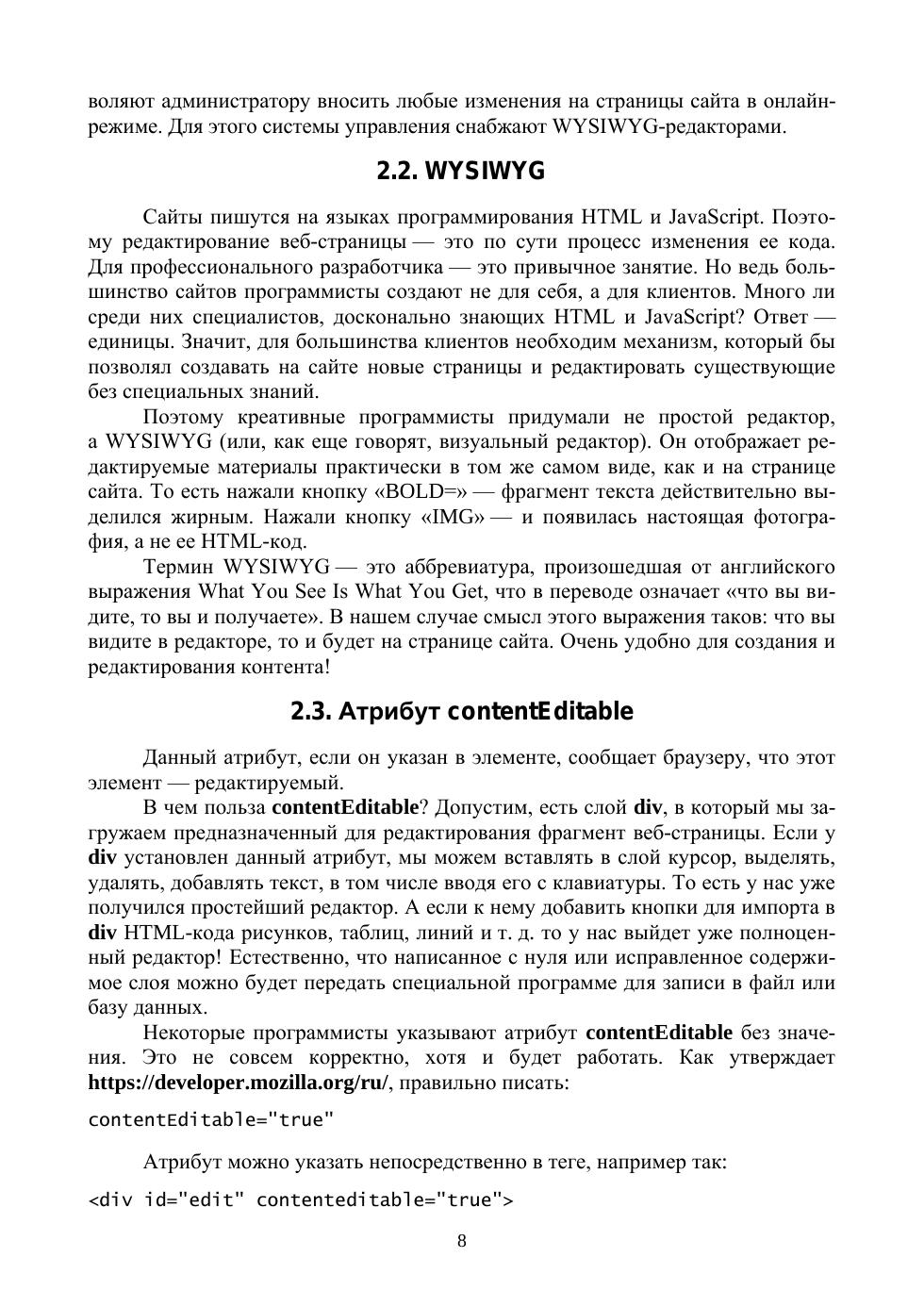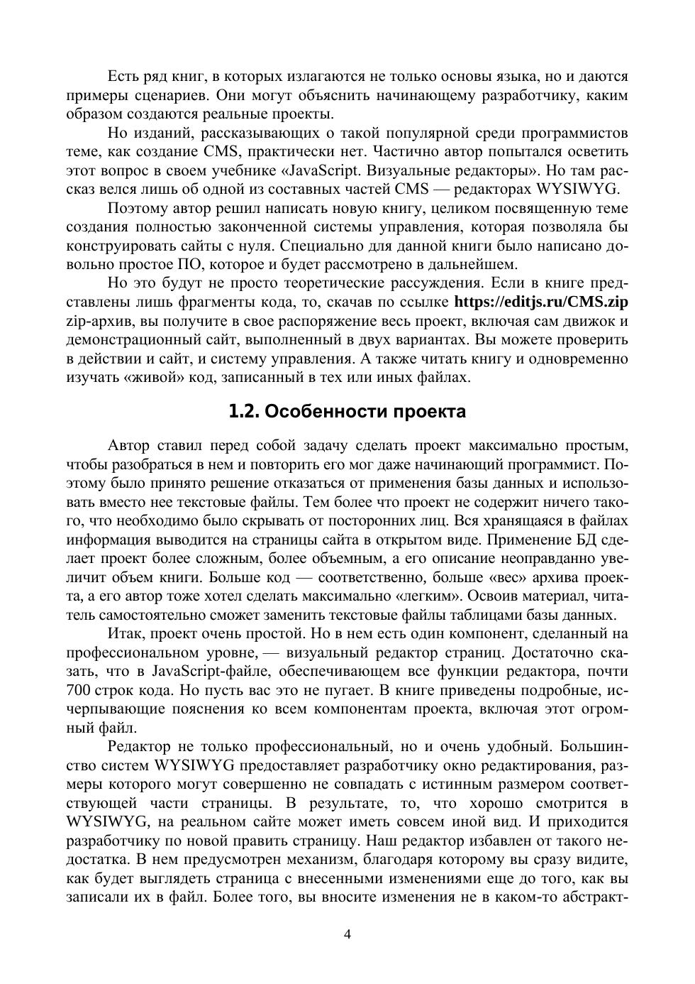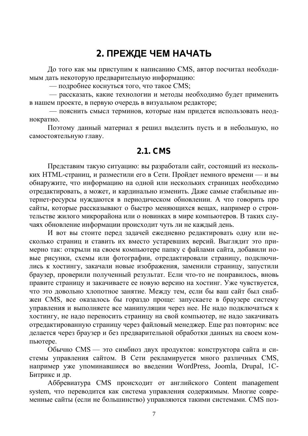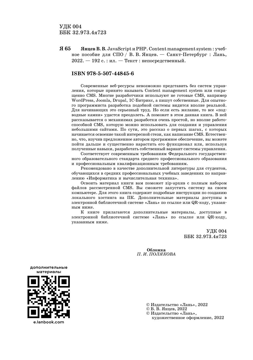 Современные веб-ресурсы невозможно представить без систем управления, которые принято называть Content management system или сокращенно CMS. Многие разработчики используют не готовые CMS, например WordPress, Joomla, Drupal, 1С-Битрикс, а пишут собственные. Для опытного программиста разработка подобной системы видится вполне реальной. Для начинающих это серьезный труд. Но если есть желание, то все «подводные камни» удастся преодолеть. А поможет в этом данная книга. В ней рассказывается о механизмах разработки очень простой, но вполне работоспособной CMS, которую можно использовать для создания и управления небольшими сайтами. По сути, это рассказ о первых шагах, с которых начинается освоение такой интересной стези, как написание CMS. Естественно, что, изучив предложенное автором программное обеспечение, вы можете пойти дальше и существенно нарастить его функционал или, используя полученные навыки, разработать собственный вариант системы управления. Соответствует современным требованиям Федерального государственного образовательного стандарта среднего профессионального образования и профессиональным квалификационным требованиям. Рекомендовано в качестве дополнительной литературы для студентов, обучающихся в средних профессиональных учебных заведениях по направлению «Информатика и вычислительная техника». Освоить материал книги вам поможет zip-архив с полным набором файлов рассмотренной CMS. Вы сможете запустить систему на своем компьютере. Для этого книга содержит подробные инструкции по созданию локального хостинга на ПК. Дополнительные материалы доступны в электронной библиотечной системе «Лань» по ссылке или QR-коду, указанным ниже. К книге прилагаются дополнительные материалы, доступные в электронной библиотечной системе «Лань» по ссылке или QR-коду, указанным ниже.