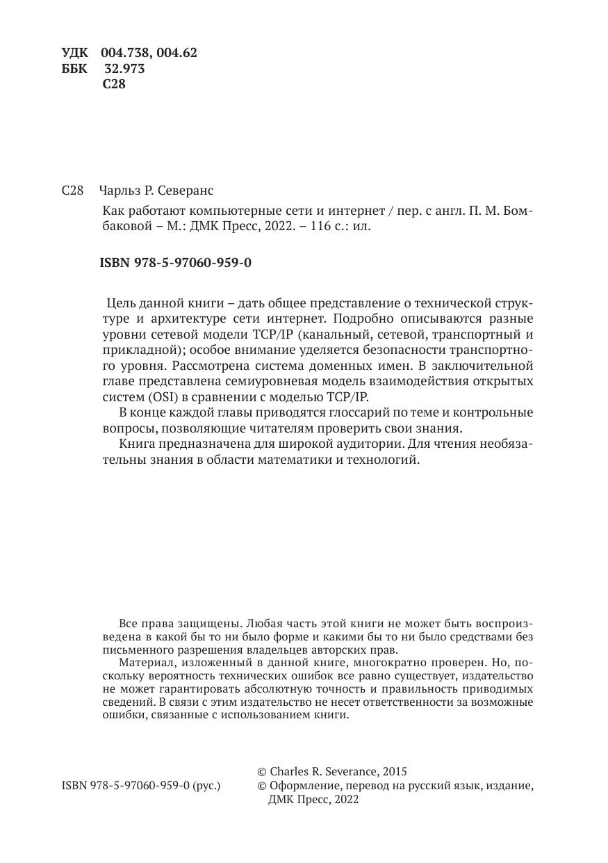 Технологии и протоколы, лежащие в основе интернет-связи, позволяют передавать данные между миллиардами устройств по всему миру. Эта книга снимает завесу тайны с удивительной архитектуры и протоколов, благодаря которым устройства могут обмениваться данными по сети. Несмотря на всю свою сложность, интернет фактически основан на нескольких относительно простых концепциях, с которыми может ознакомиться каждый желающий.