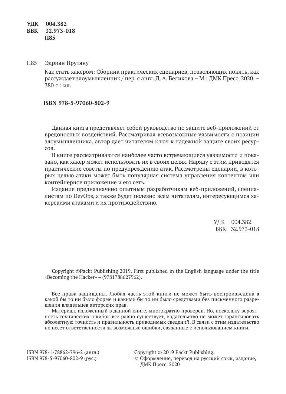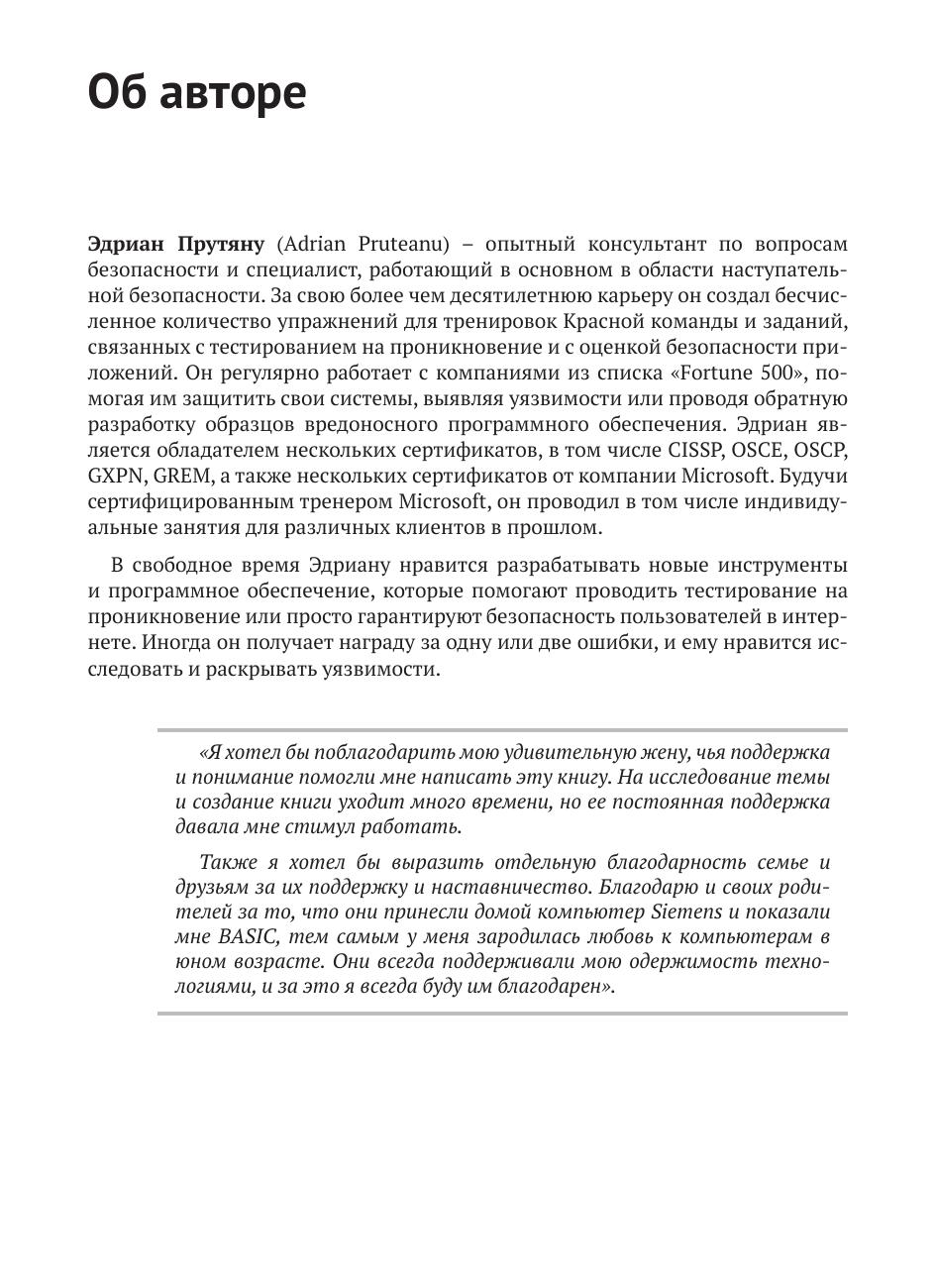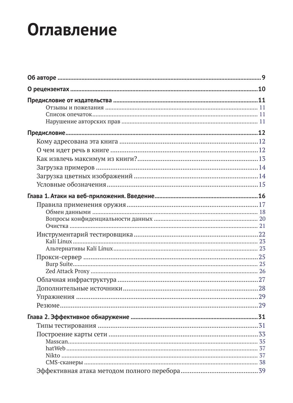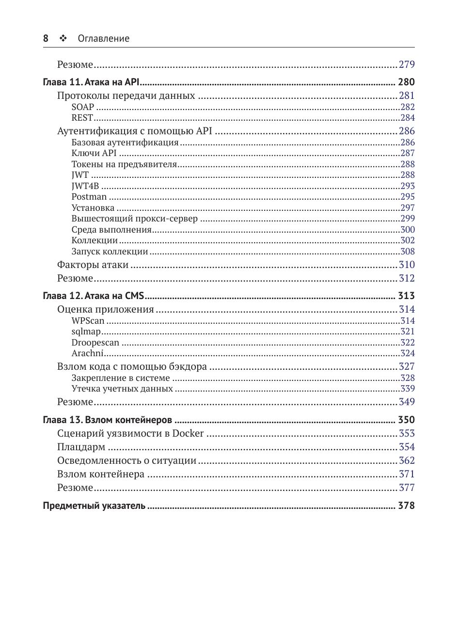 В первой части книги автор рассказывает о наиболее часто встречающихся уязвимостях и о том, как использовать их для достижения своей цели. Во второй части книги вы примените на практике освоенные только что методы. Рассмотрены сценарии, в которых целью атаки может быть популярная система управления контентом или контейнерное приложение и его сеть.