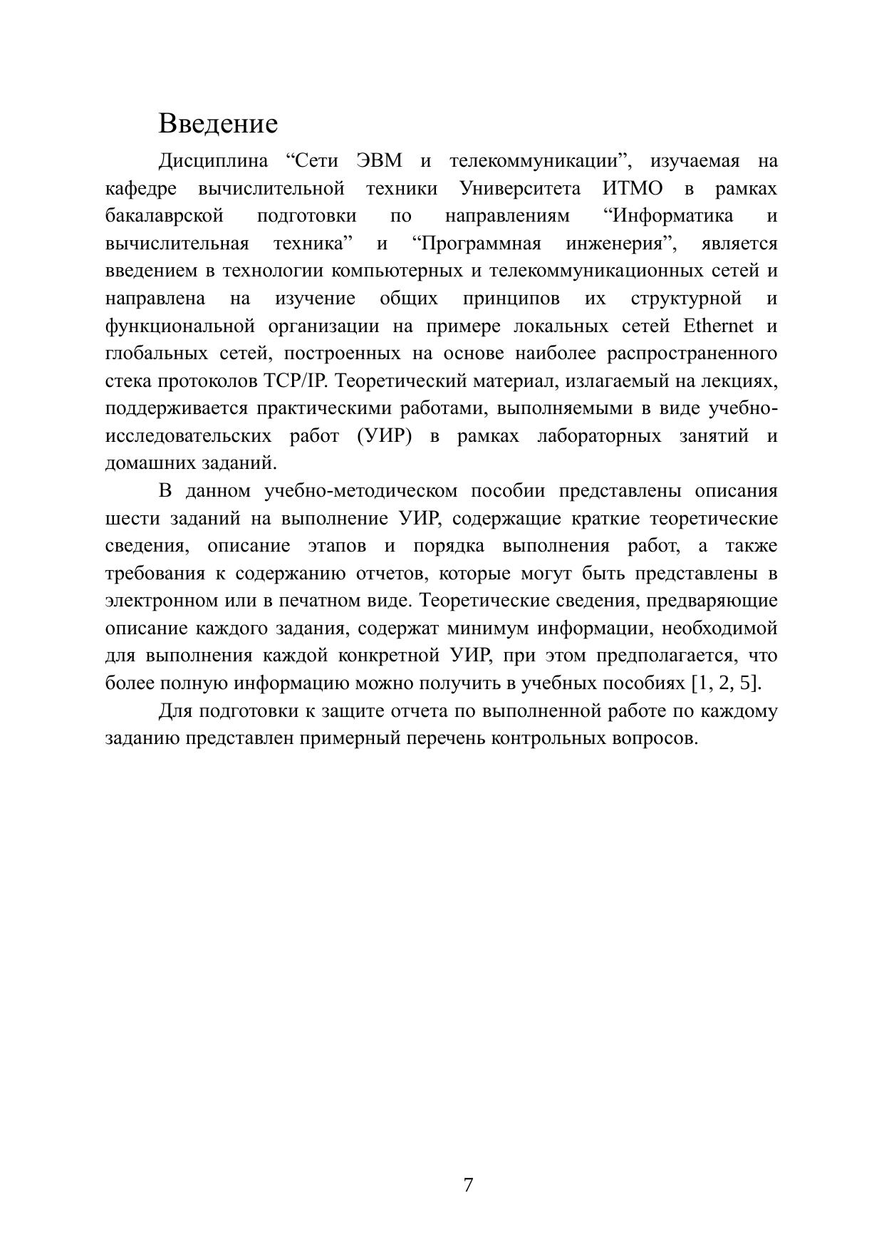 Пособие содержит описание учебно-исследовательских работ по дисциплине “Сети ЭВМ и телекоммуникации”, выполняемых в рамках лабораторных и практических занятий. По каждой работе приводятся краткие теоретические сведения, описываются этапы и порядок выполнения работы, перечислены требования к оформлению отчета и представлен краткий перечень контрольных вопросов.
