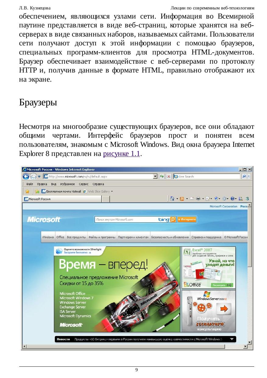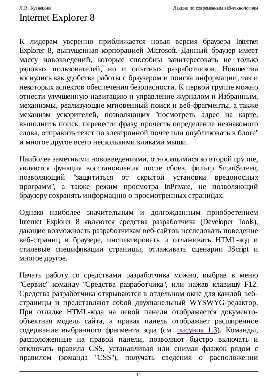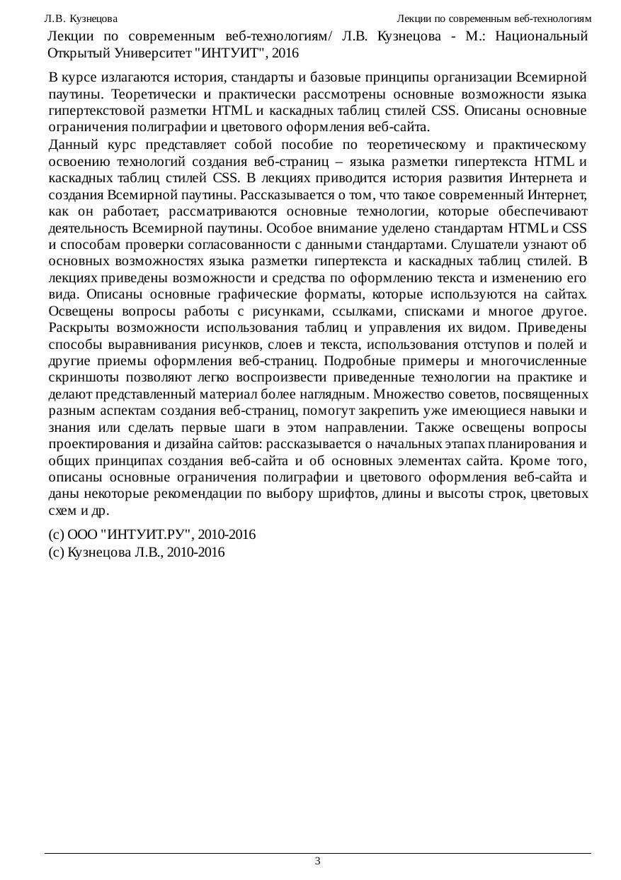 создания Всемирной паутины. Рассказывается о том, что такое современный Интернет, как он работает, рассматриваются основные технологии, которые обеспечивают деятельность Всемирной паутины. Особое внимание уделено стандартам HTML и CSS и способам проверки согласованности с данными стандартами. Слушатели узнают об основных возможностях языка разметки гипертекста и каскадных таблиц стилей. В лекциях приведены возможности и средства по оформлению текста и изменению его вида. Описаны основные графические форматы, которые используются на сайтах. Освещены вопросы работы с рисунками, ссылками, списками и многое другое. Раскрыты возможности использования таблиц и управления их видом. Приведены способы выравнивания рисунков, слоев и текста, использования отступов и полей и другие приемы оформления веб-страниц. Подробные примеры и многочисленные скриншоты позволяют легко воспроизвести приведенные технологии на практике и делают представленный материал более наглядным. Множество советов, посвященных разным аспектам создания веб-страниц, помогут закрепить уже имеющиеся навыки и